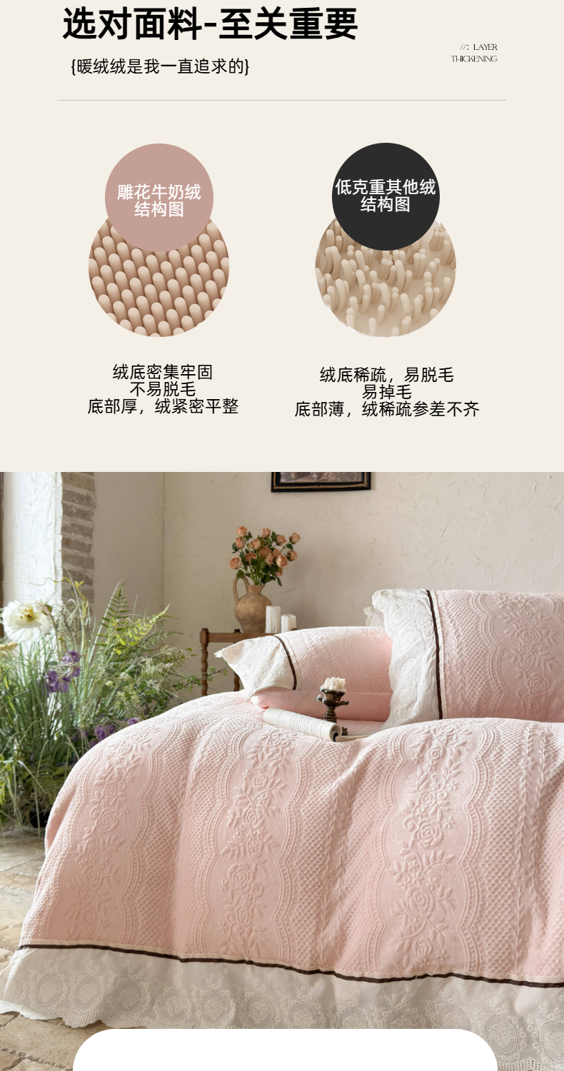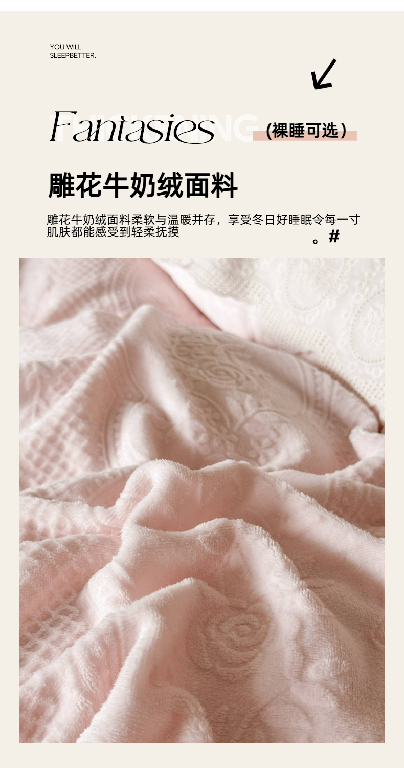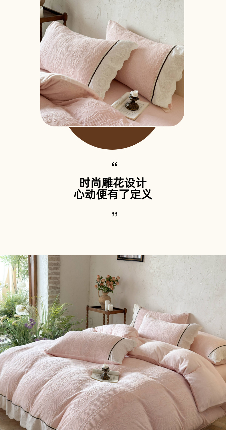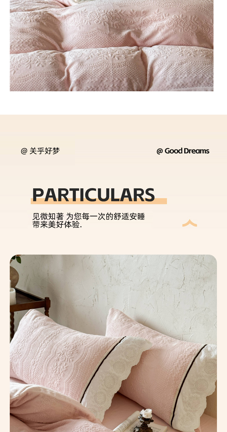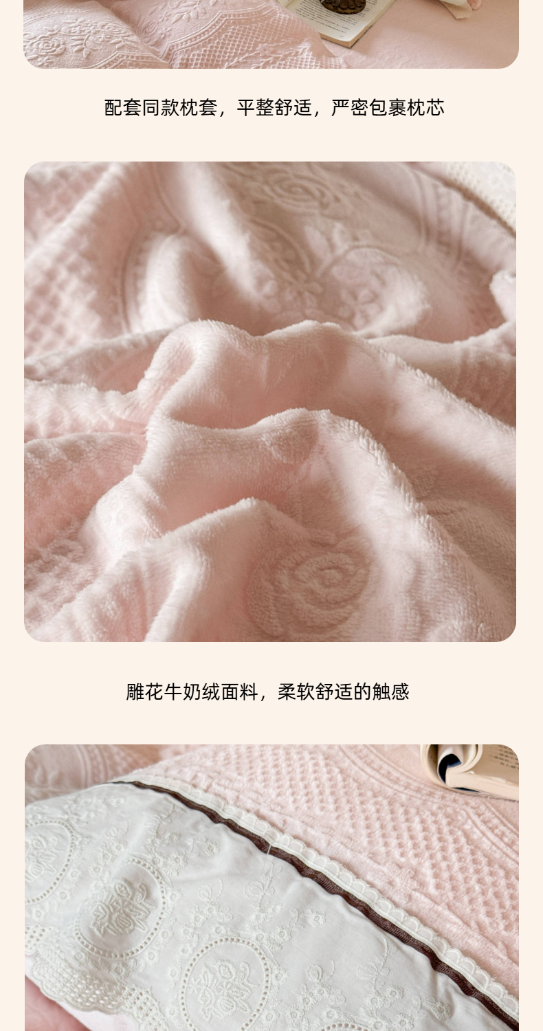 商品名称:纯优家纺 2025新款秋冬轻法式花边款雕花牛奶绒四件套-绮梦 绮梦-蜜桃粉