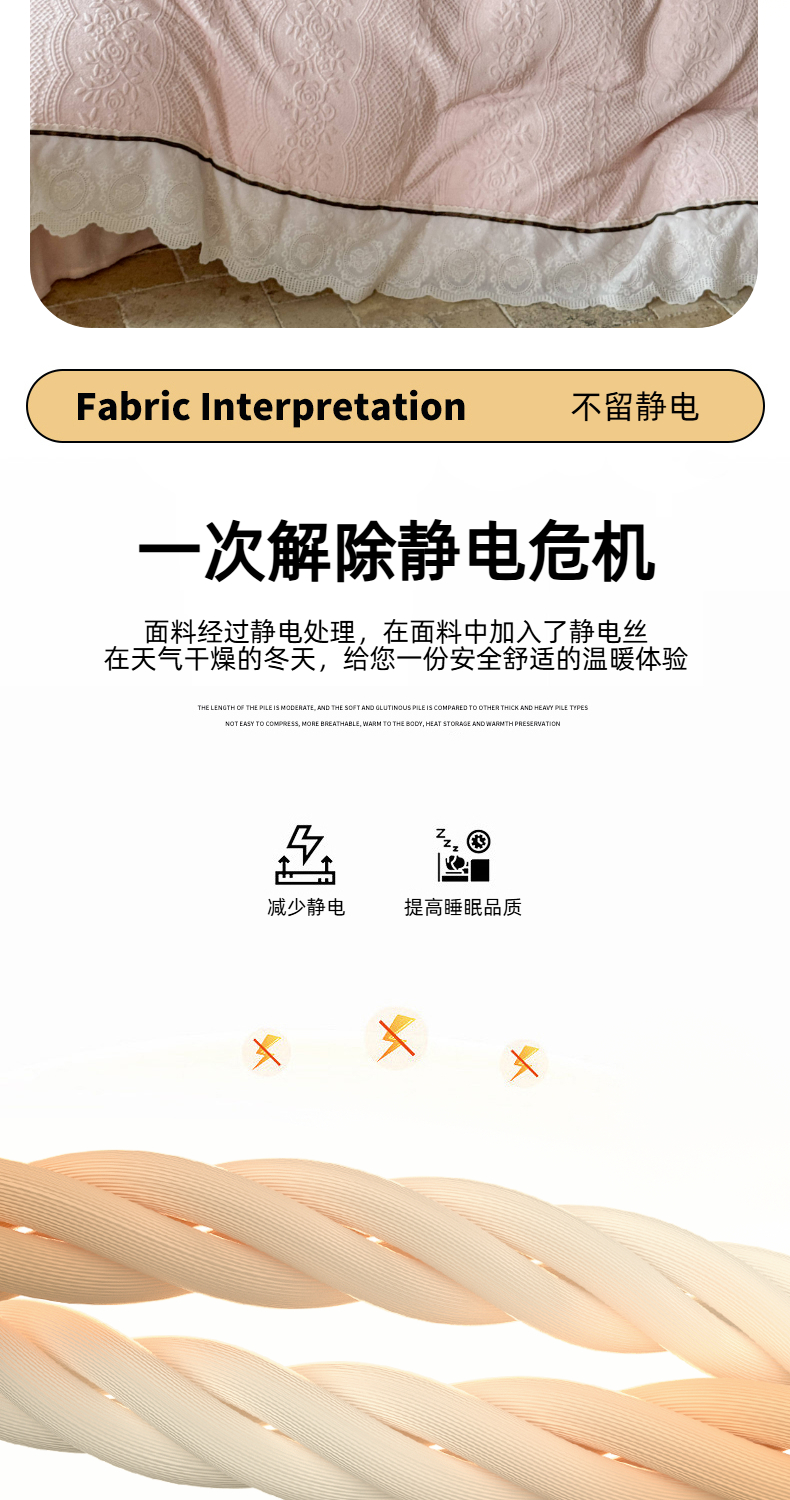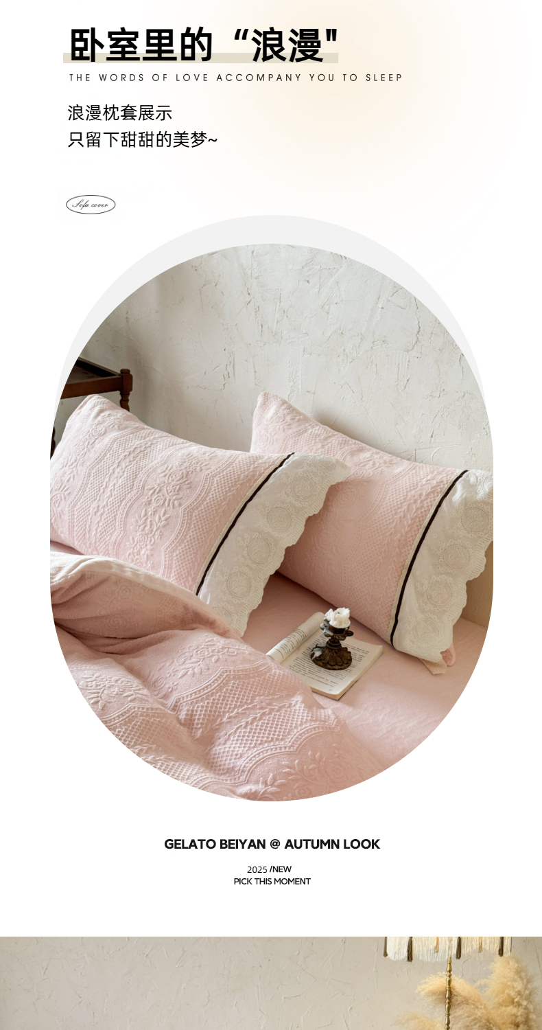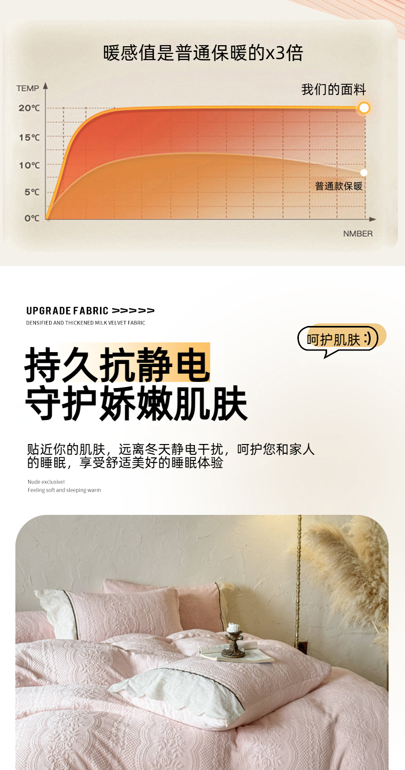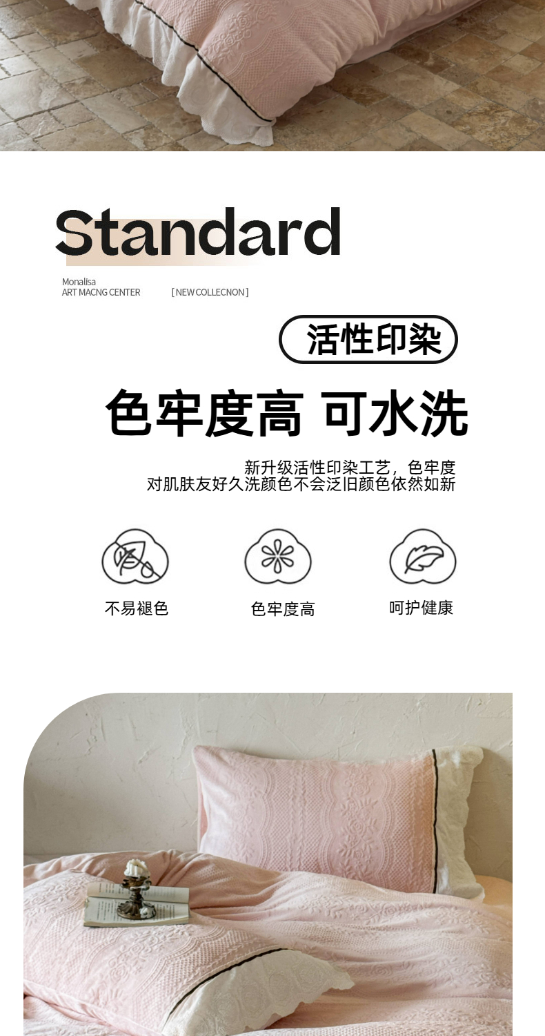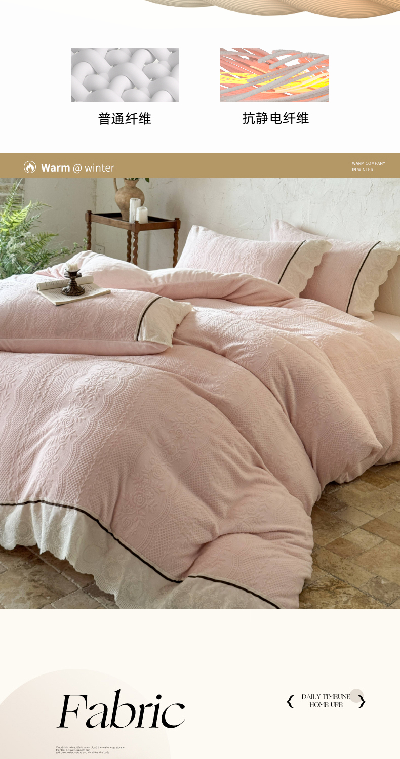 商品名称:纯优家纺 2025新款秋冬轻法式花边款雕花牛奶绒四件套-绮梦 绮梦-蜜桃粉