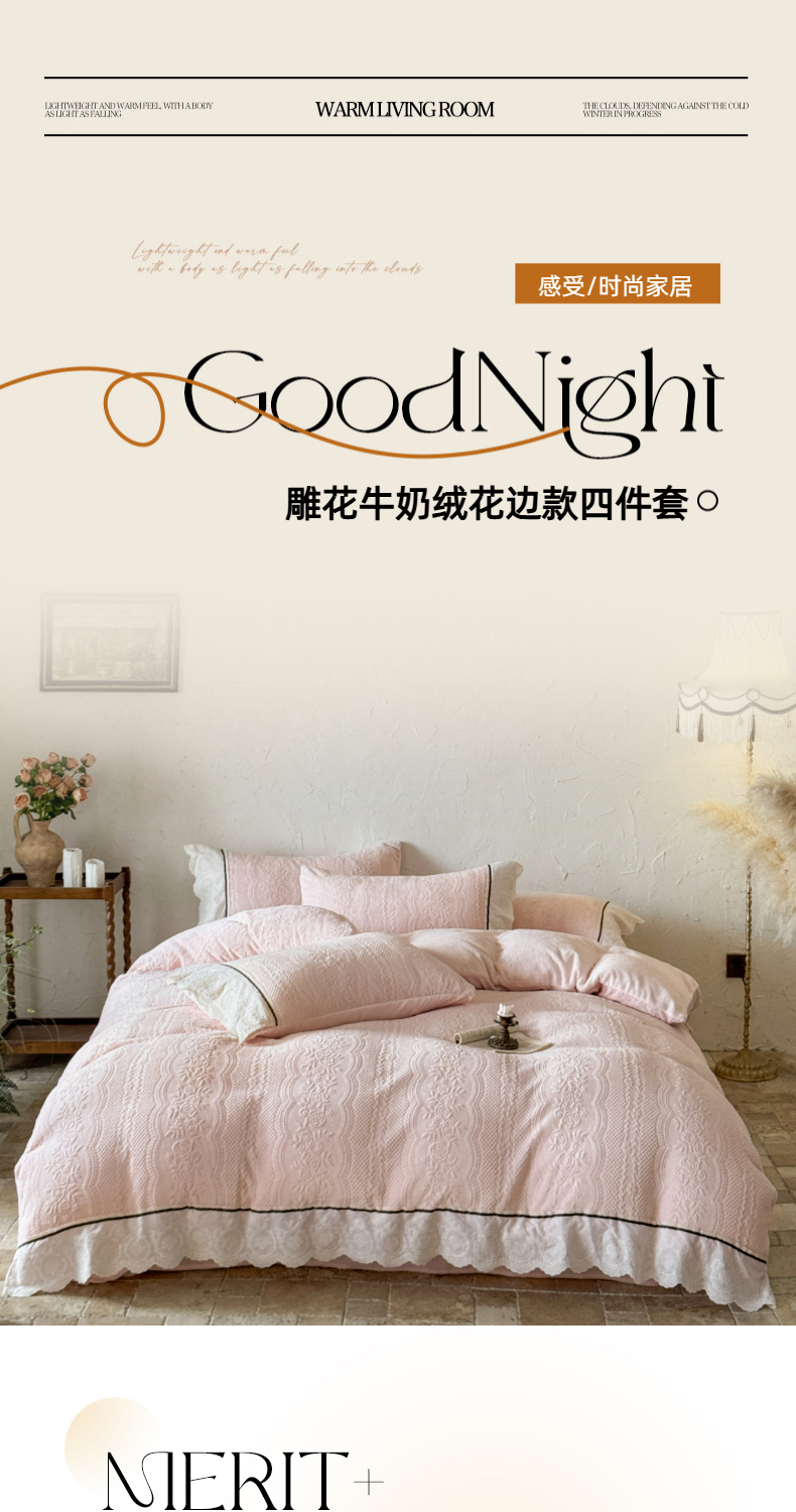 纯优家纺 2025新款秋冬轻法式花边款雕花牛奶绒四件套-绮梦 绮梦-蜜桃粉