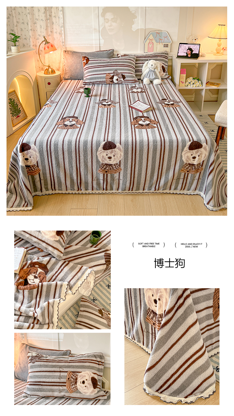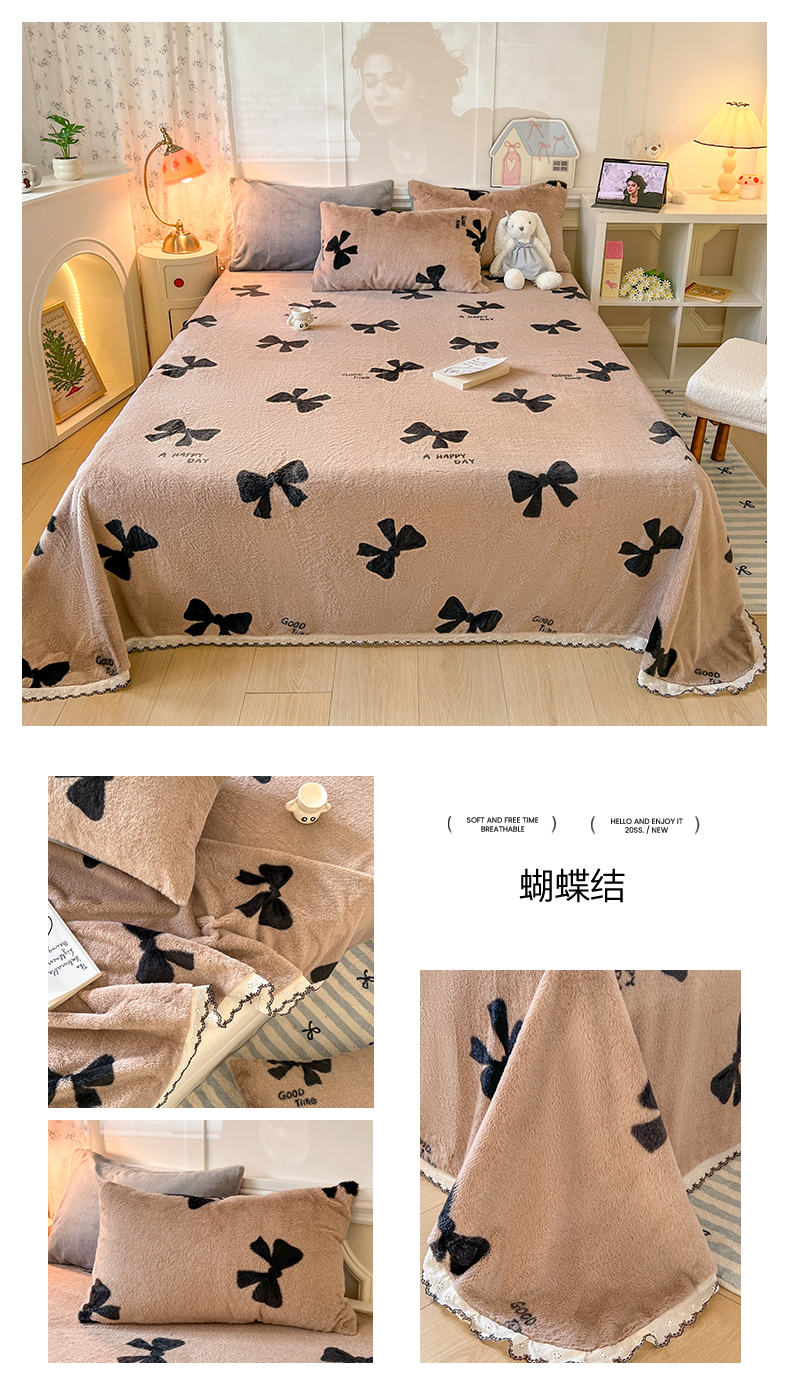 (总)妖妖家纺 2025新款高克重兔毛花边印花单床单 床单单件,爱心,斑点狗,斑点蝴蝶,豹纹,博士狗,蝴蝶飞舞,蝴蝶结,开心熊,狸猫纹,墨痕,木星纹,淘气猫,甜甜兔,枝繁叶茂