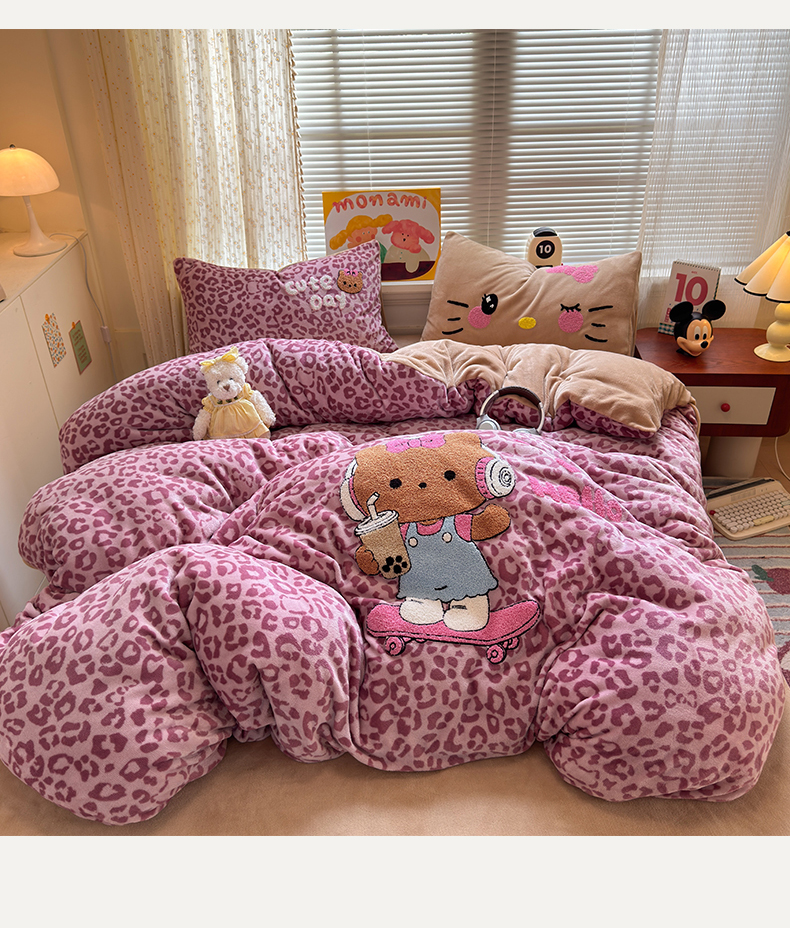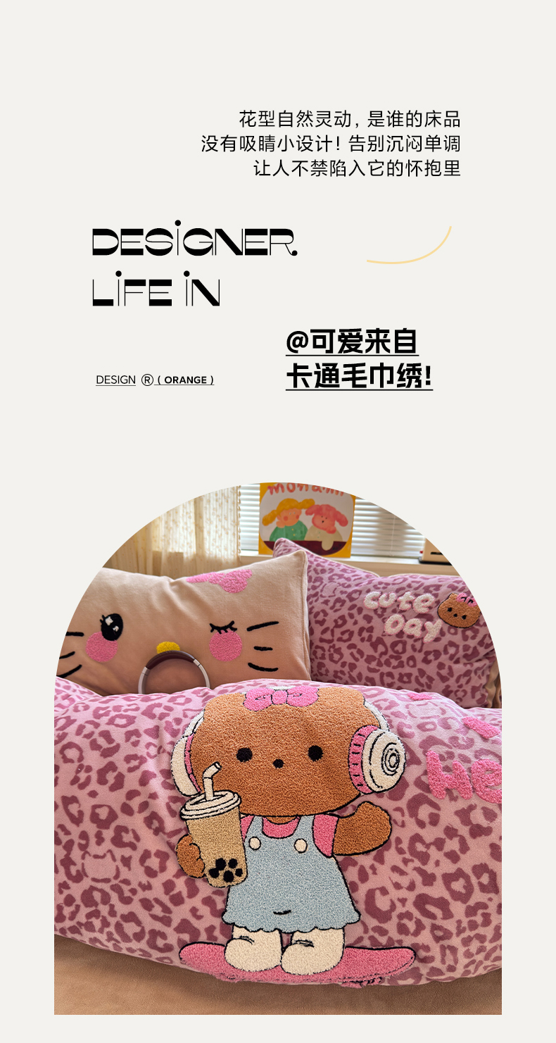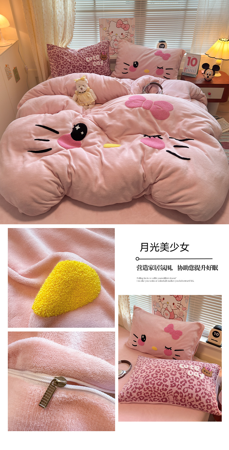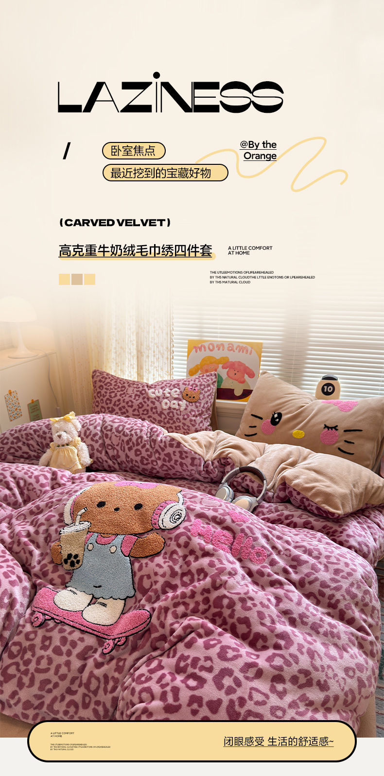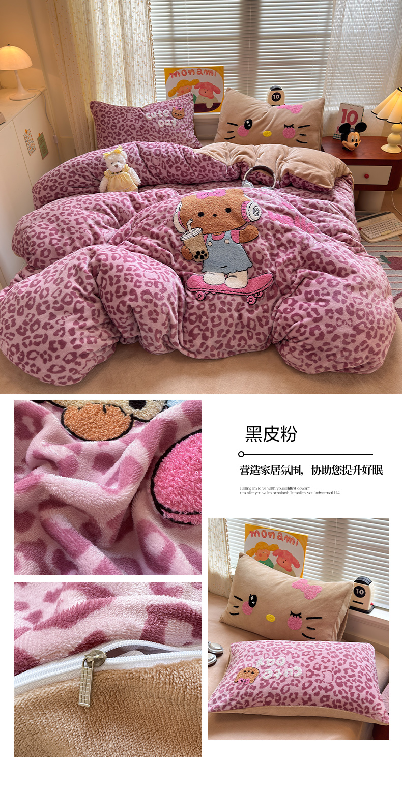 当前位置: 91家纺网 > 商品网购 > 床品套件 > 四件套 > 牛奶绒四件套 > 罗亿家纺 2025新款高克重200g牛奶绒数码印花毛巾绣卡通四件套 黑皮粉