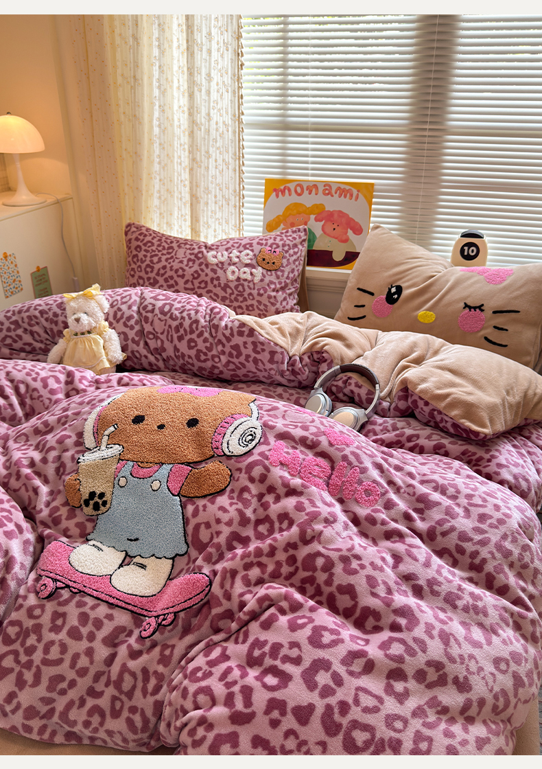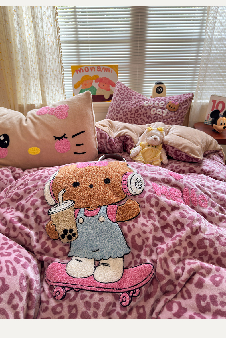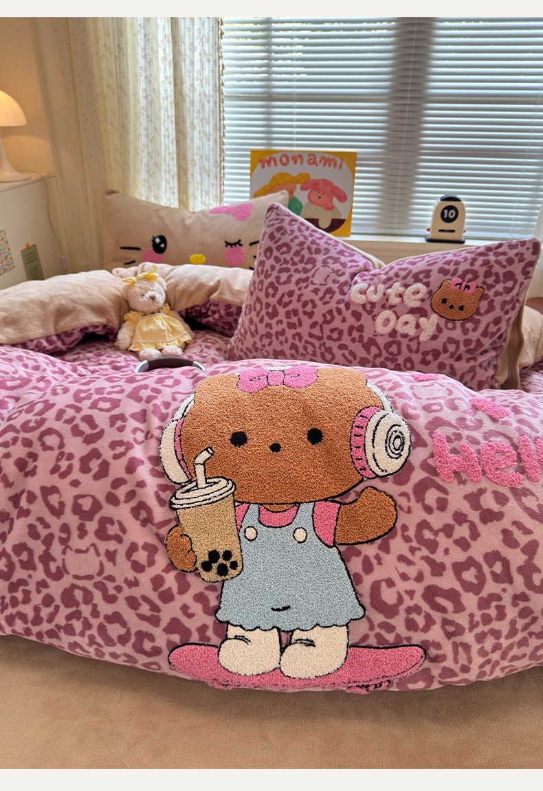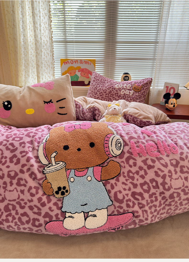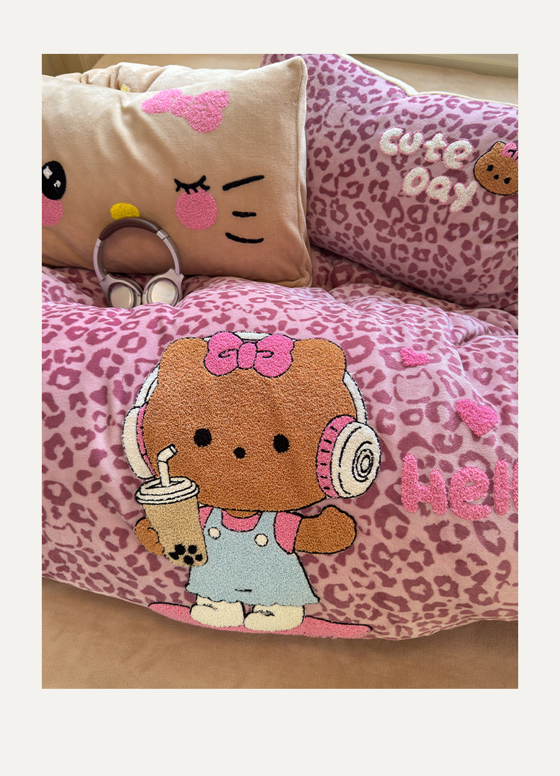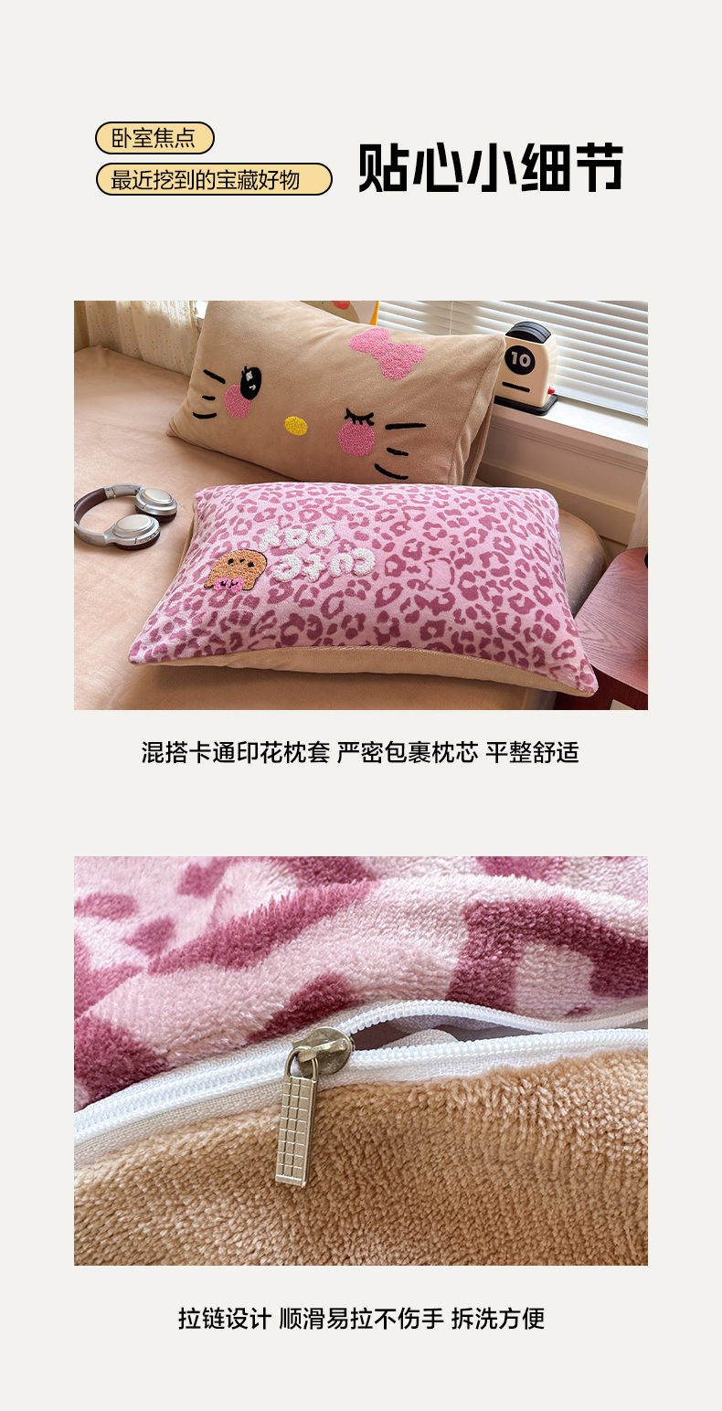当前位置: 91家纺网 > 商品网购 > 床品套件 > 四件套 > 牛奶绒四件套 > 罗亿家纺 2025新款高克重200g牛奶绒数码印花毛巾绣卡通四件套 黑皮粉