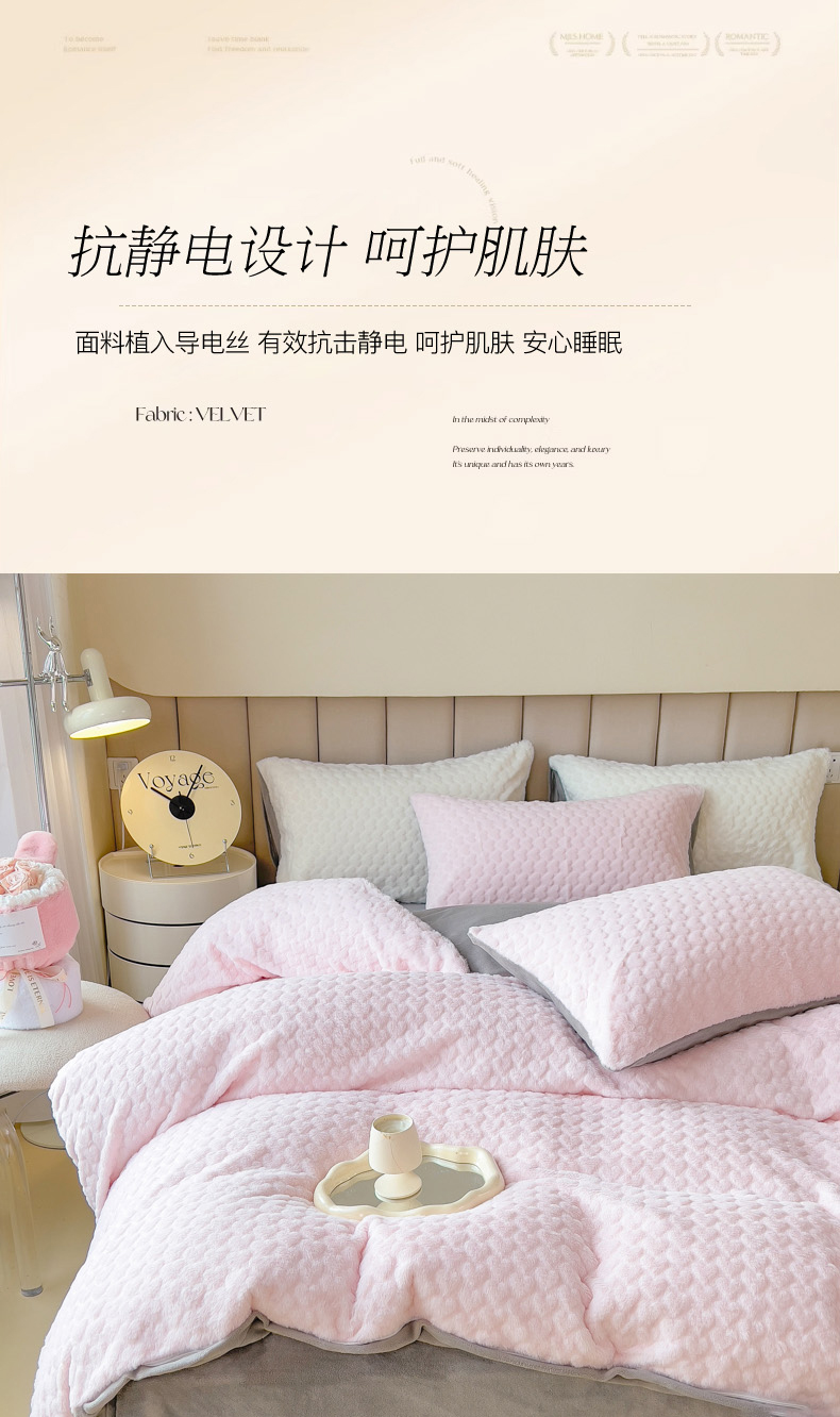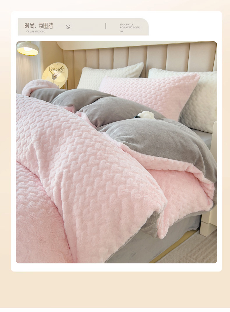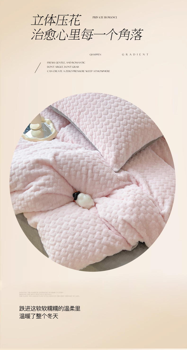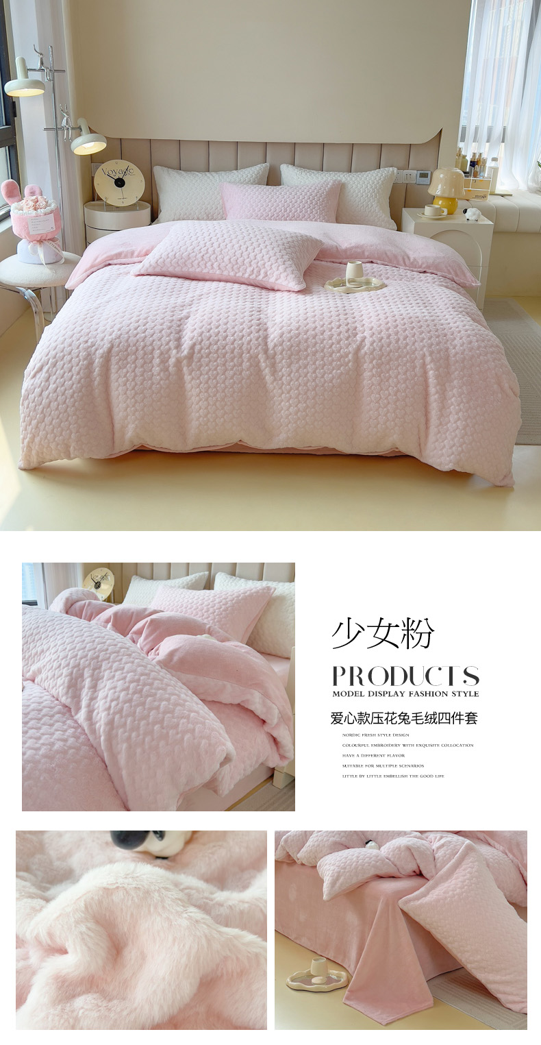 当前位置: 91家纺网 > 商品网购 > 床品套件 > 四件套 > 兔毛绒四件套 > 印季家纺 2025新款爱心款压花兔毛绒四件套 少女粉-灰