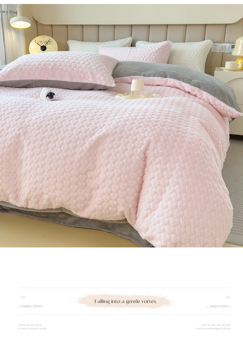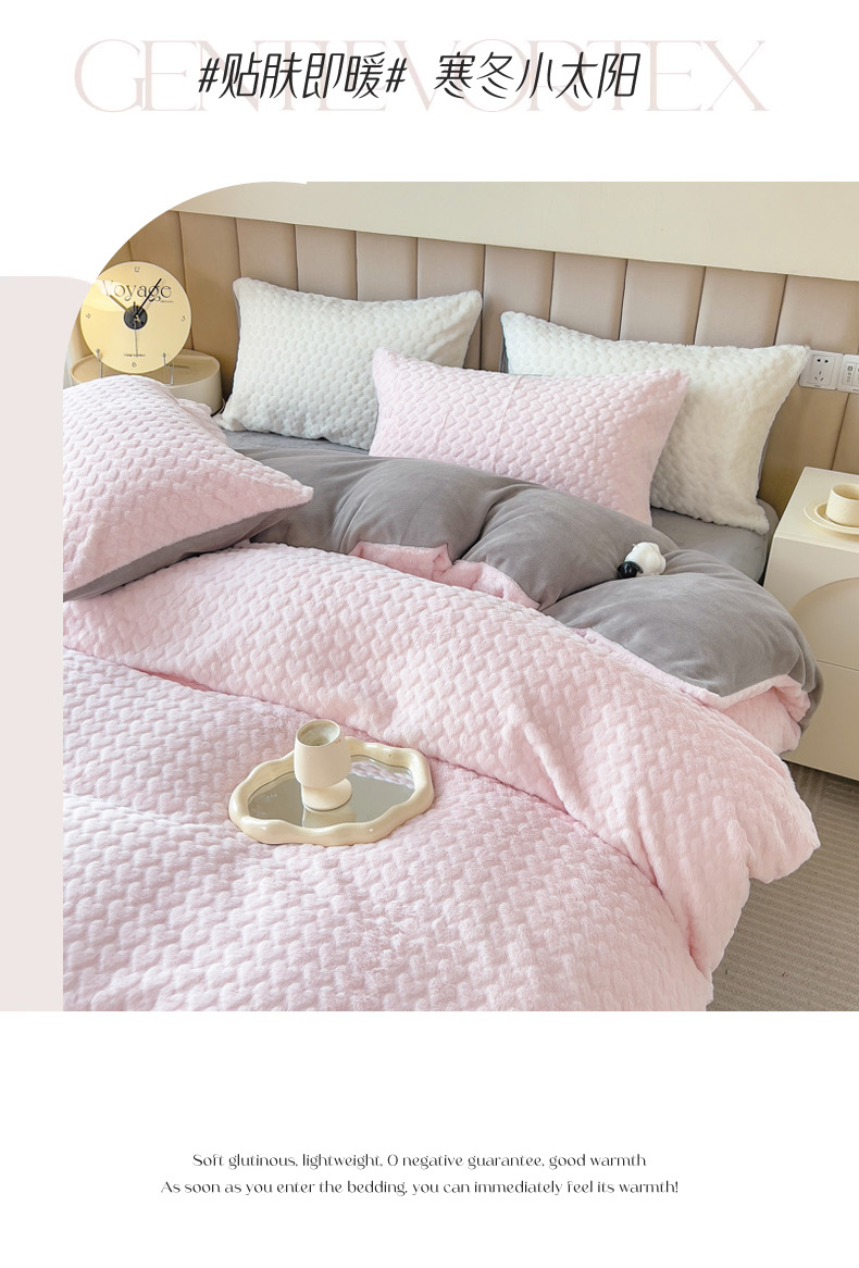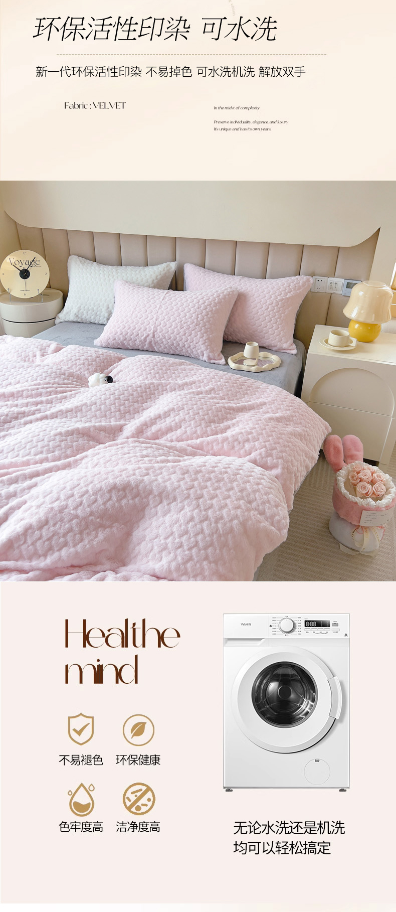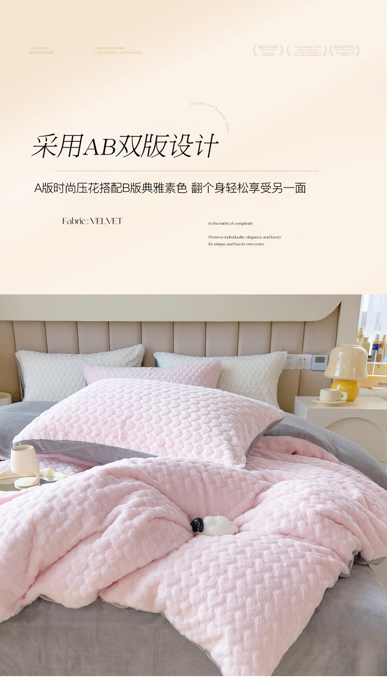 当前位置: 91家纺网 > 商品网购 > 床品套件 > 四件套 > 兔毛绒四件套 > 印季家纺 2025新款爱心款压花兔毛绒四件套 少女粉-灰