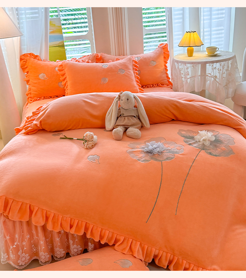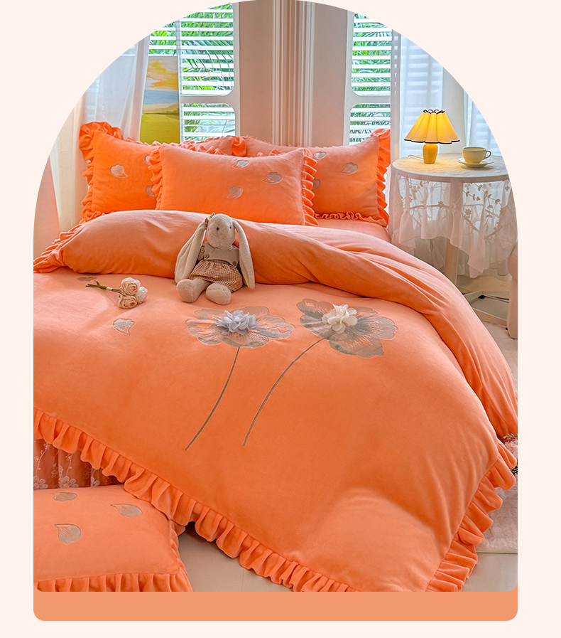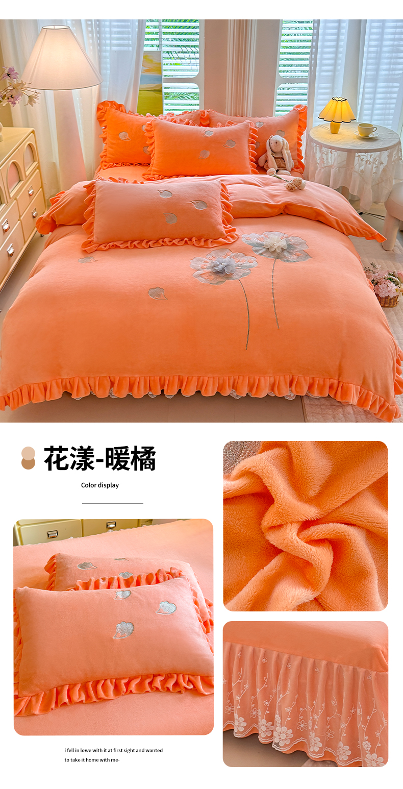 商品名称:唐人居 2025新款加厚牛奶绒立体绣花四件套-花漾 花漾-暖橘