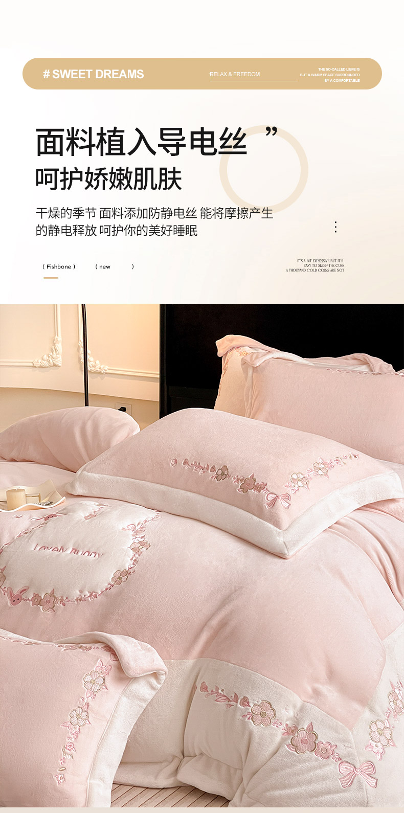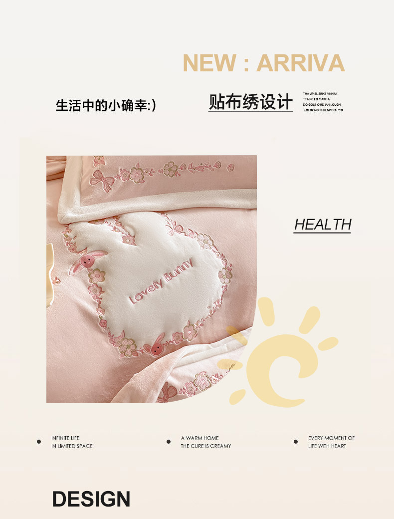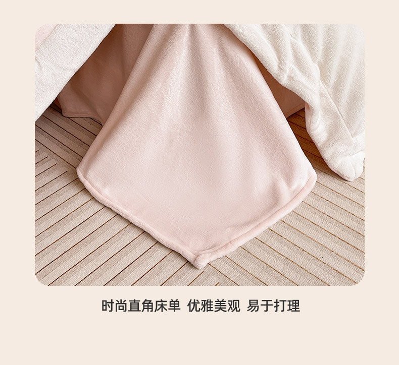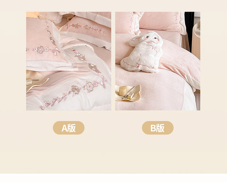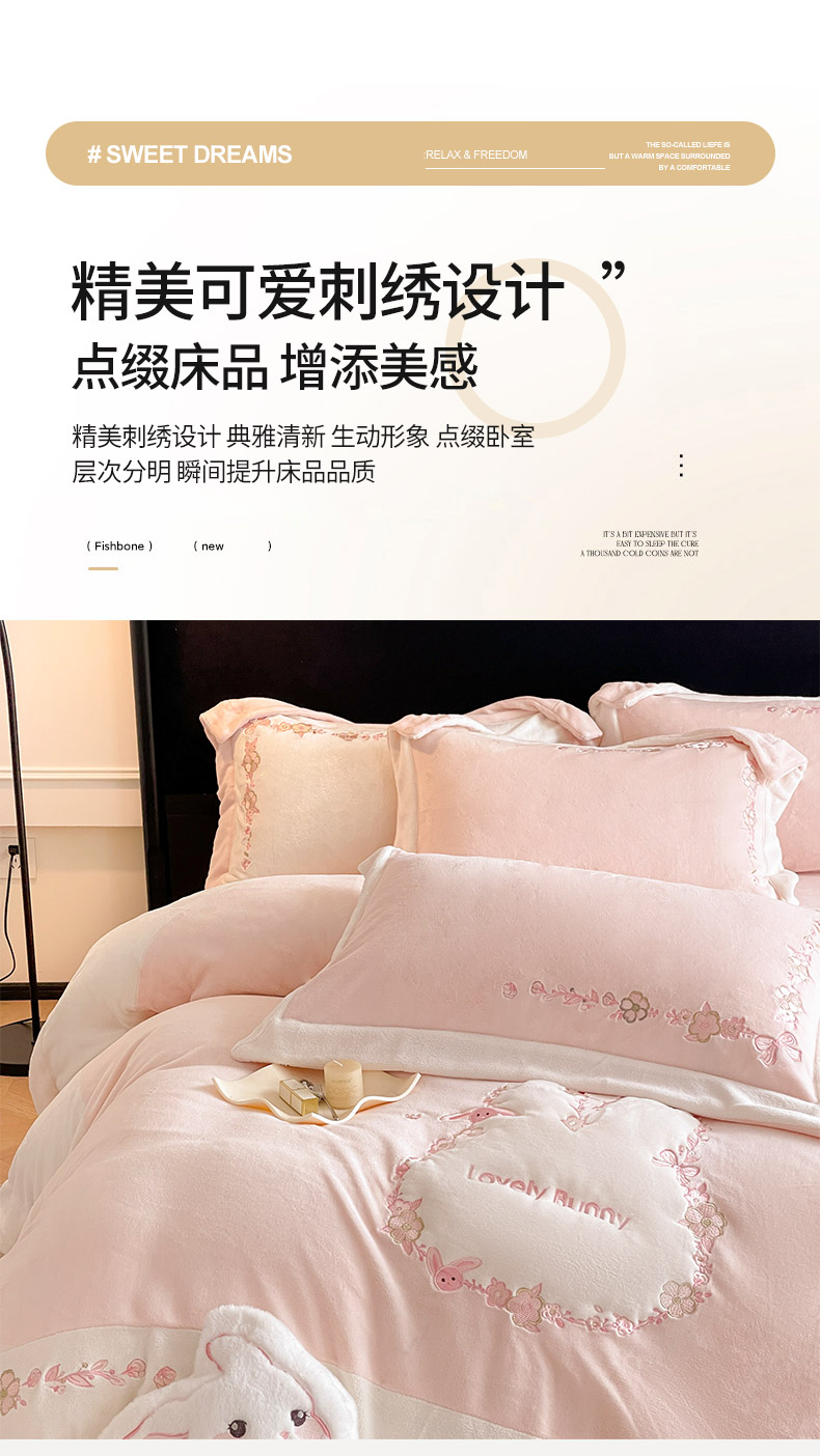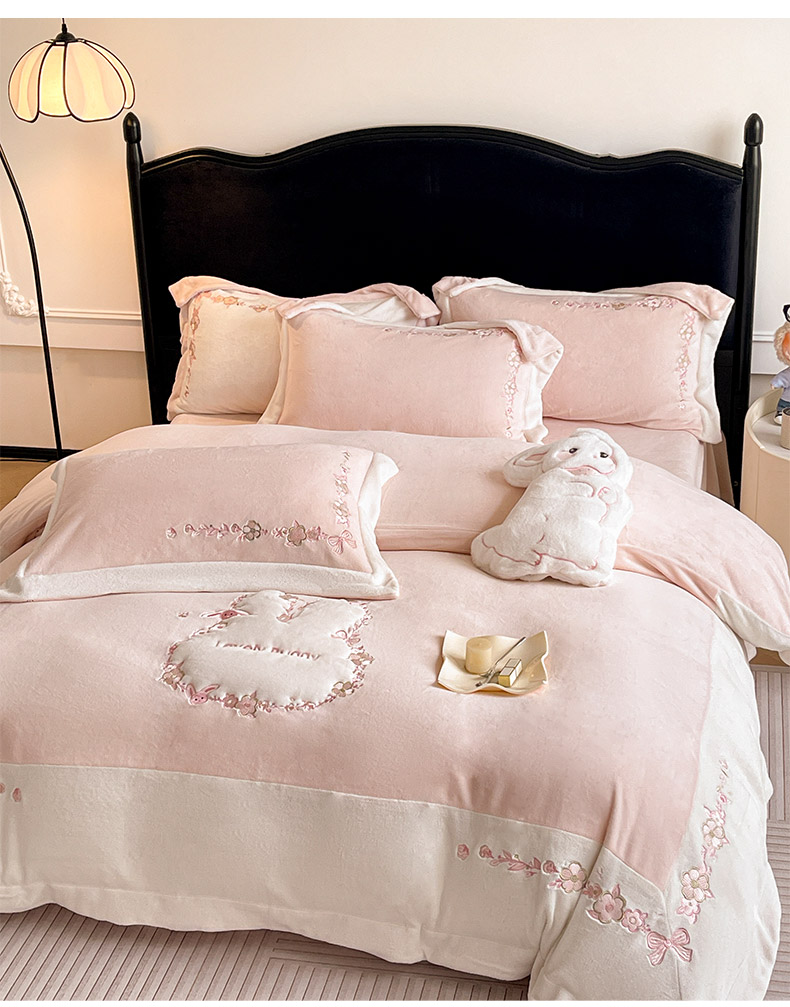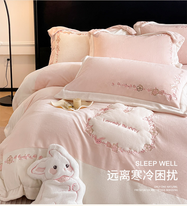 商品名称:2025直播爆款A类加厚牛奶绒四件套保暖双面加绒珊瑚绒重工刺绣被套床单冬季床上用品 妮可兔-粉白