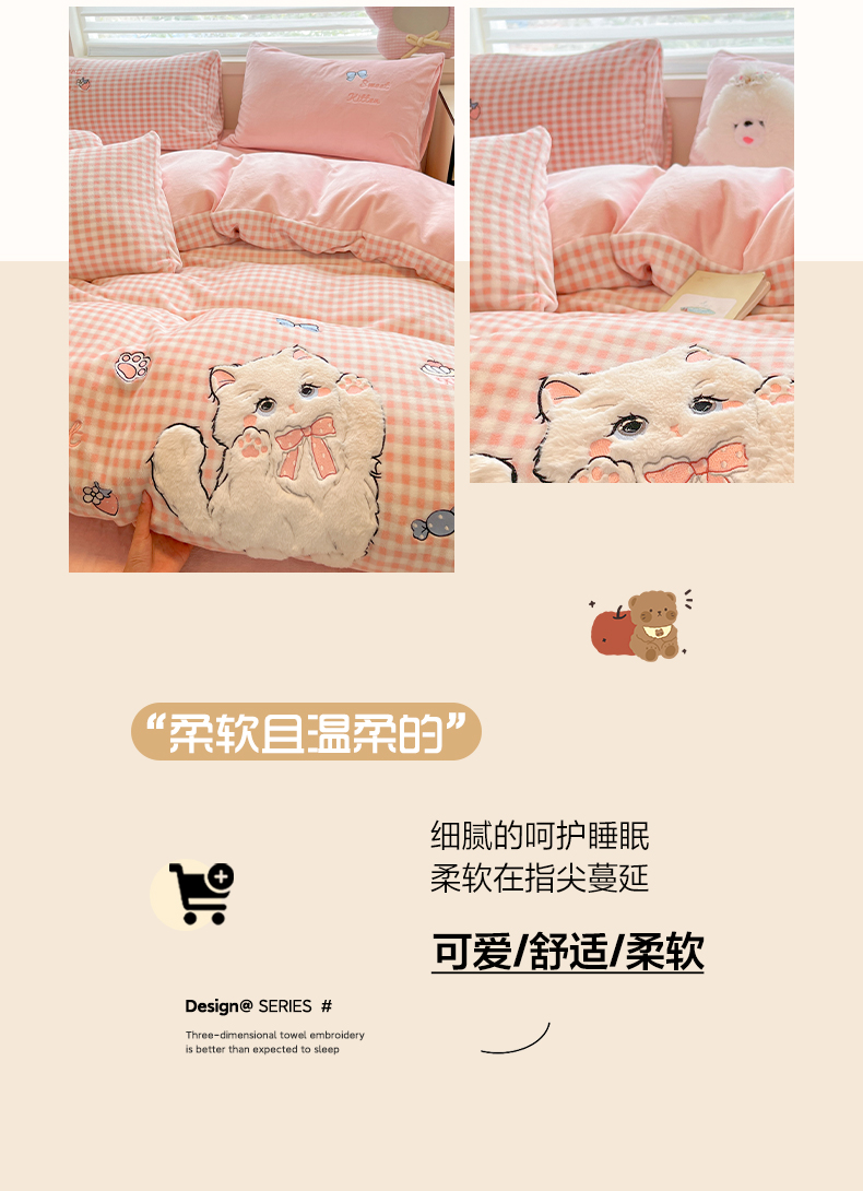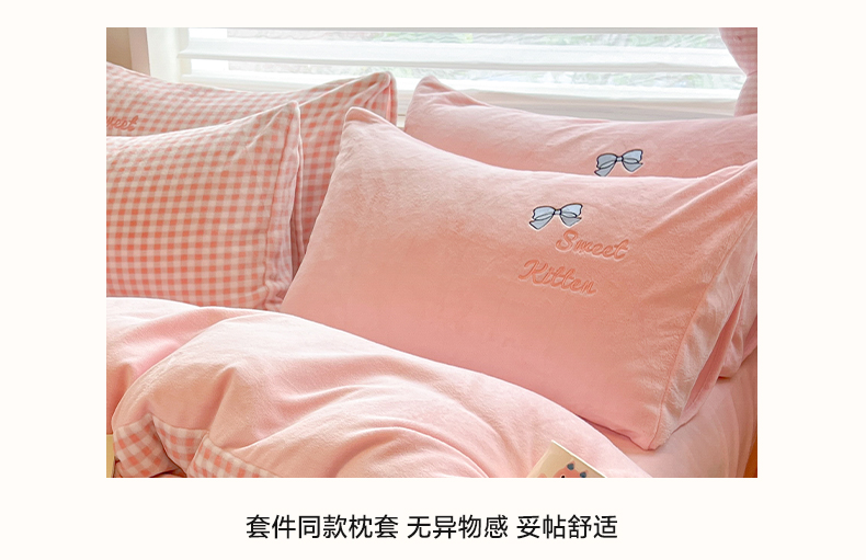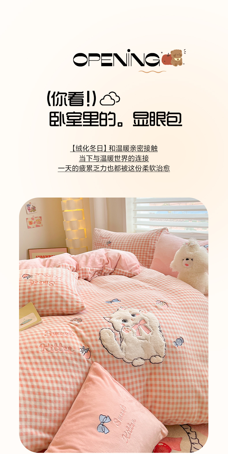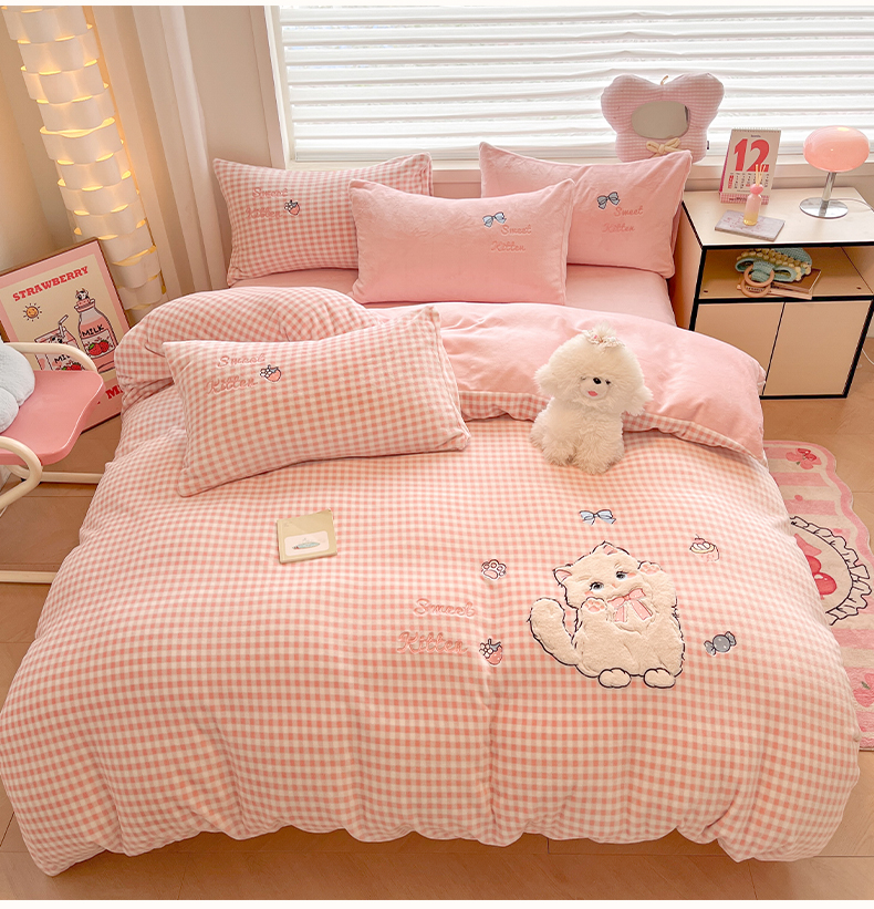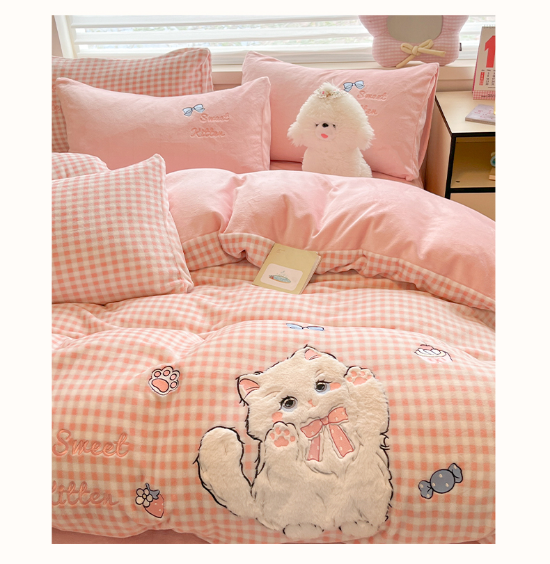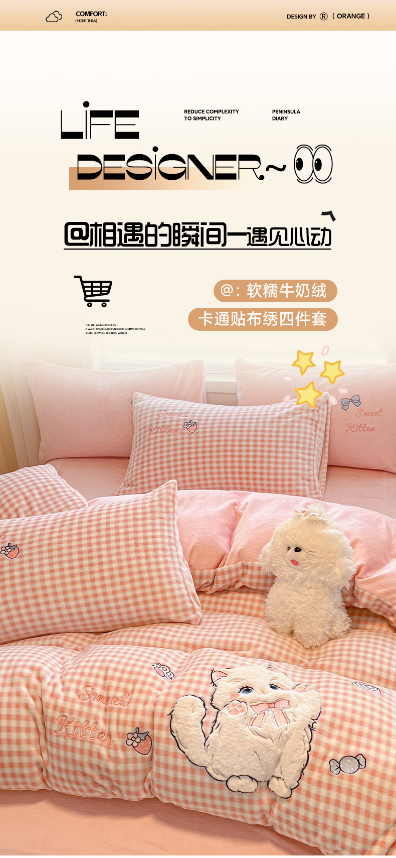 当前位置: 91家纺网 > 商品网购 > 床品套件 > 四件套 > 牛奶绒四件套 > 如一 2025新款高克重卡通贴布绣牛奶绒四件套 粉格猫