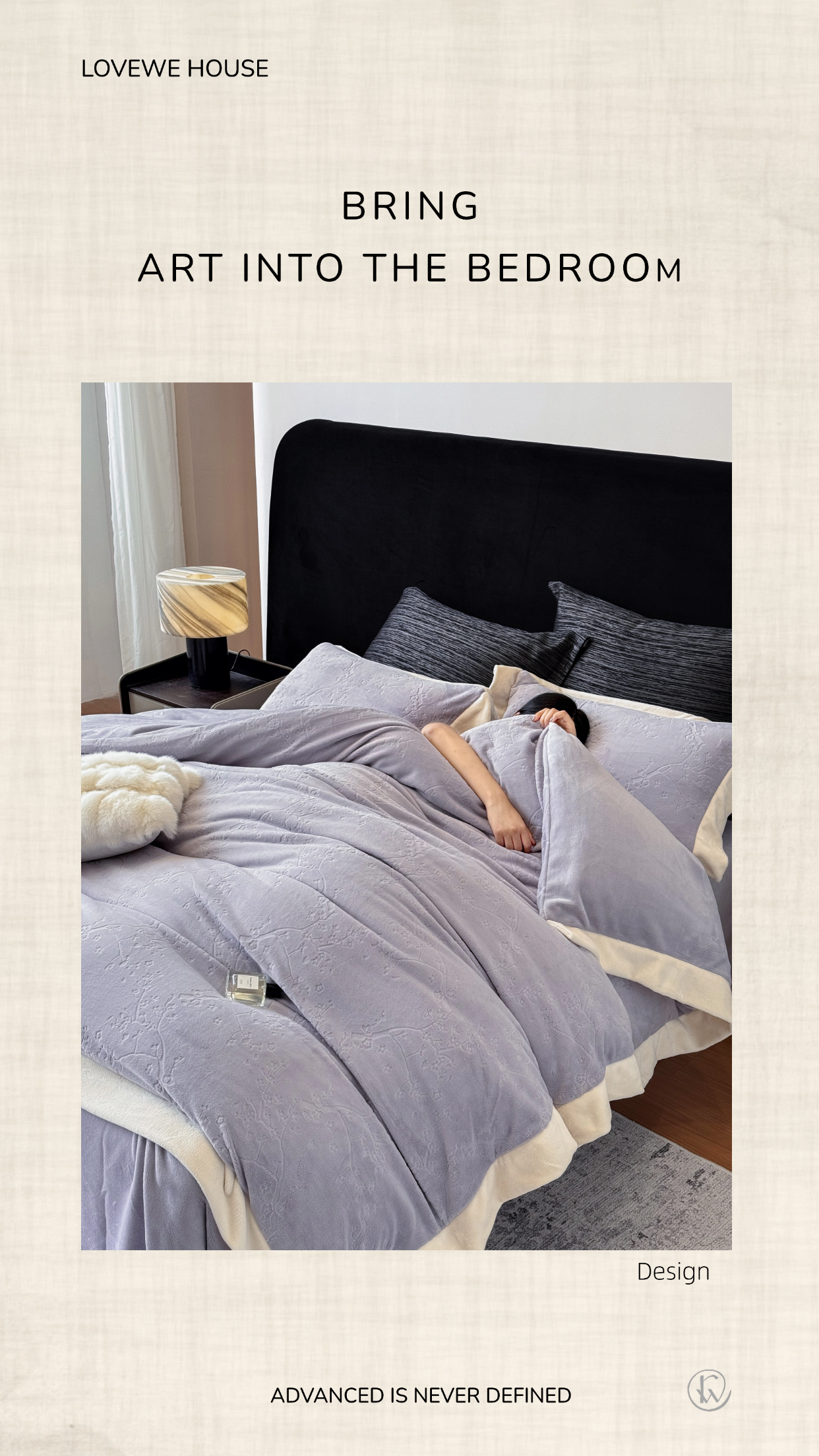 商品名称:若未家居 LOVEWE HOUSE 2025新款250克高克重全消光雕花牛奶绒拼角工艺款四件套-桃林春晓 控价券后不低于298 紫