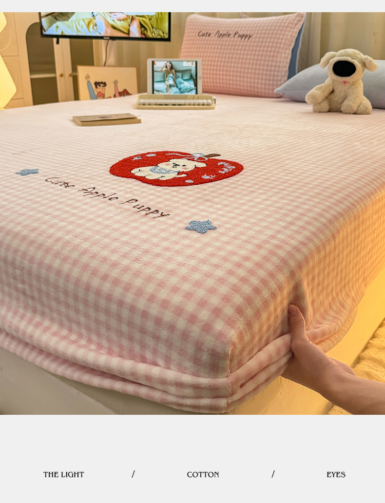 灰鲸 2025新款高克重牛奶绒毛巾绣床笠单床笠单品床笠床笠单件 粉格苹果狗