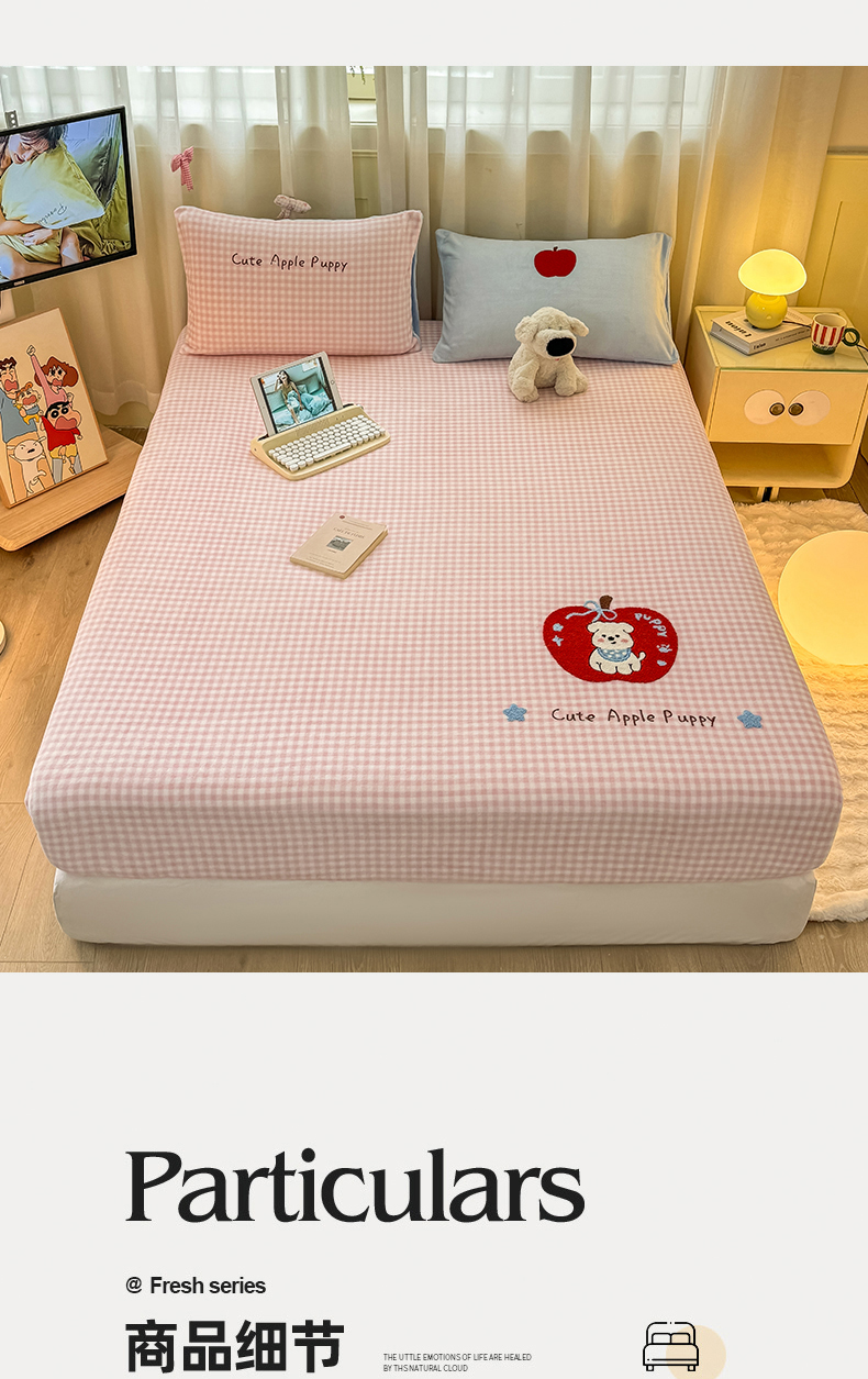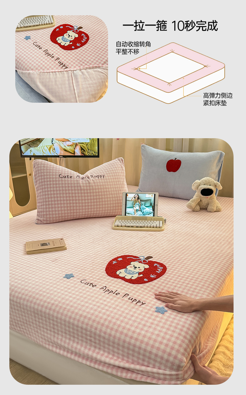 • 91家纺网 家纺一手货源 找家纺 灰鲸 2025新款高克重牛奶绒毛巾绣床笠单床笠单品床笠床笠单件 粉格苹果狗
