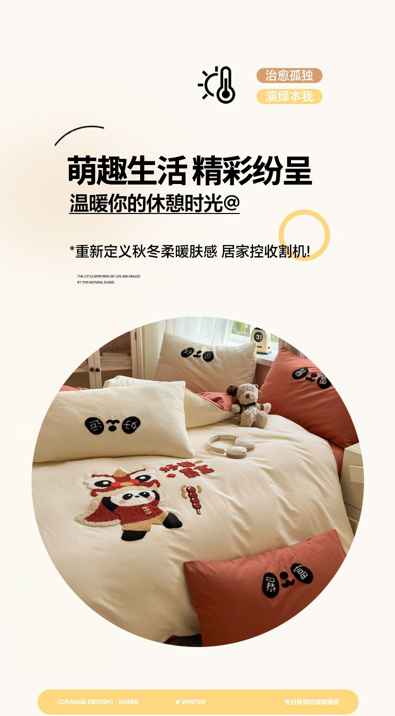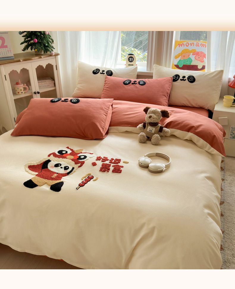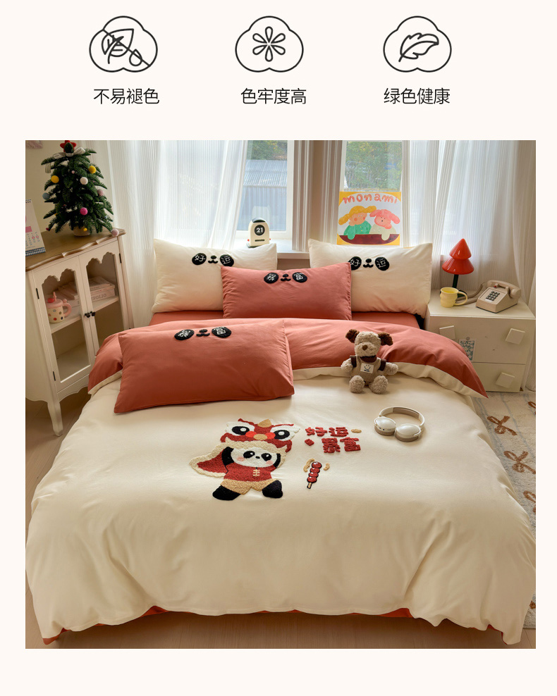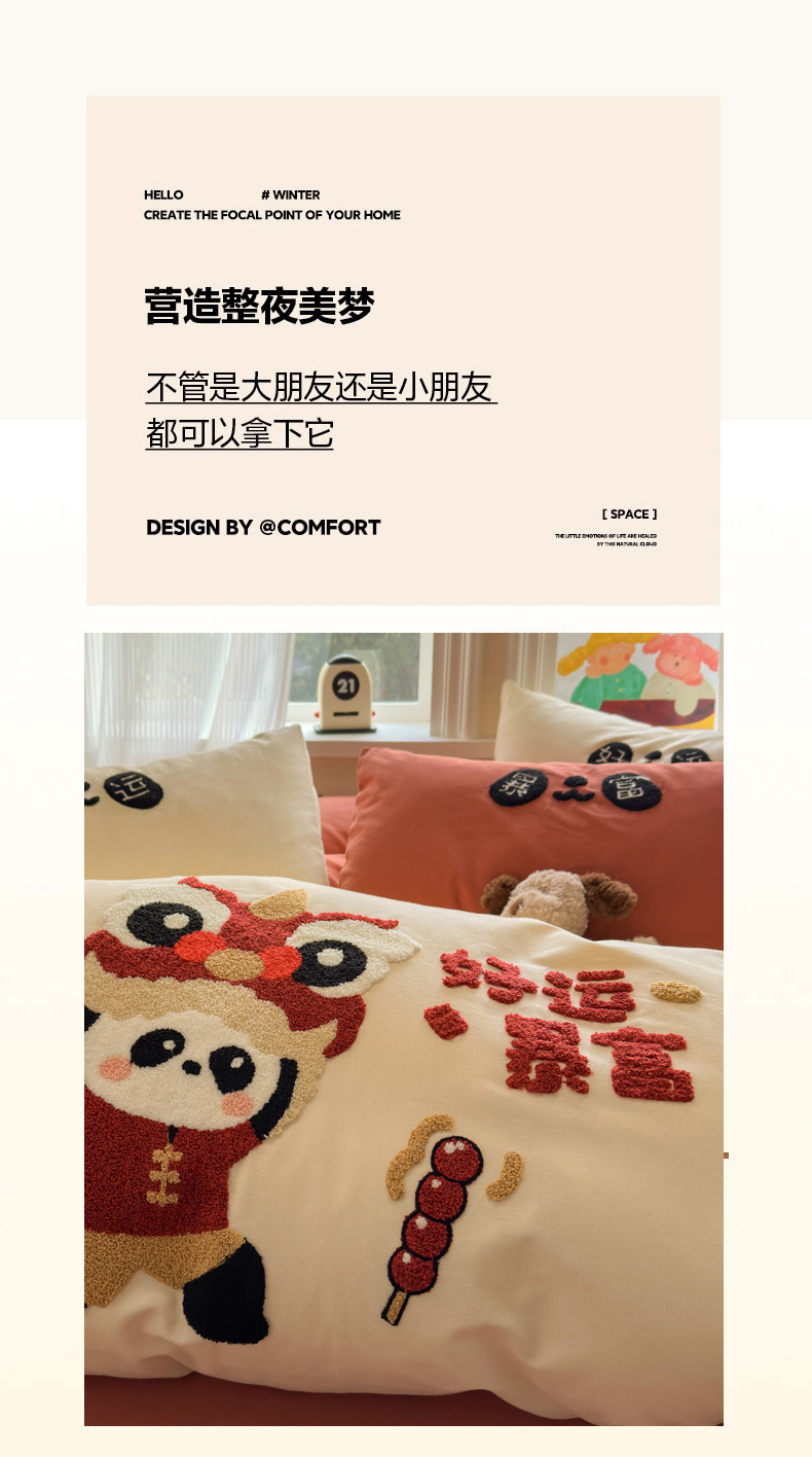 当前位置: 91家纺网 > 商品网购 > 床品套件 > 四件套 > 全棉普通四件套 > 如意朵 2025新款全棉加厚磨毛绣花四件套风格二(专版花型) 狮来运转