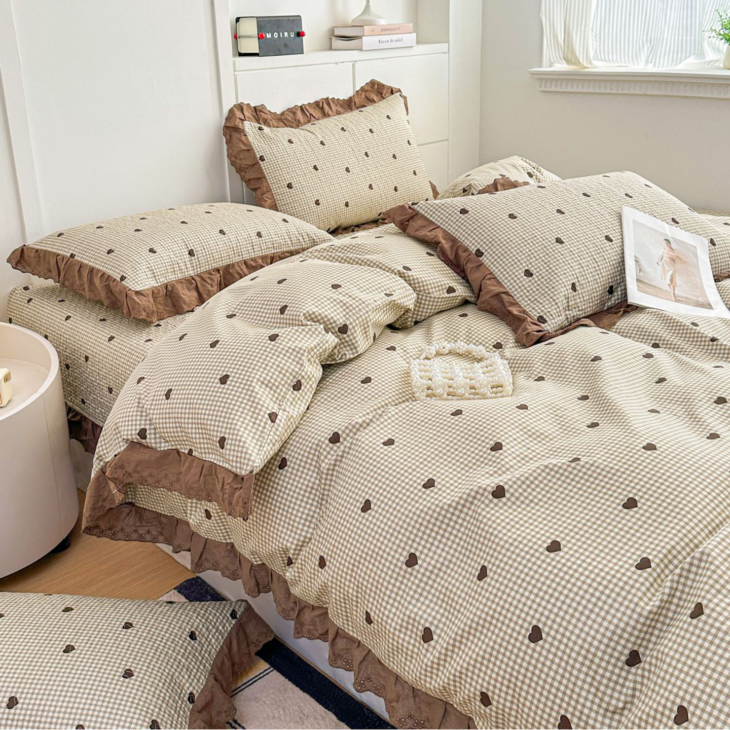 暖居 2026新款支持定制法式花边纯棉榻榻米四件套全棉大炕盖三件套四季通用 浅咖