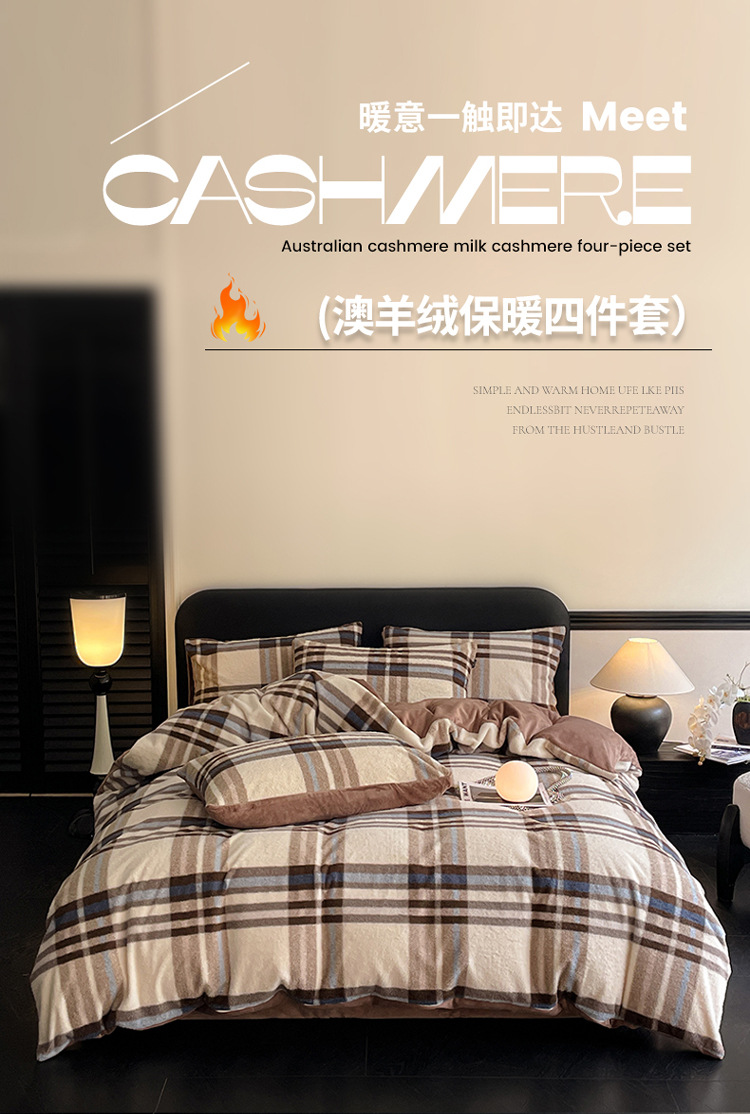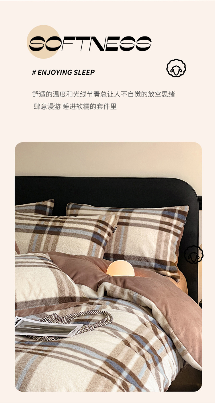良品汇馆 2026新款羊绒牛奶绒床上四件套加厚加绒床品保暖毛绒床品 咖啡白格