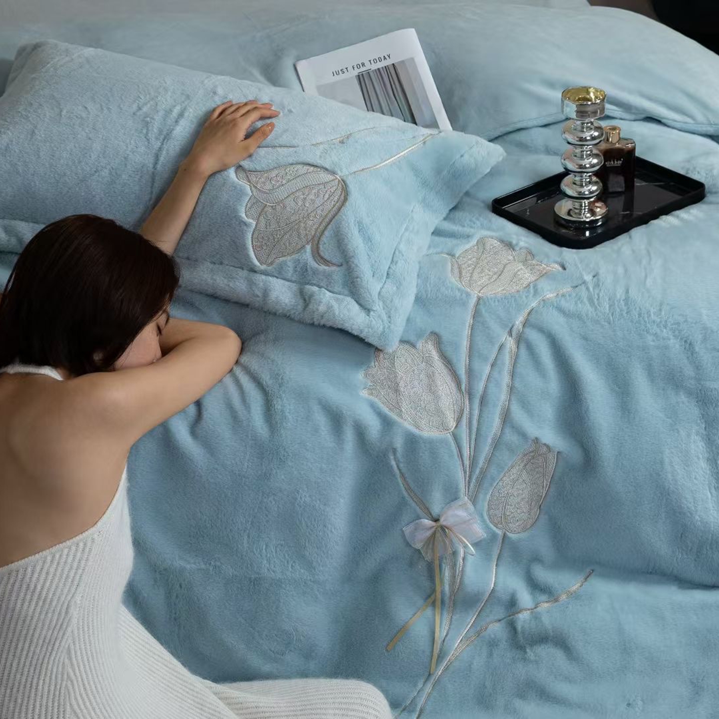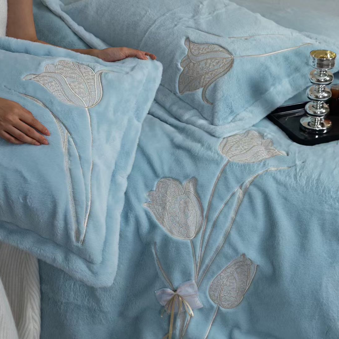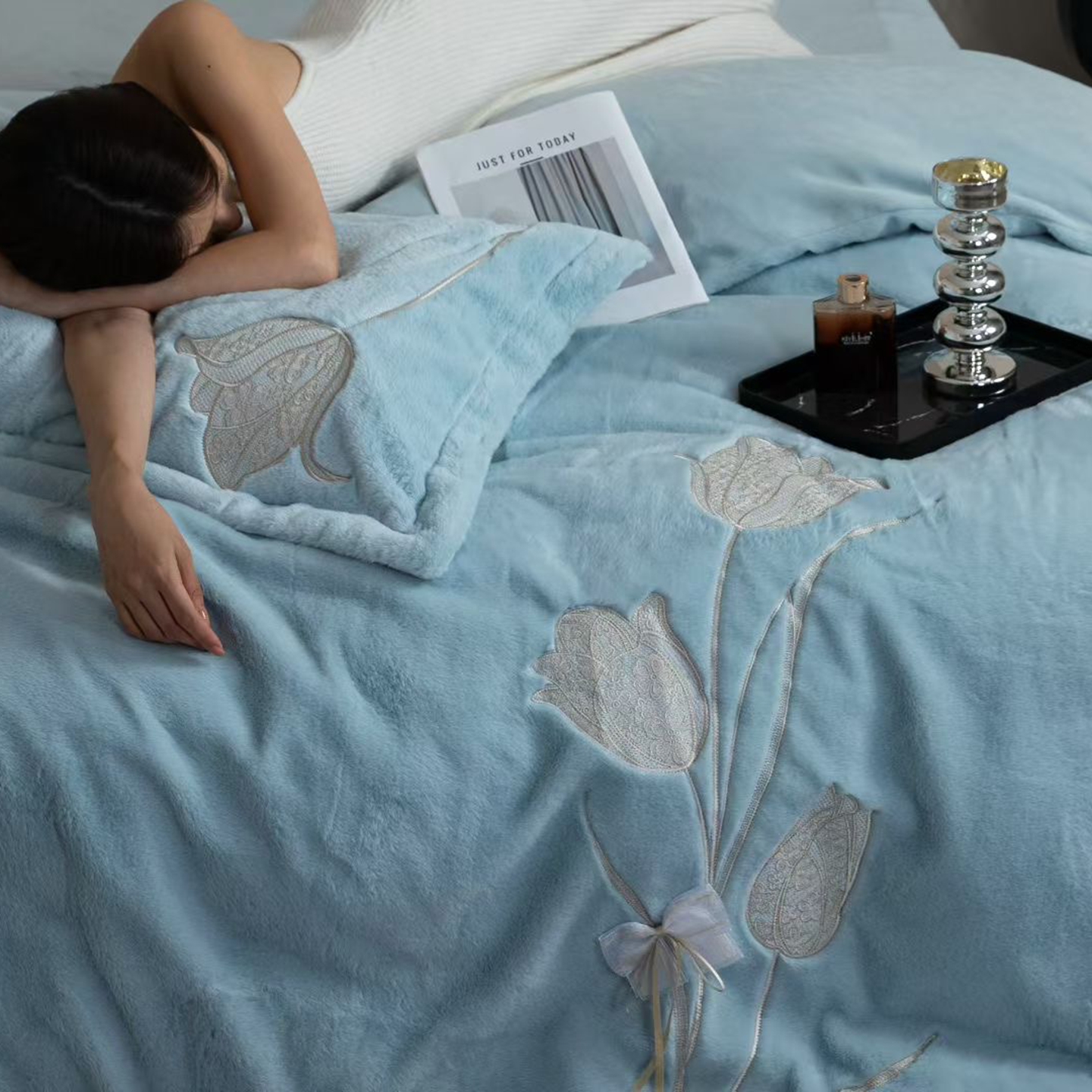 玖琳家纺 2026新款高端高克重水貂绒四件套-漫枝系列 漫枝 蓝色