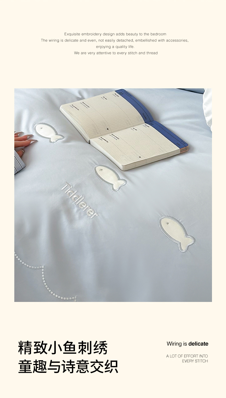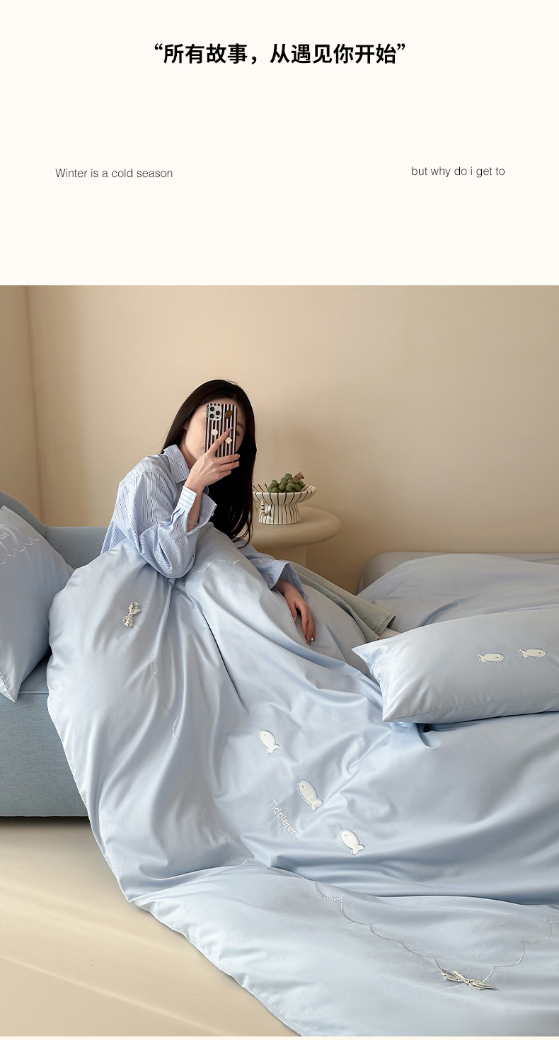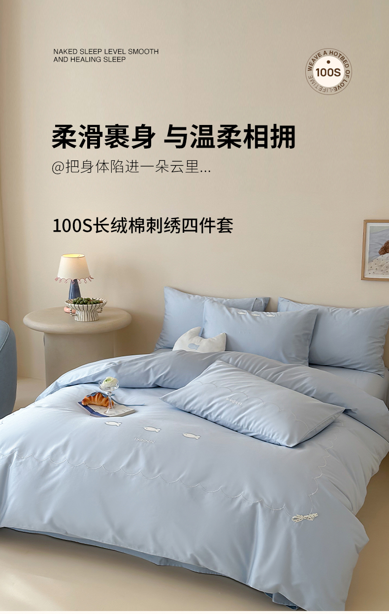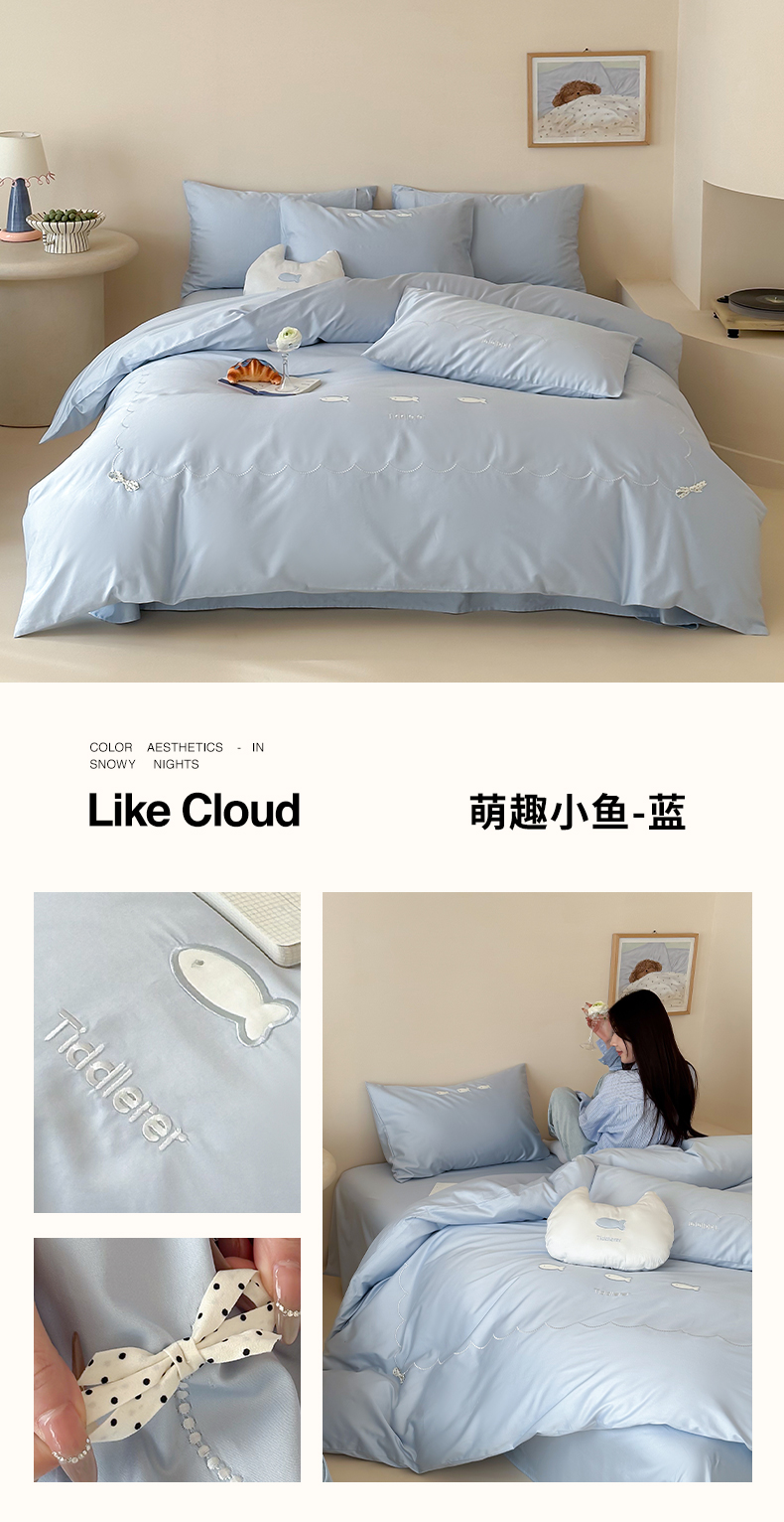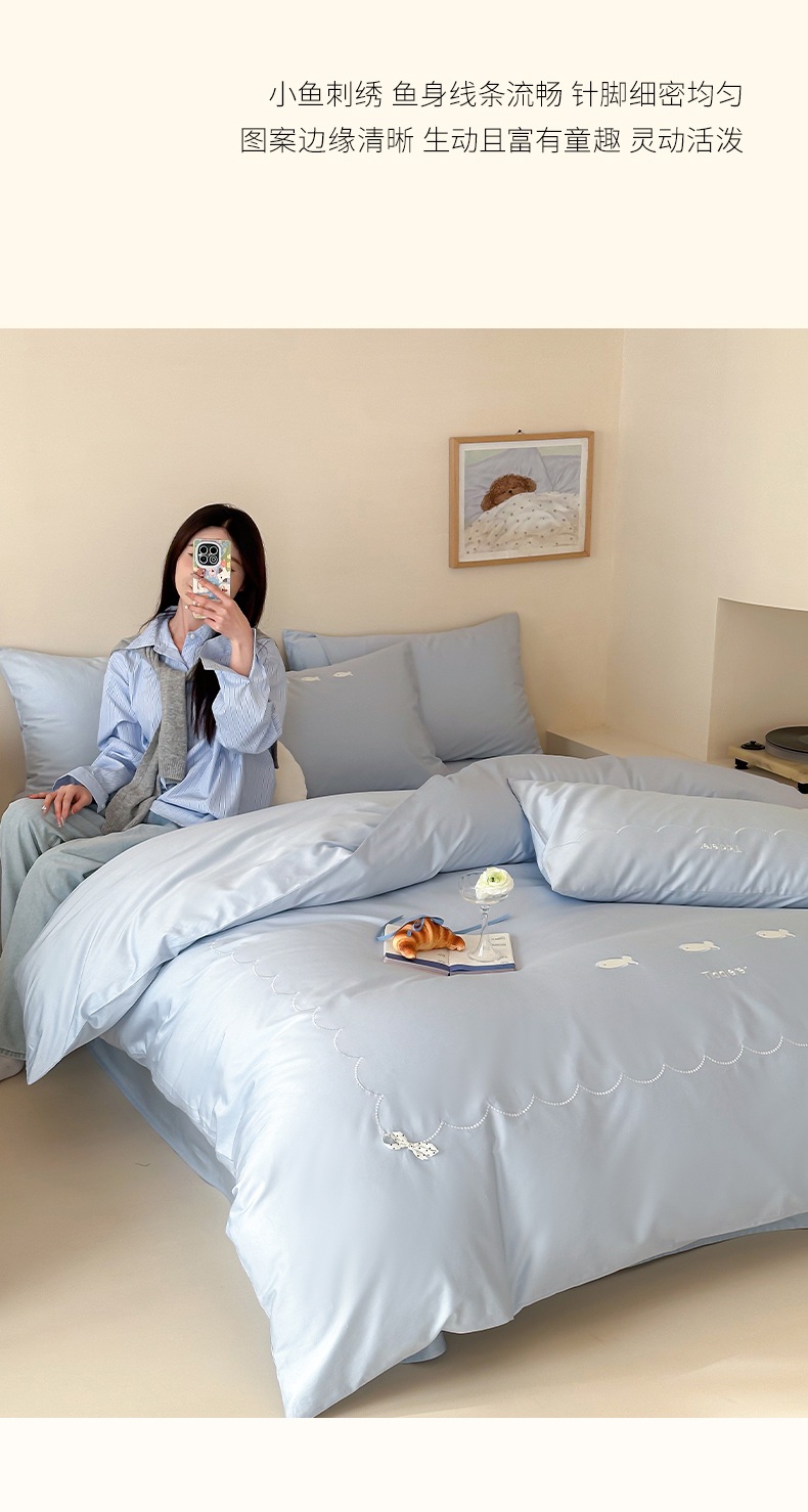 当前位置: 91家纺网 > 商品网购 > 床品套件 > 四件套 > 长绒棉四件套 > 极简 2026新款100S长绒棉刺绣四件套-萌趣小鱼(小号控价258标准288加大308) 萌趣小鱼-蓝