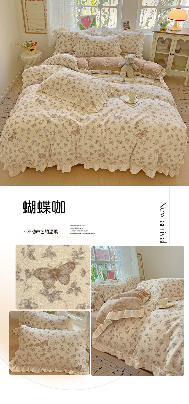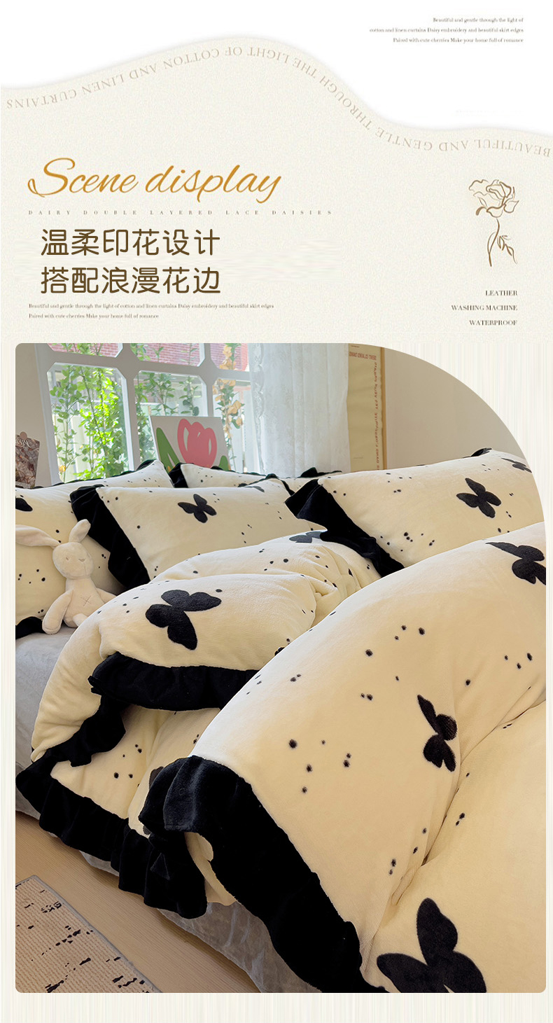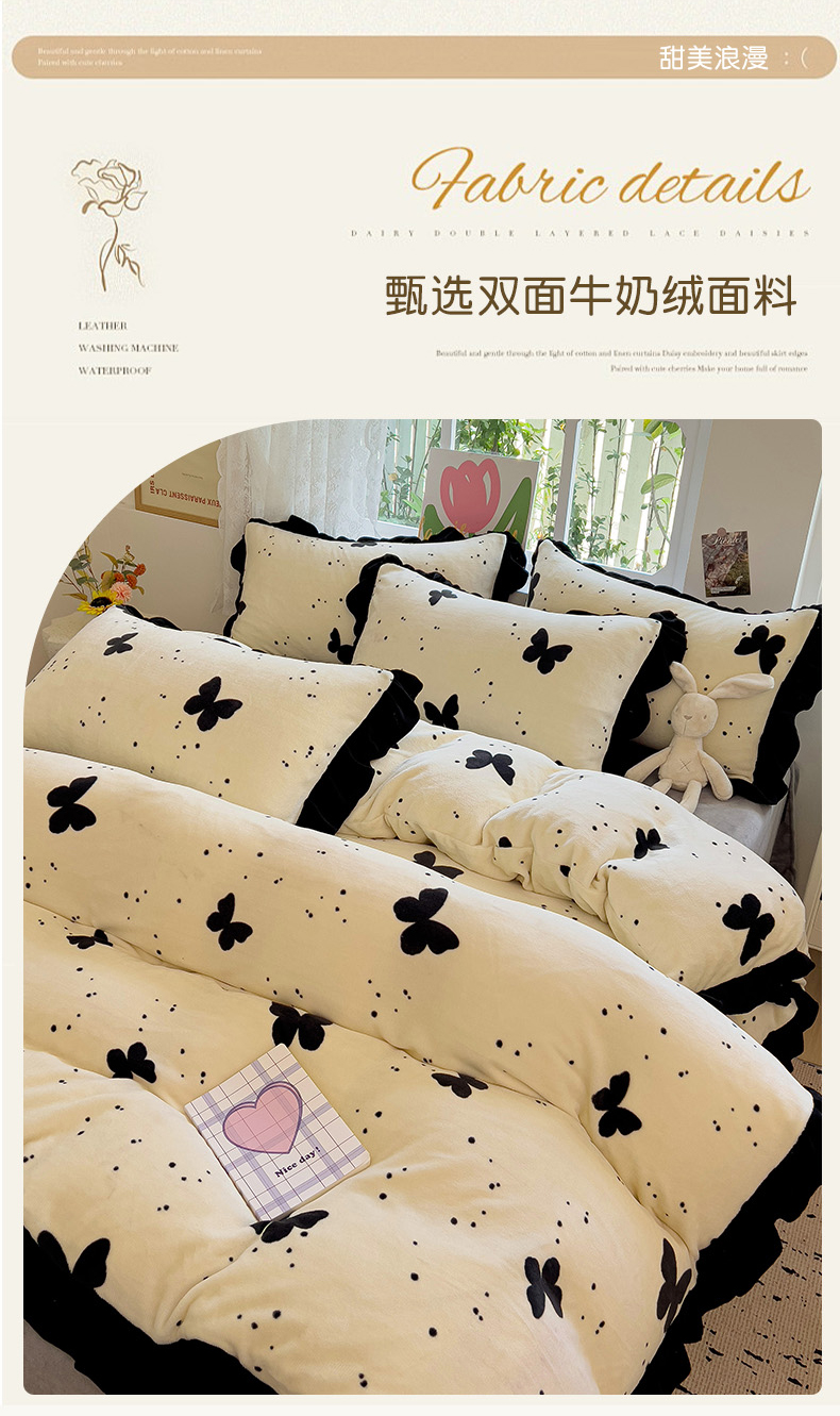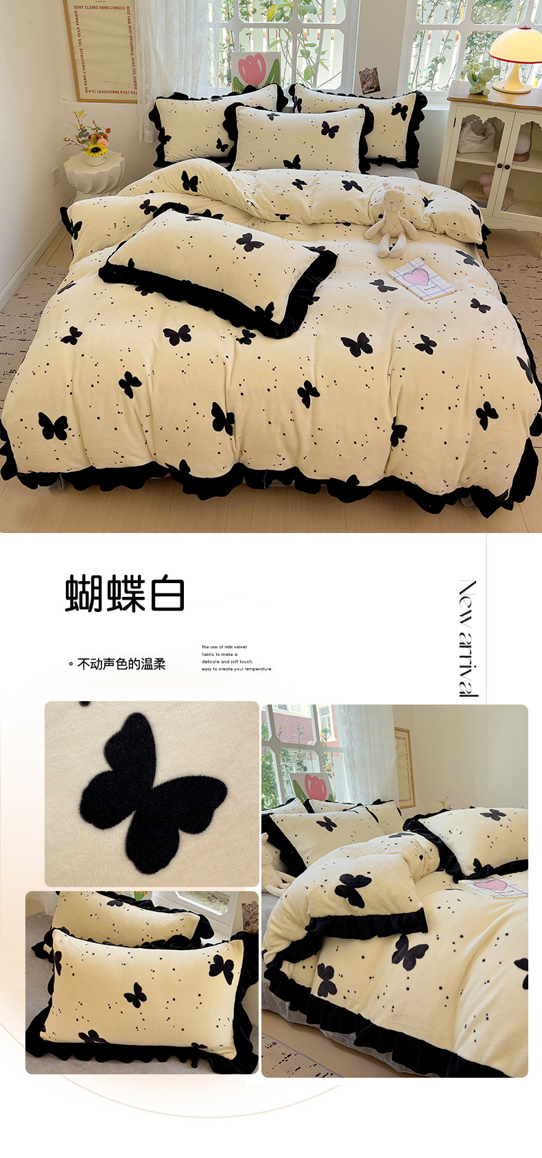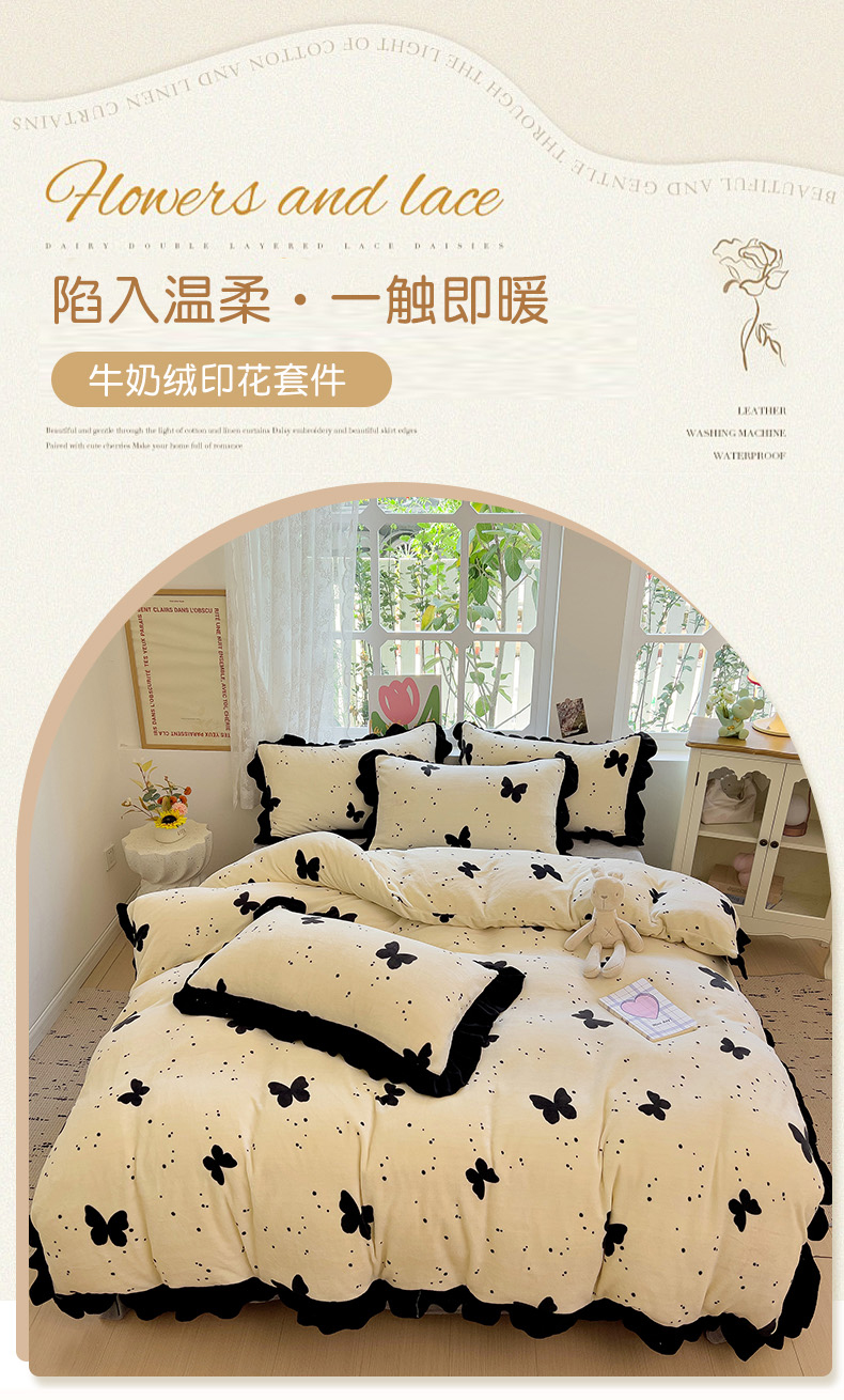 迪梦姿家纺 2025新款牛奶绒印花花边款四件套 蝴蝶白