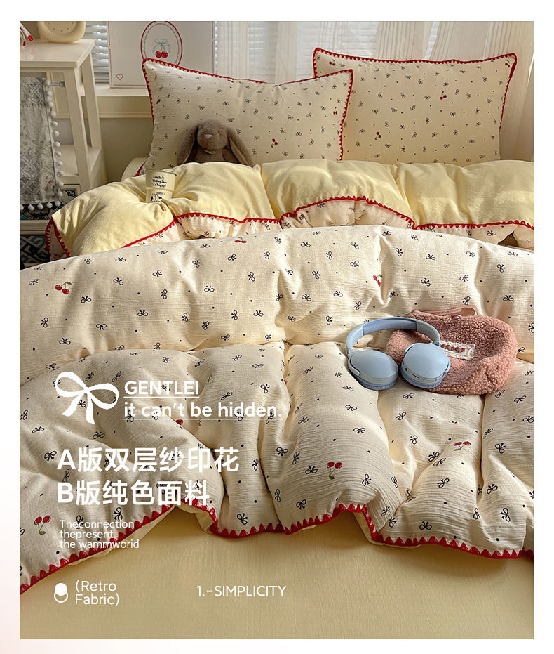 当前位置: 91家纺网 > 商品网购 > 床品套件 > 四件套 > 化纤普通四件套 > 顾里家纺 2026春夏新款ins韩风印花贝壳针双层纱四件套 啵啵猫咪