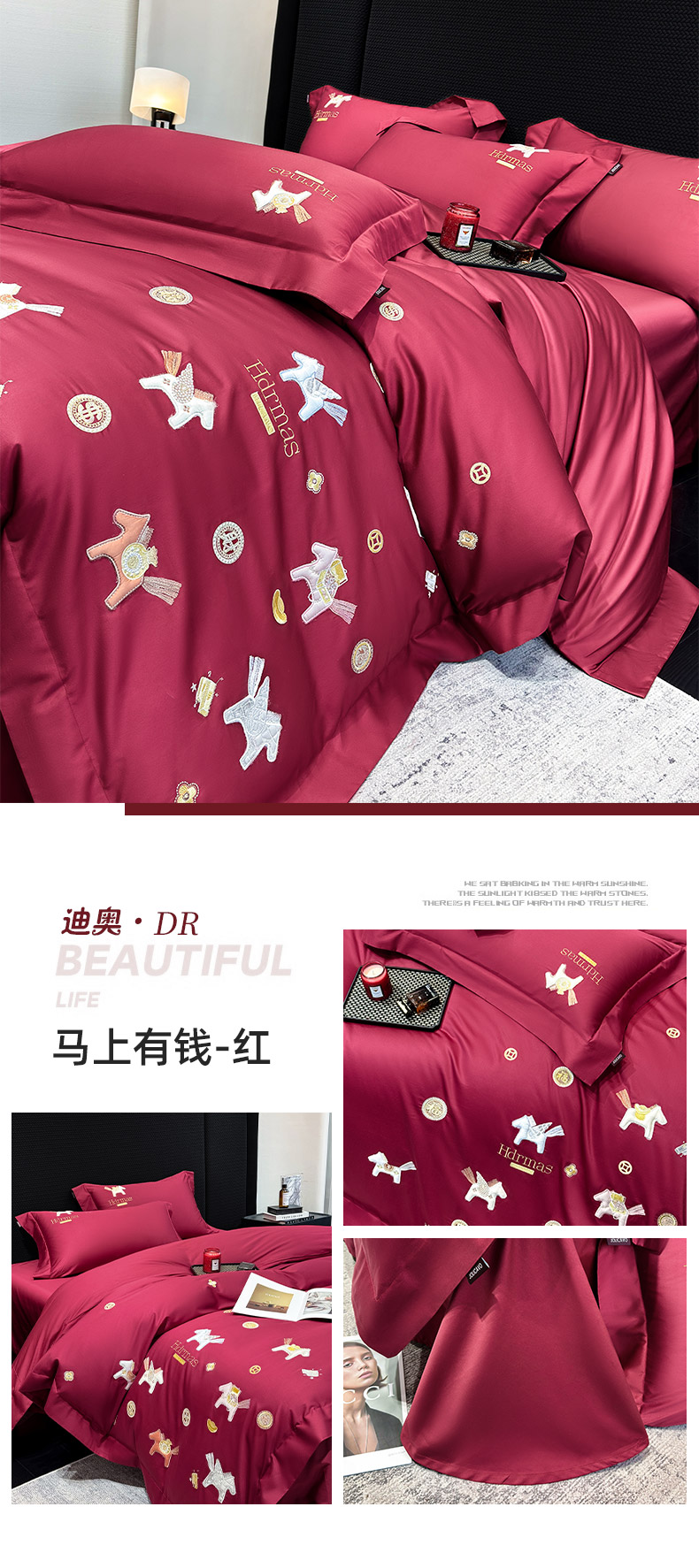 (总) 2026新款【迪奥】马年50S双股A类长绒棉纯棉四件套100全棉新年刺绣被套床单,马上有钱-红,马上有钱-金,马上有钱-橙,马上有钱-粉