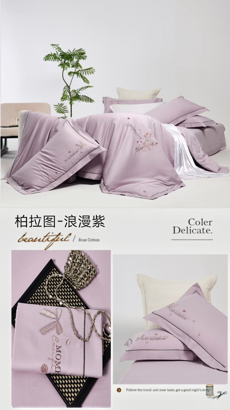 梦丝语家纺秋冬婚庆送礼居家高端100支长绒棉磨毛平绣加毛巾绣四件套,柏拉图-浪漫紫