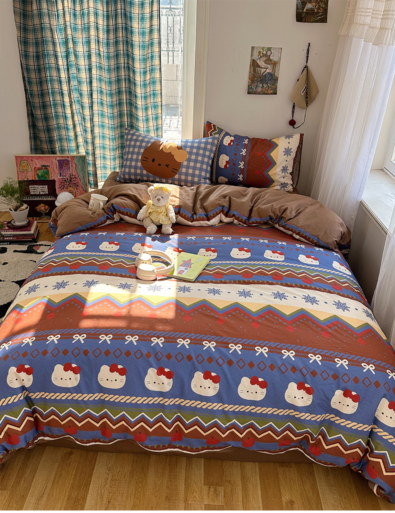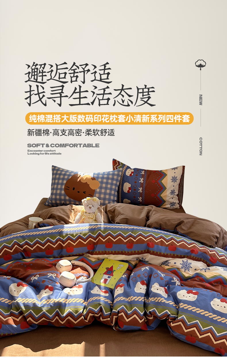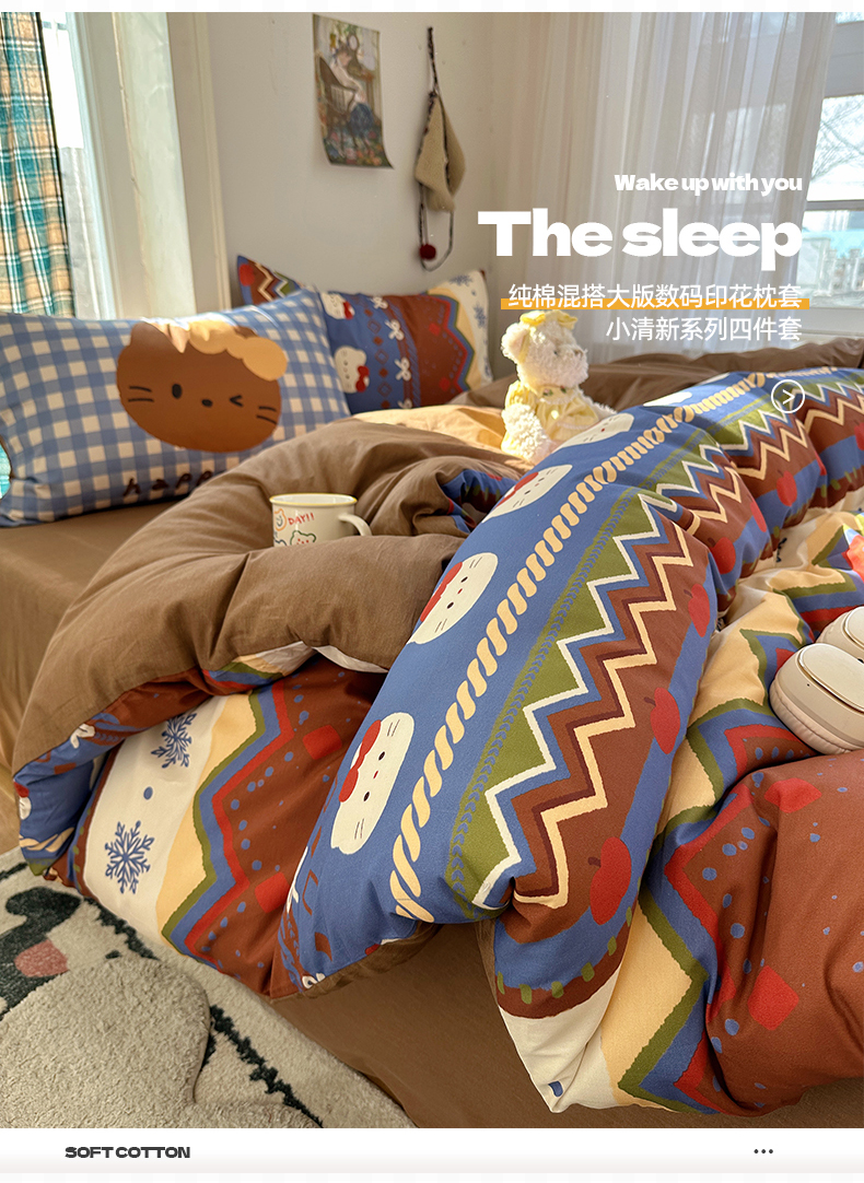 桃子家居 2026新款纯棉混搭大版数码印花枕套小清新猫咪可爱系列四件套 棉混搭-甜心软糖猫