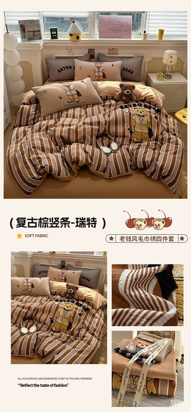 当前位置: 91家纺网 > 商品网购 > 床品套件 > 四件套 > 化纤普通四件套 > 花伞家居 2026新款老钱学院风毛巾绣双层纱加厚四件套 复古棕竖条-瑞特