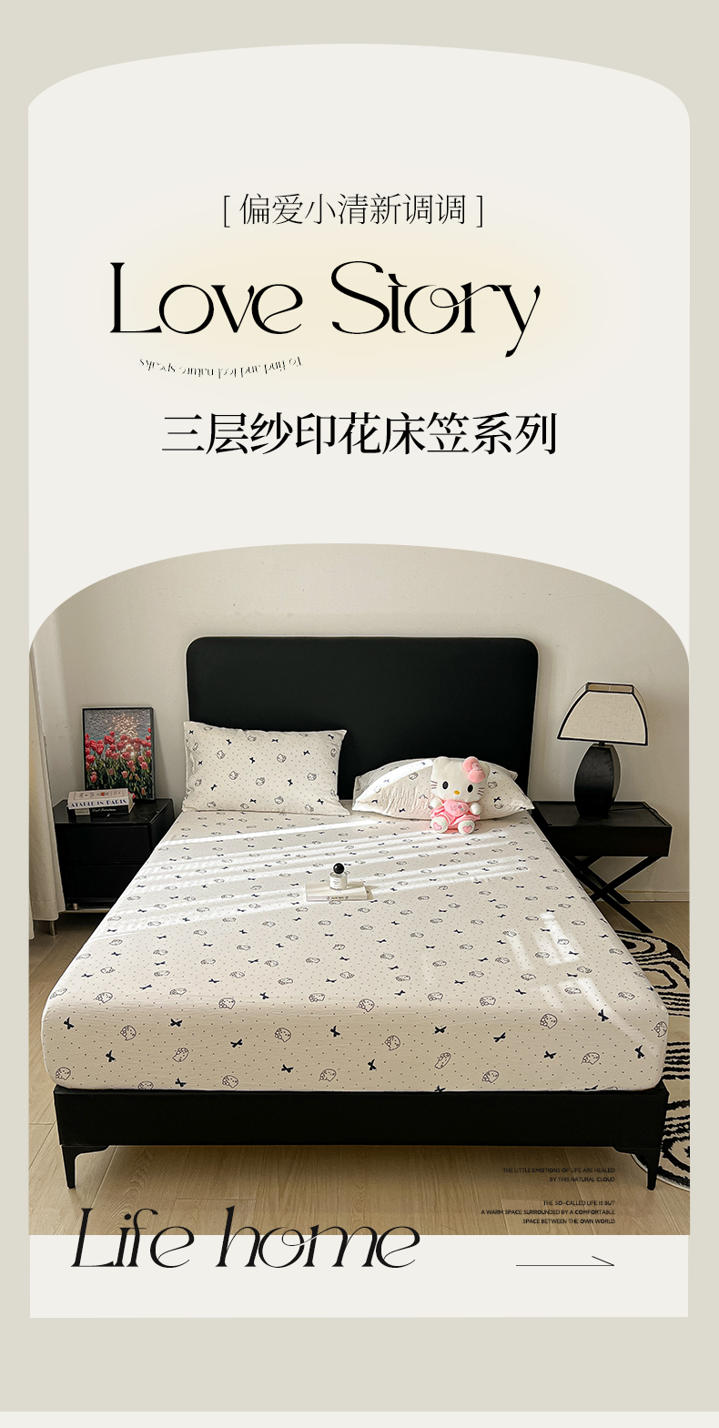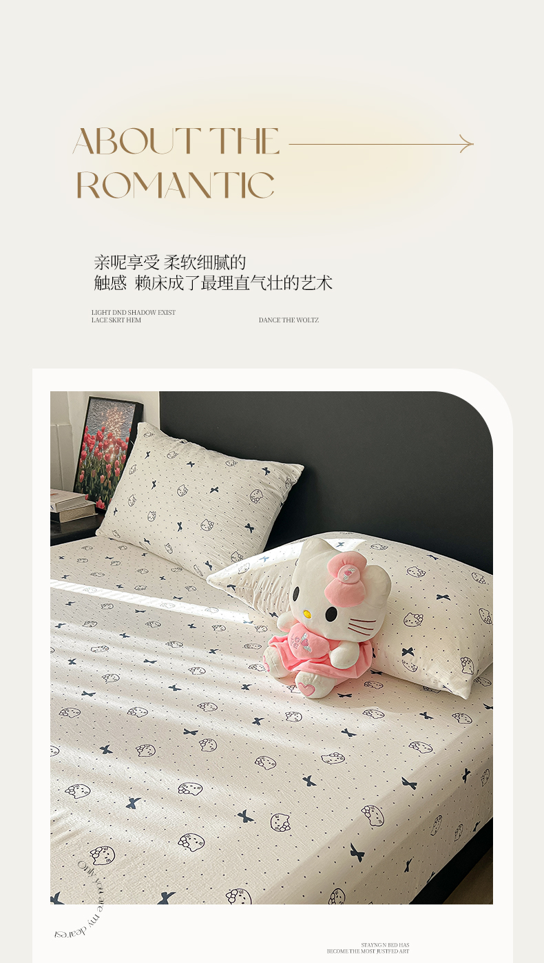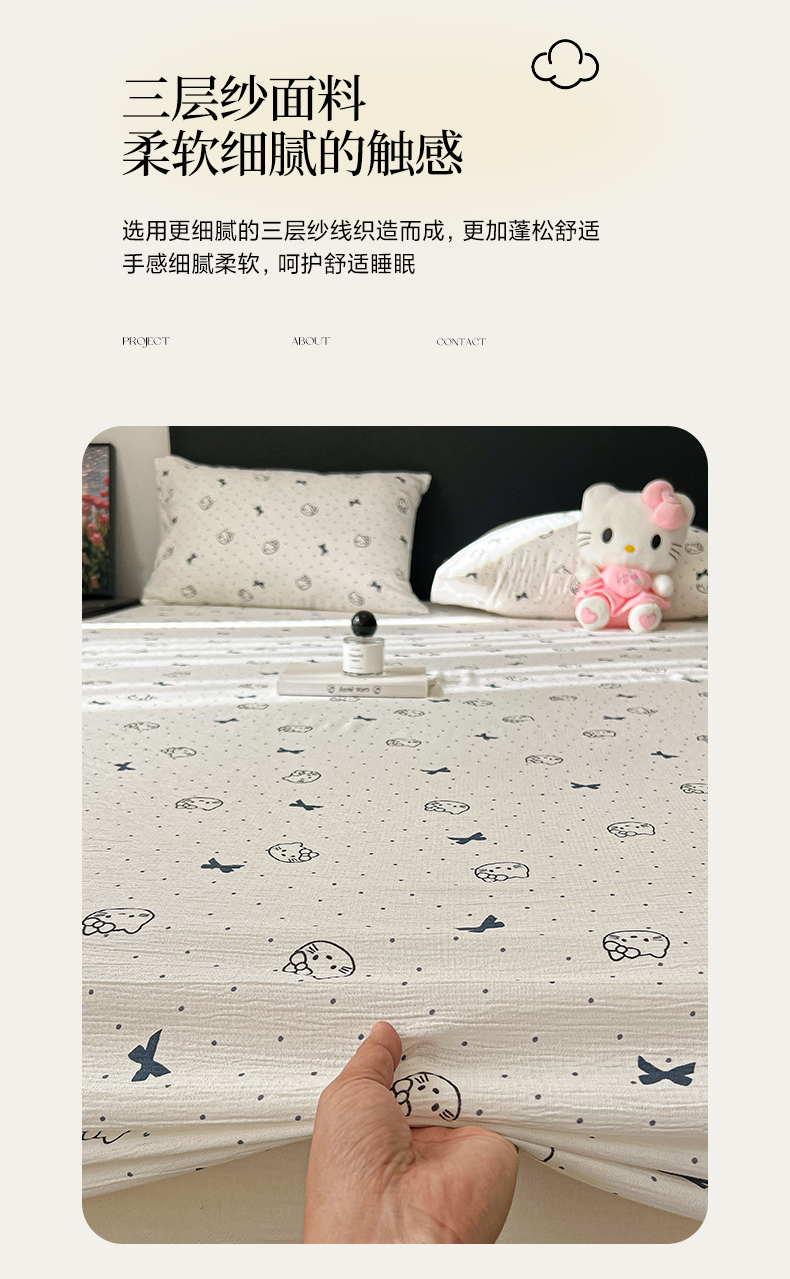 • 91家纺网 家纺一手货源 找家纺 韩巢家纺 2026新款三层纱单床笠热销款防滑床笠单件 蓝莓小猫