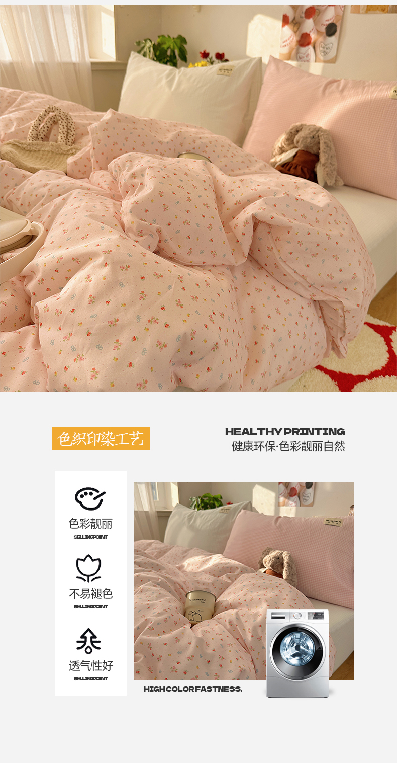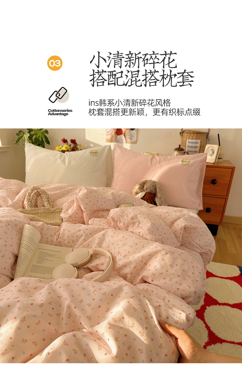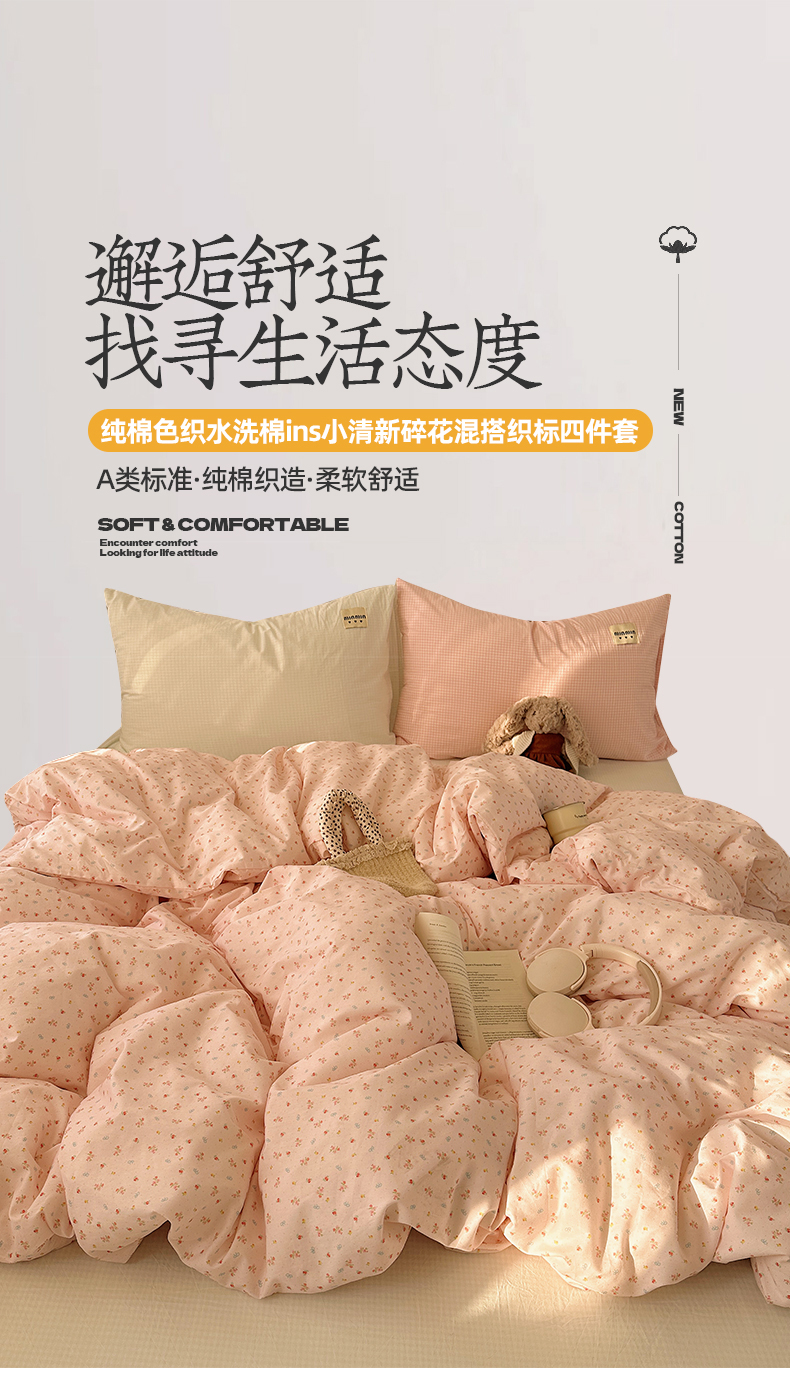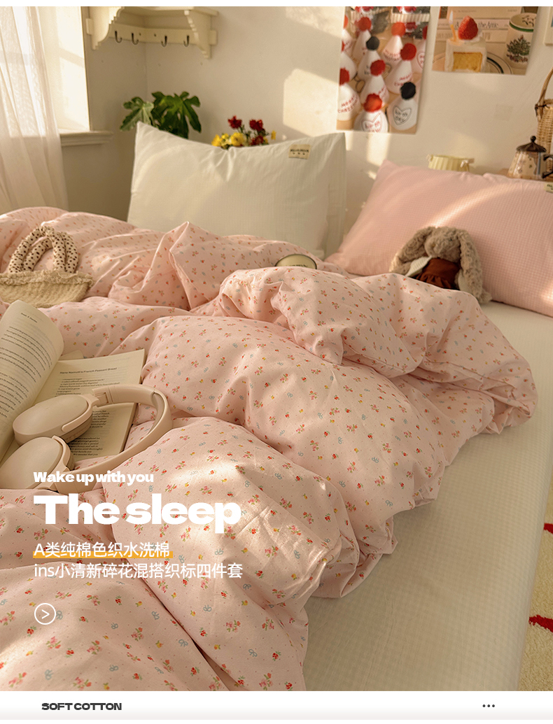 商品名称:桃子家居 2026新款A类纯棉水洗棉ins韩系小清新碎花混搭织标工艺色织水洗棉四件套系列 水洗棉-桃雾花甜