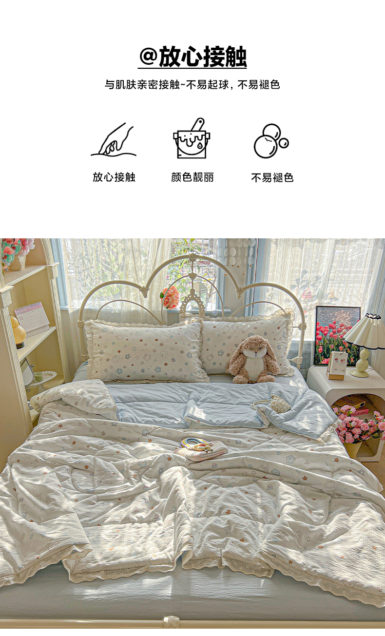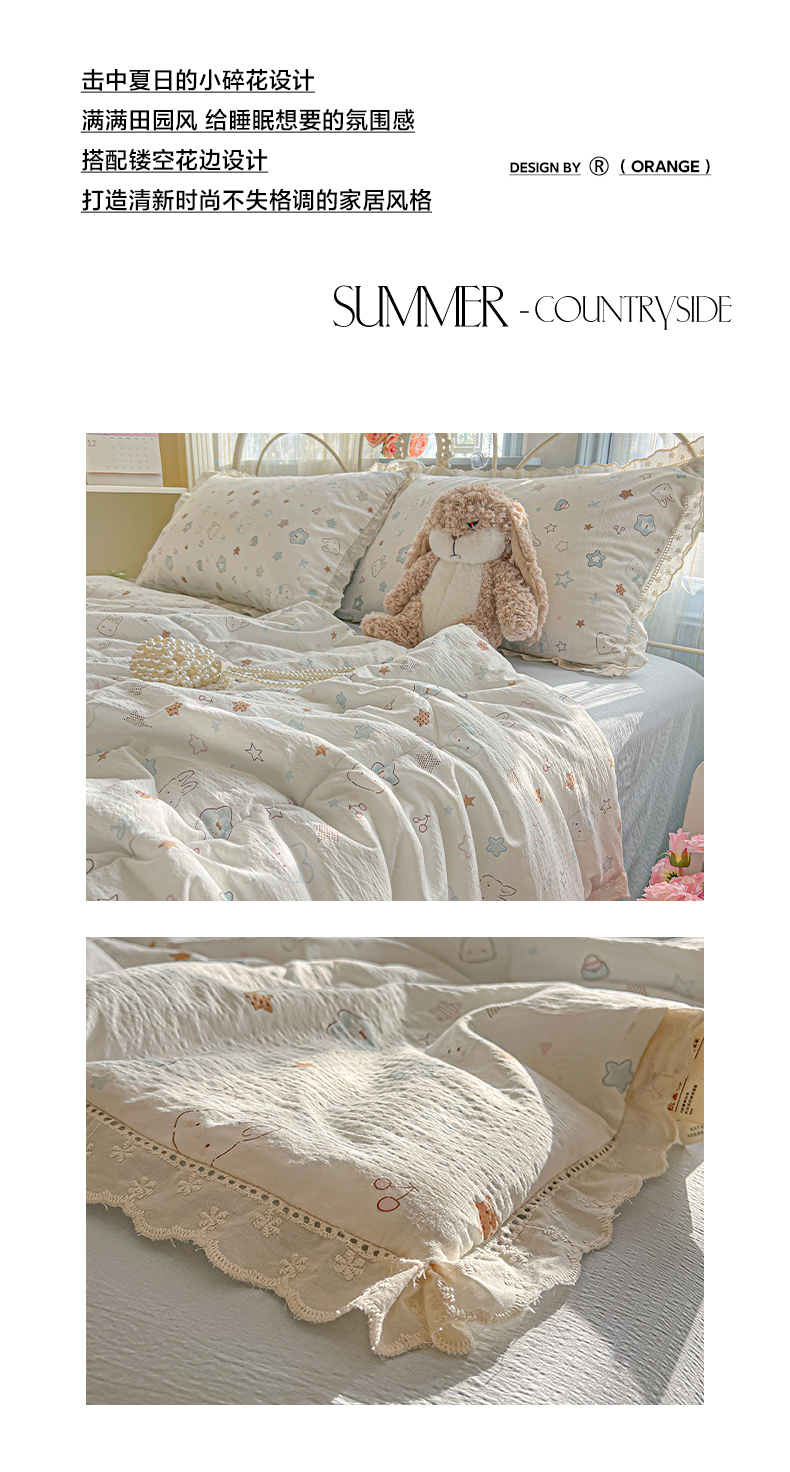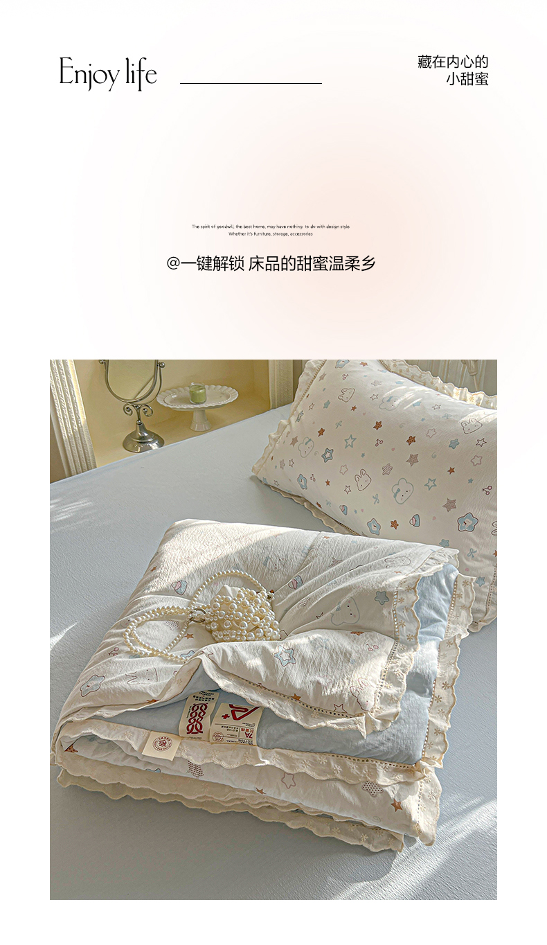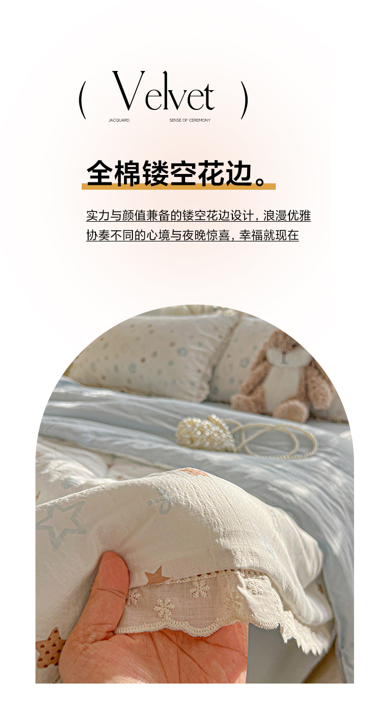 商品名称:罗亿家纺 2026新款全棉镂空花边云感双层纱夏被四件套 星星兔