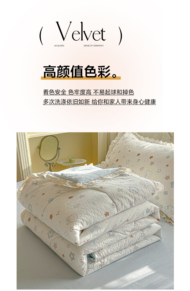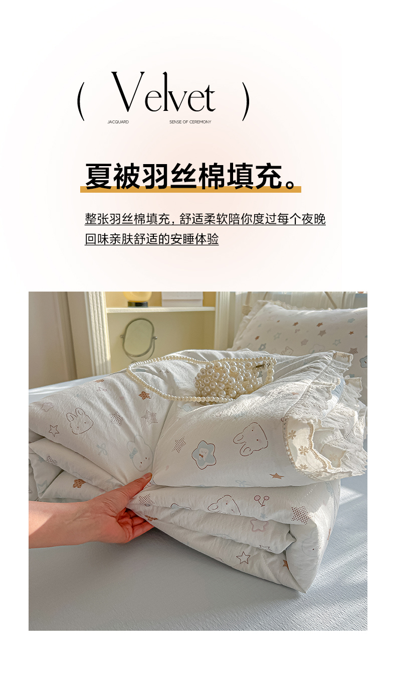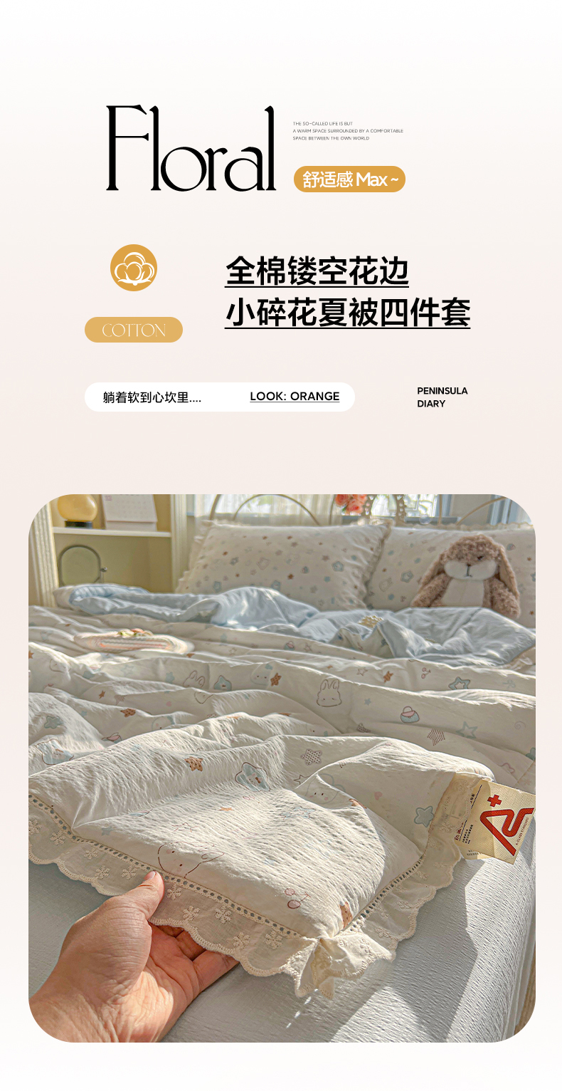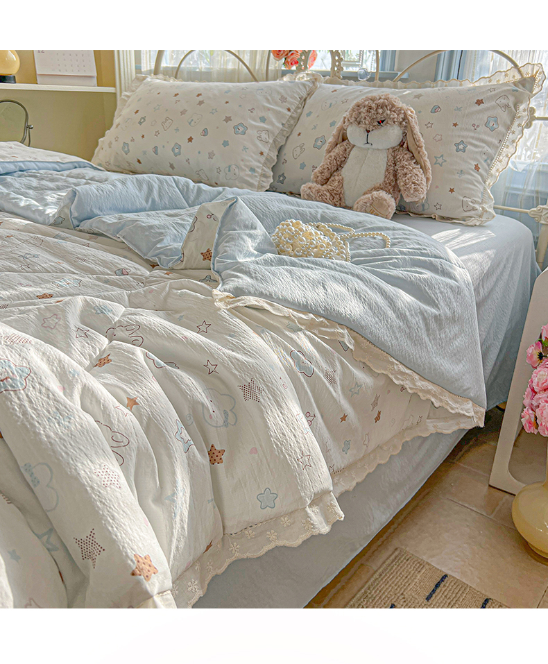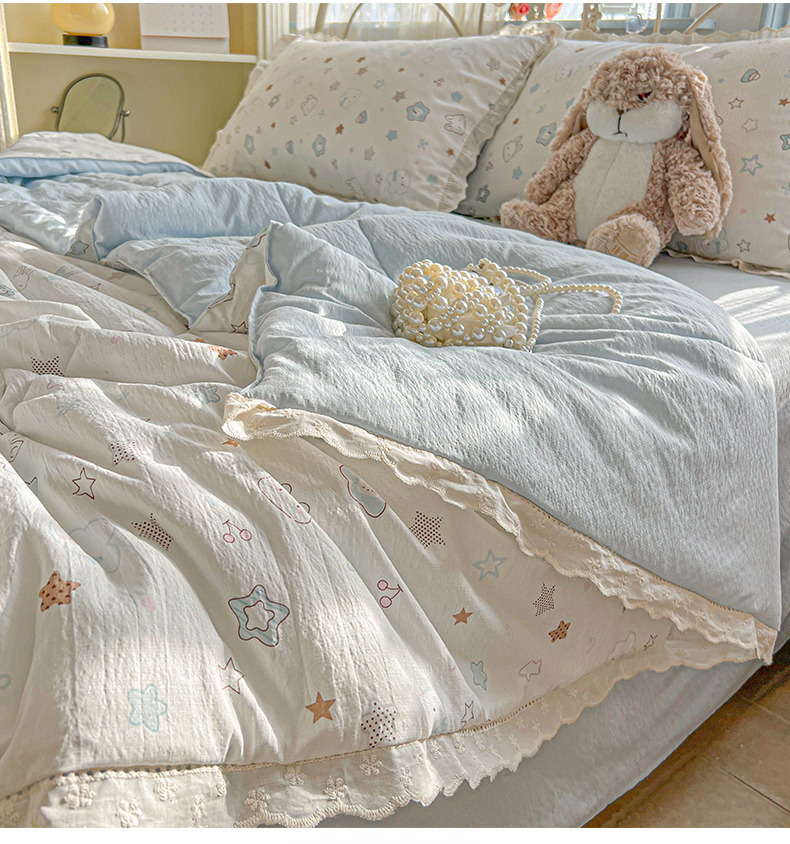 商品名称:罗亿家纺 2026新款全棉镂空花边云感双层纱夏被四件套 星星兔