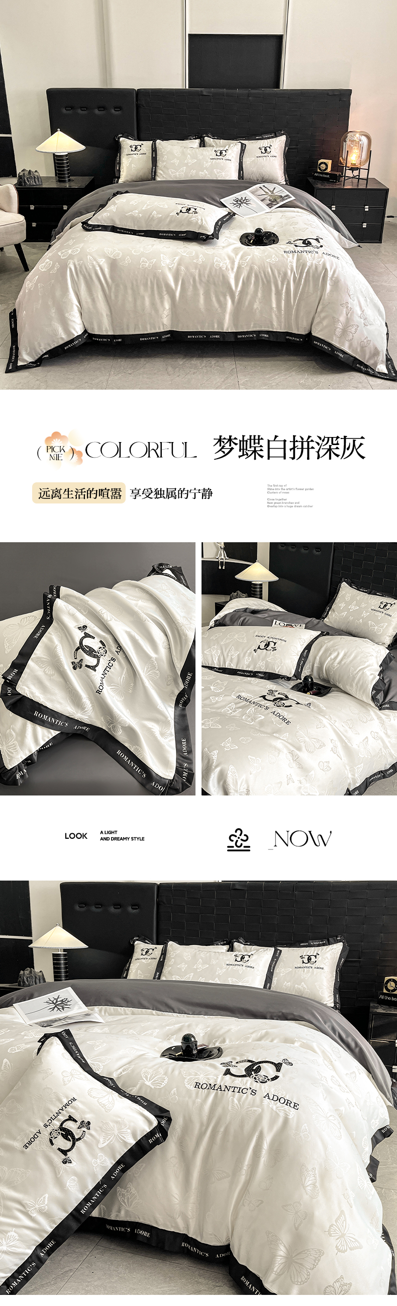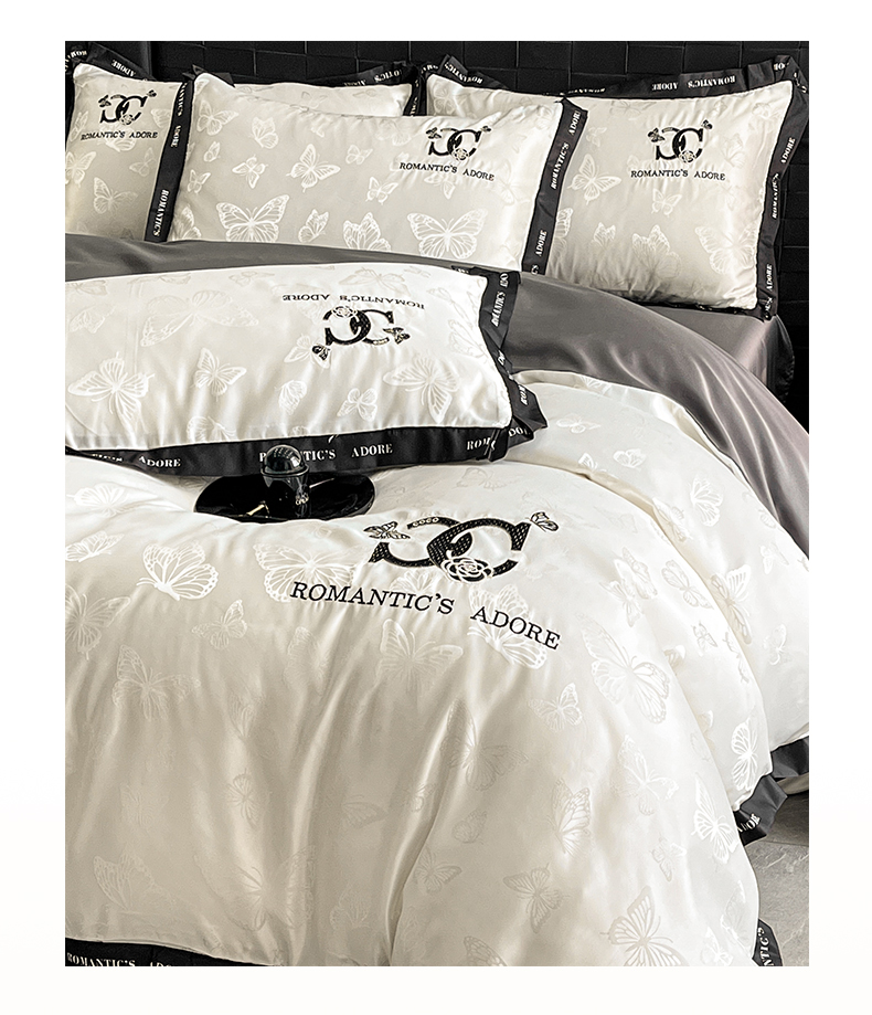 (总)宇航家纺 2026新款专版厚织亮丝提花水洗真丝四件套梦蝶系列,梦蝶奶白,梦蝶白拼深灰,爱意白拼深灰,爱意白色,梦蝶粉玉,梦蝶天蓝,梦蝶银灰