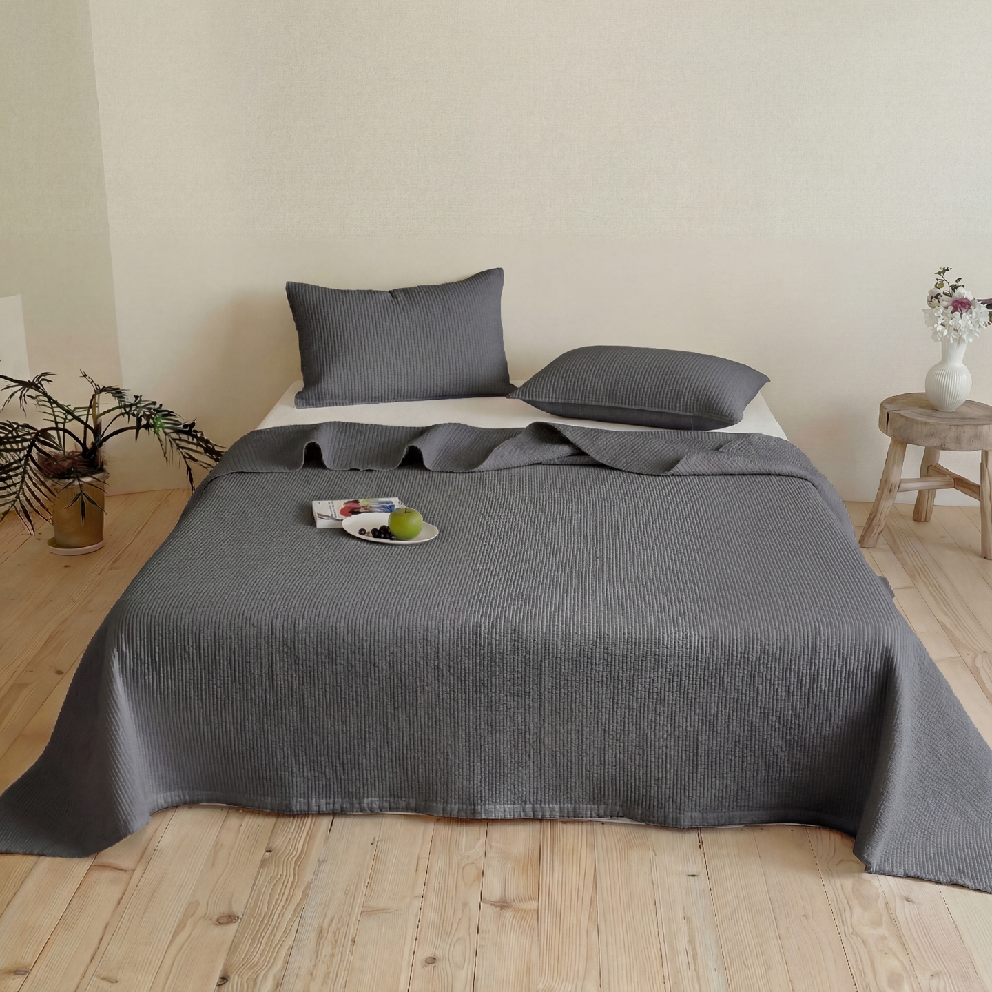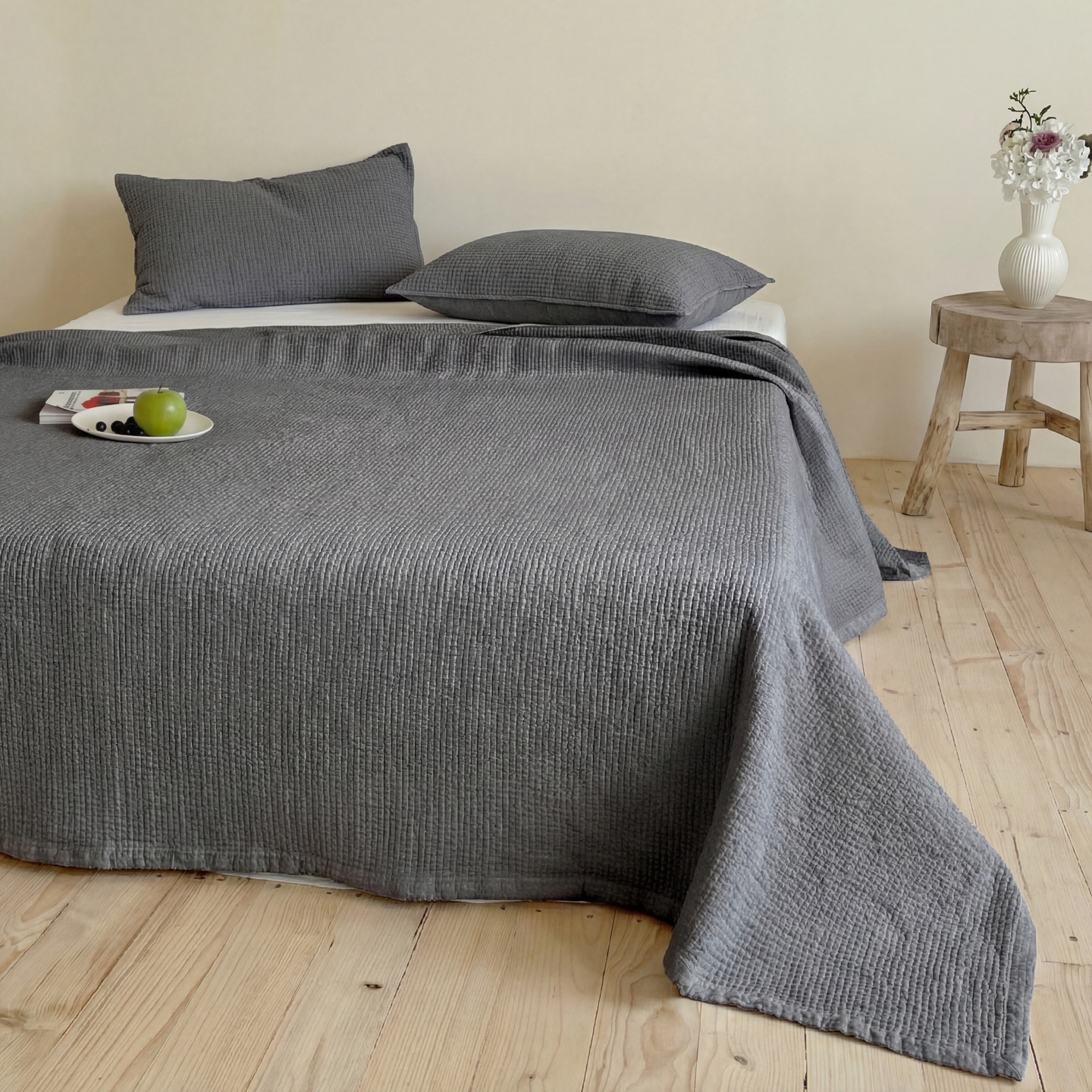 上喜 2026春夏新款全棉纯棉直角边简约韩系砂洗床盖三件套 火山灰