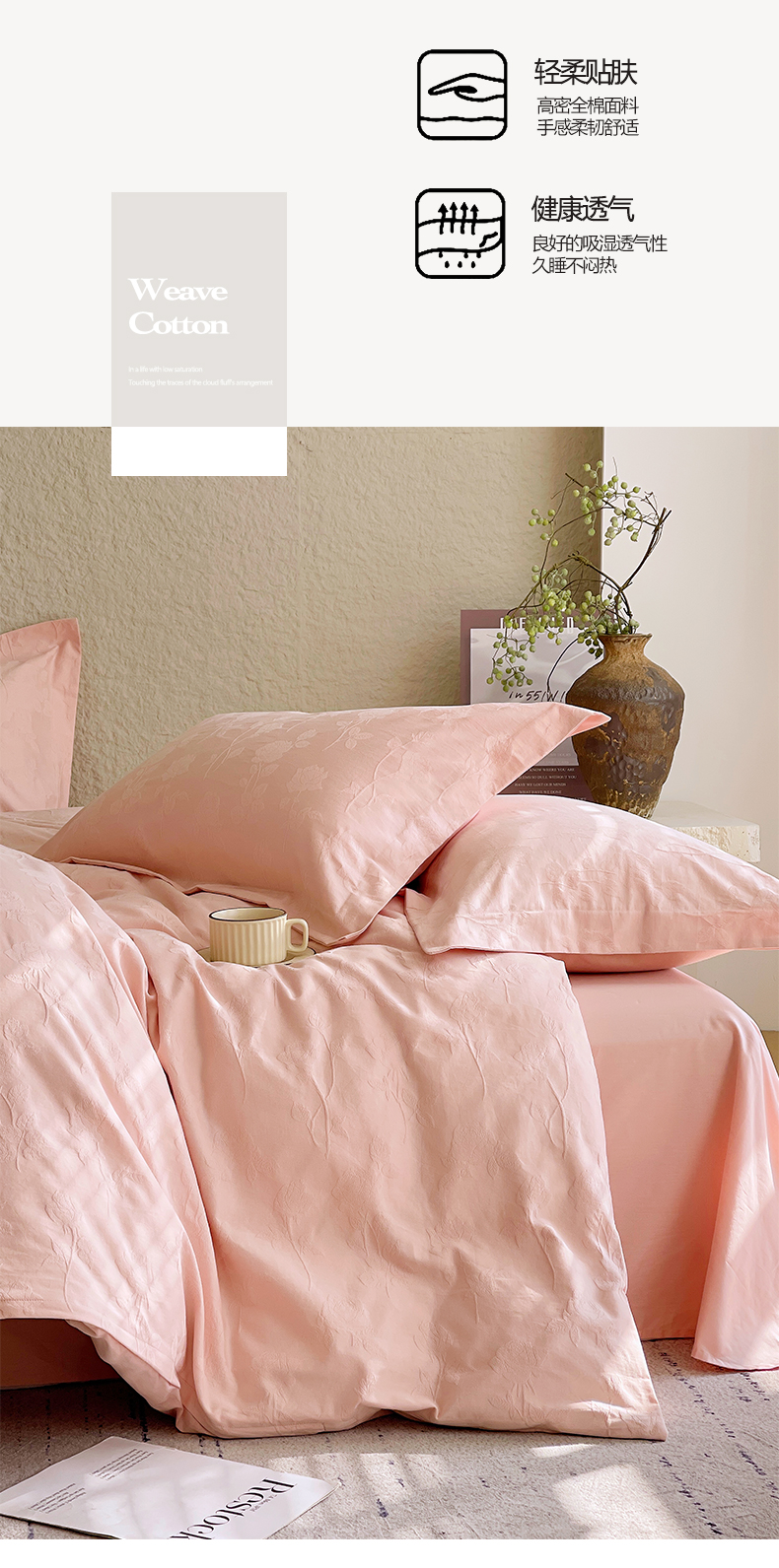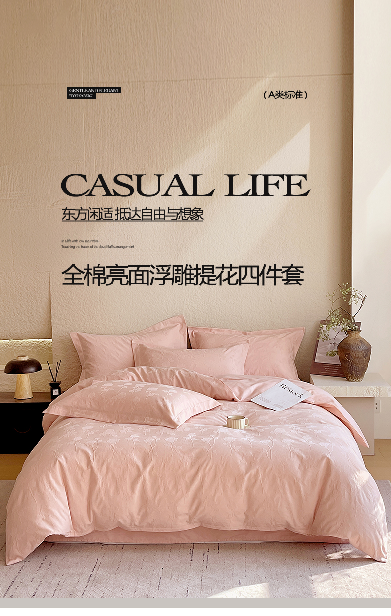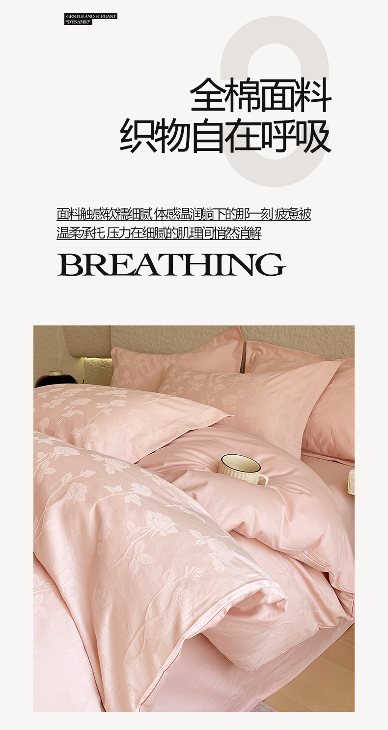 商品名称:麦田家纺 2026新款A类全棉亮面浮雕提花四件套 岁月留声-唯美粉
