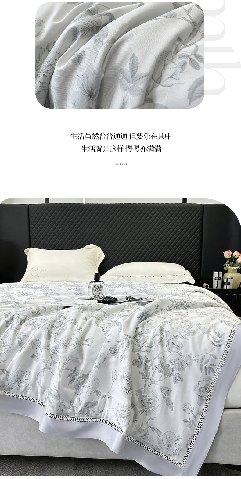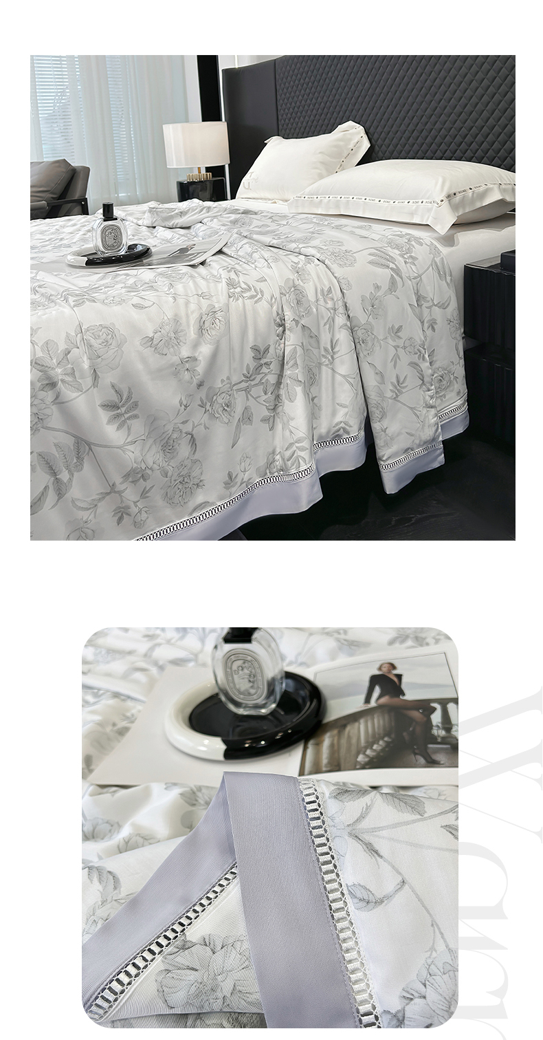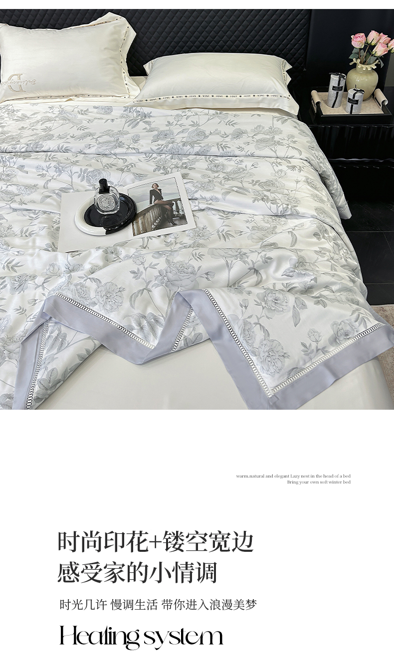 商品名称:薇玛仕 2026新款茶小纤60S长绒棉印花镂空款蚕丝夏凉被空调被 墨韵