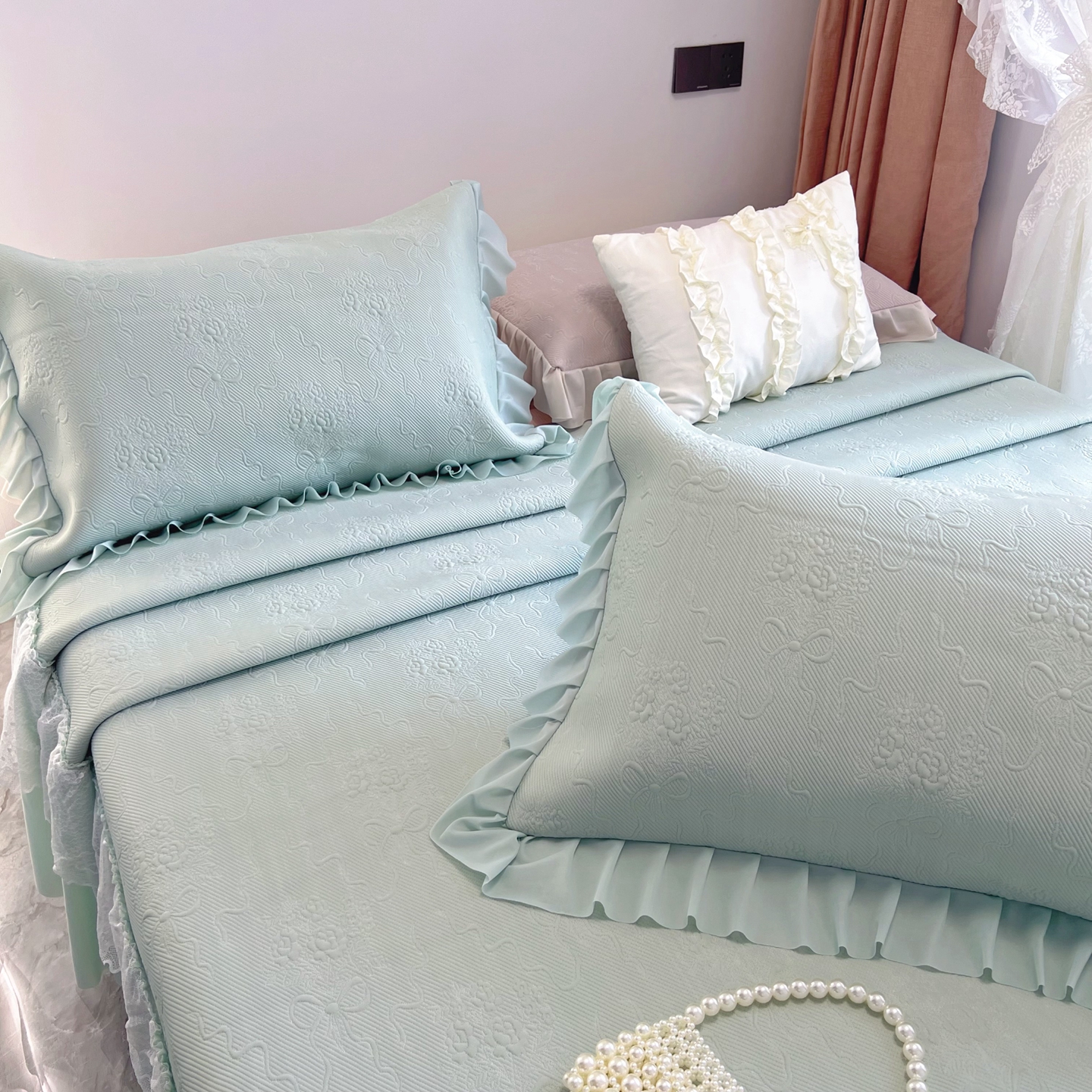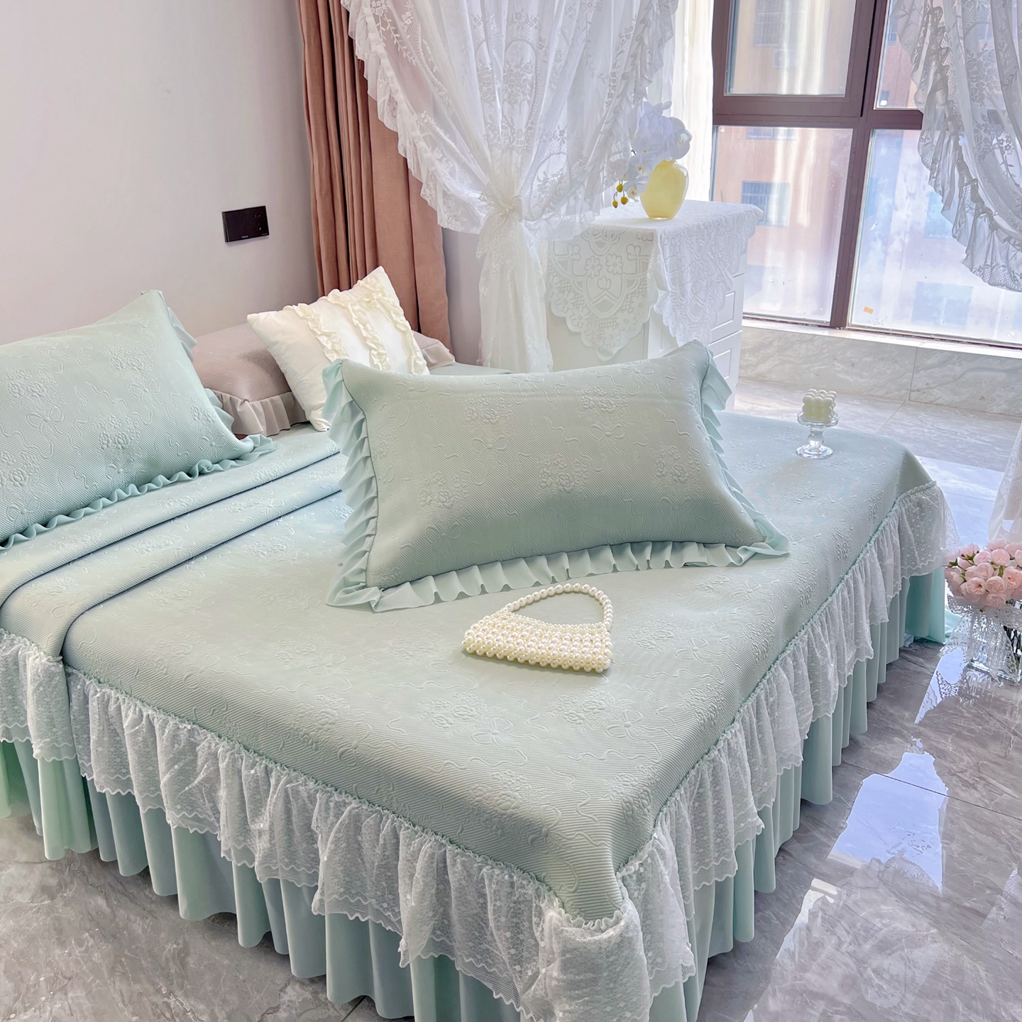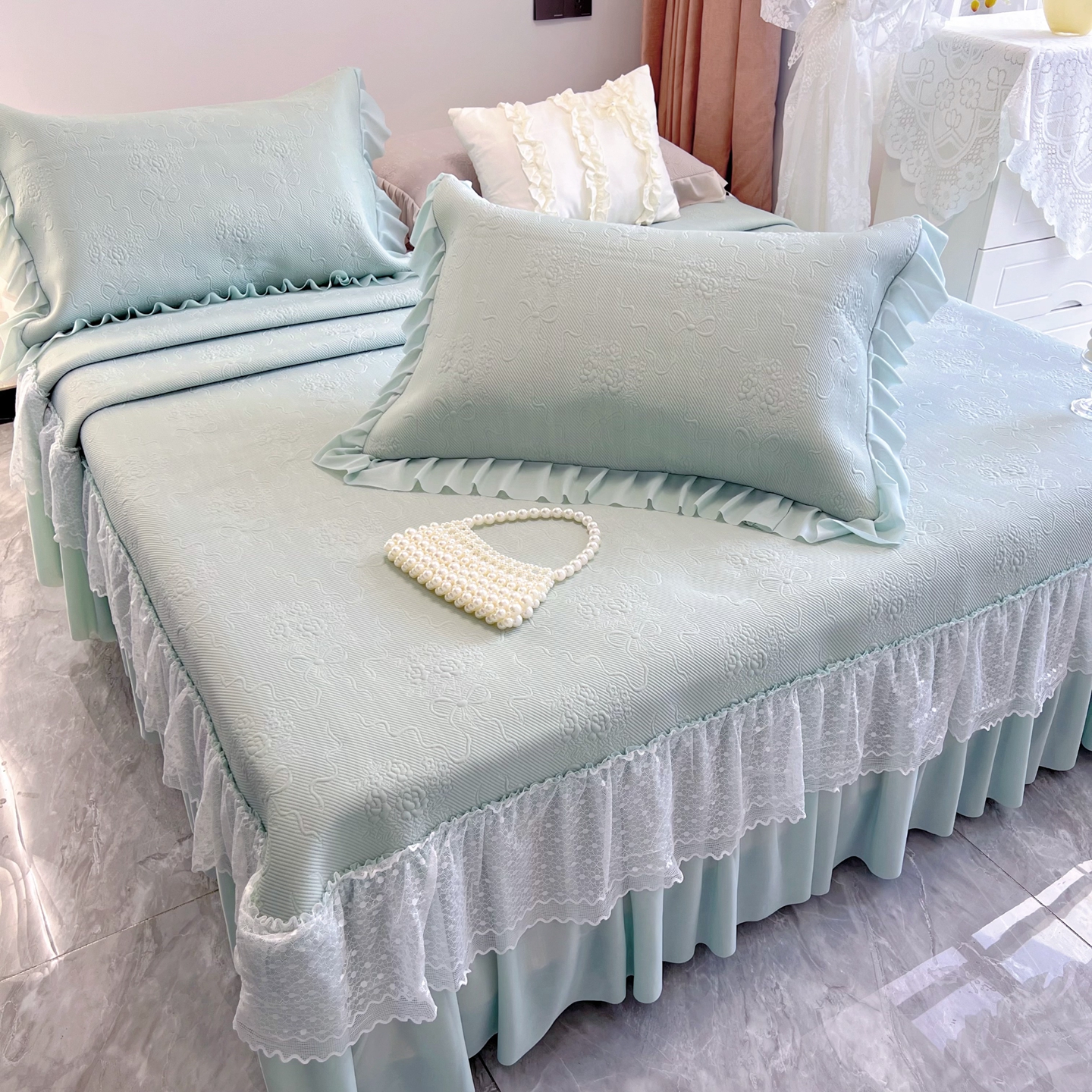 商品名称:恋尚羽 2026新款高分子PE凉泡泡大床裙凉感席波浪冰豆豆凉席席子三件套-蝴蝶结系列手捧花 绿色
