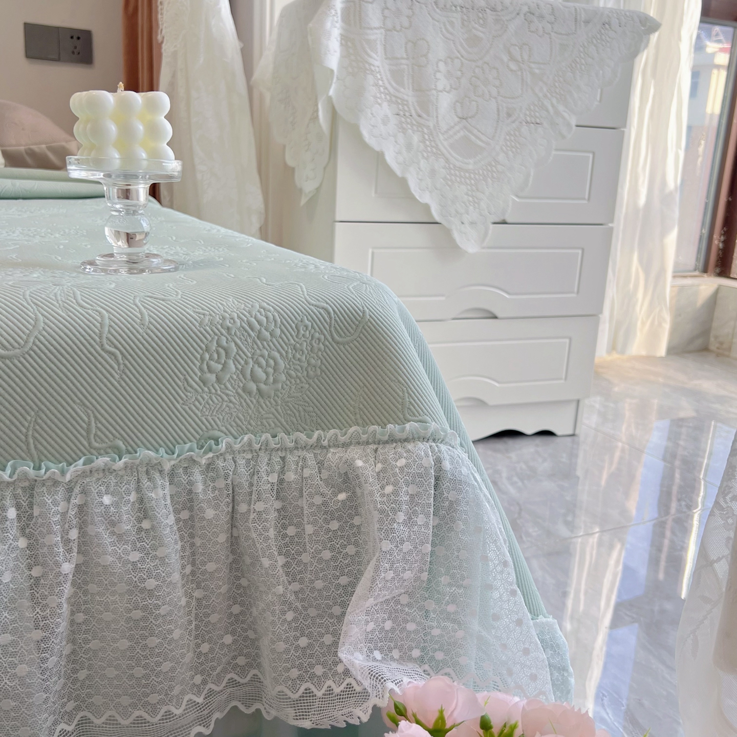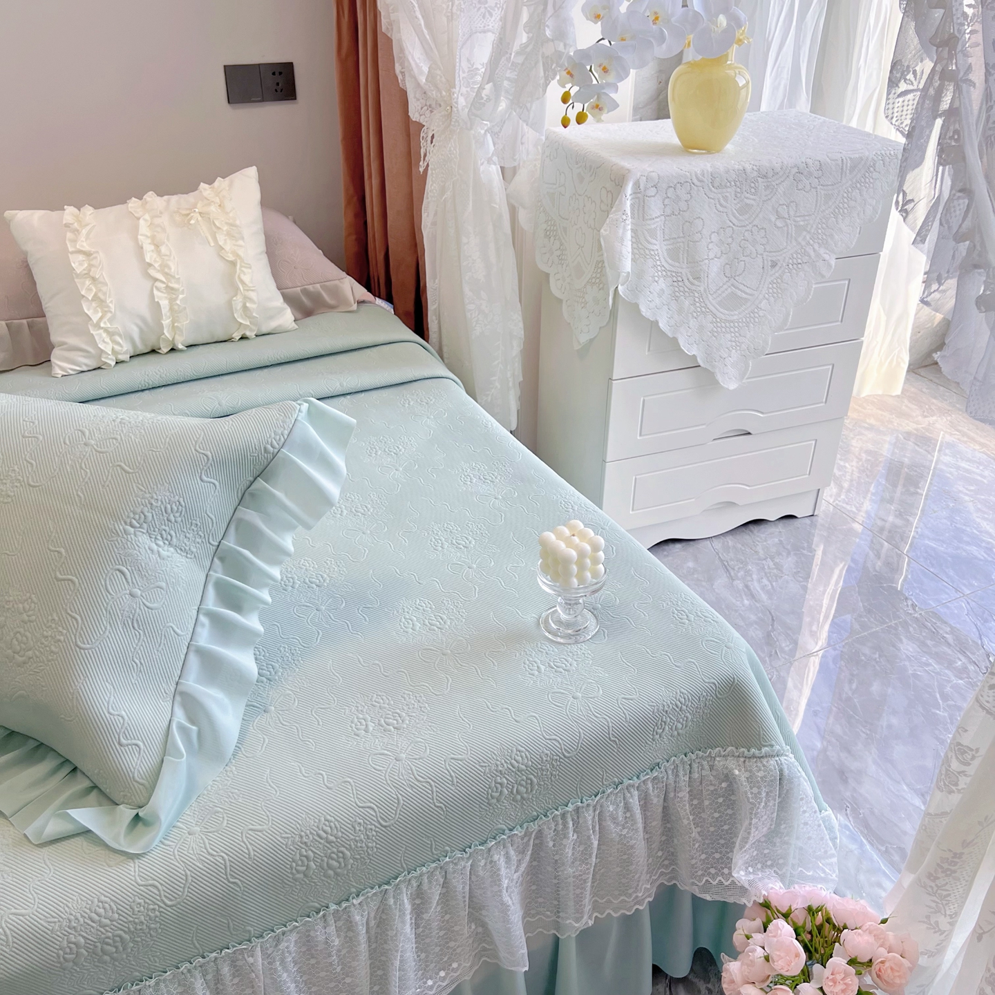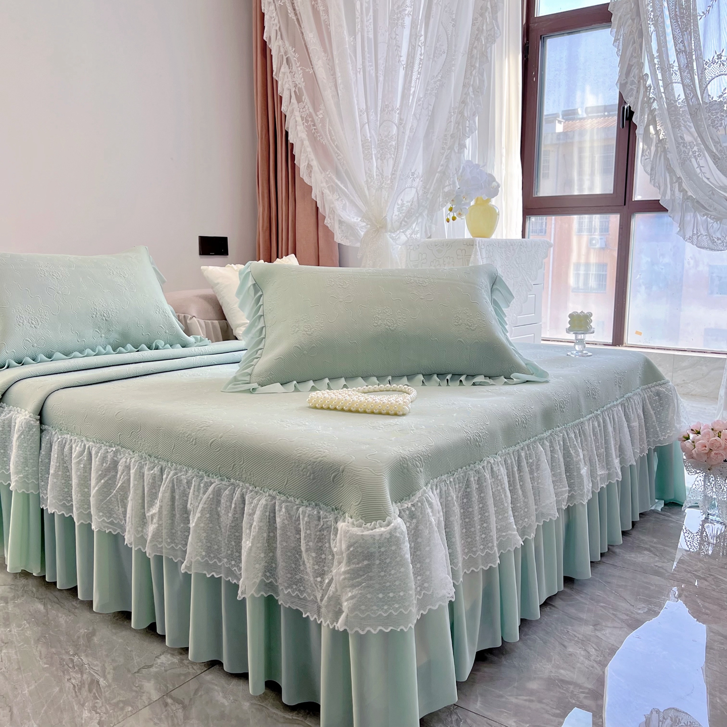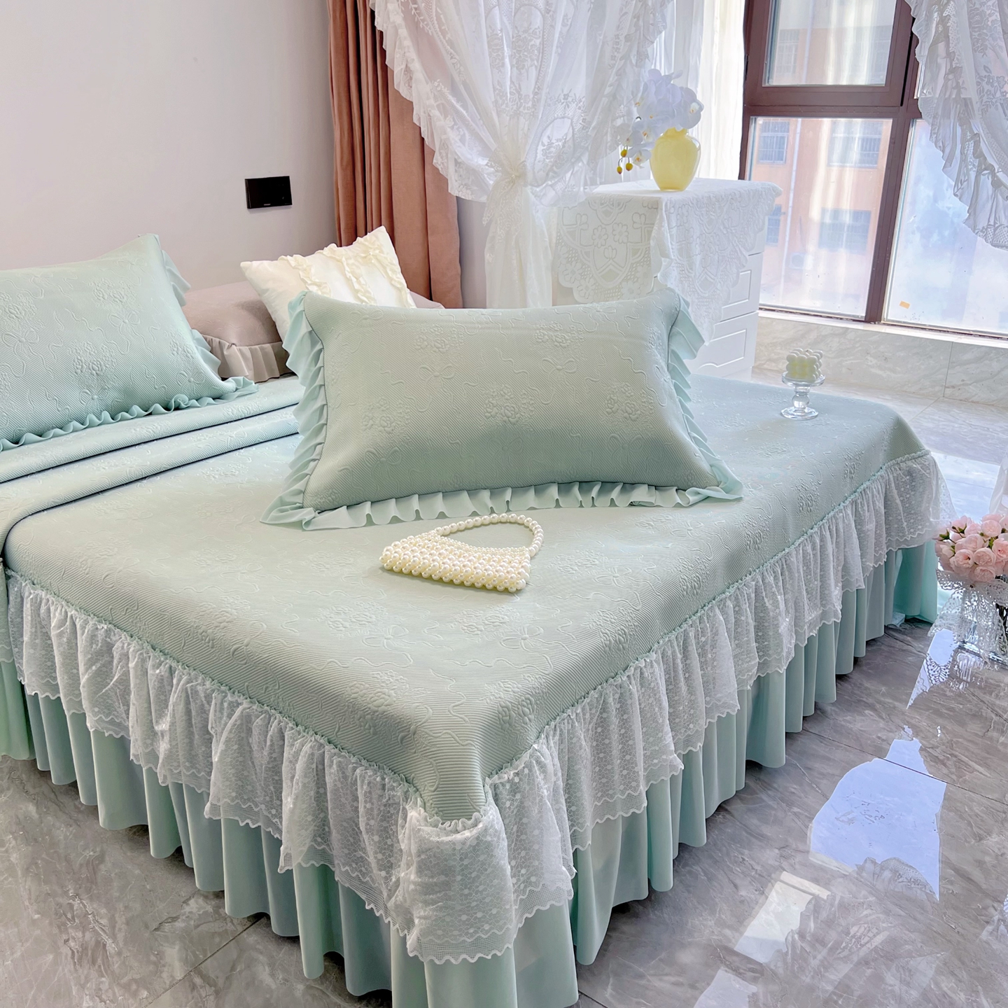 商品名称:恋尚羽 2026新款高分子PE凉泡泡大床裙凉感席波浪冰豆豆凉席席子三件套-蝴蝶结系列手捧花 绿色