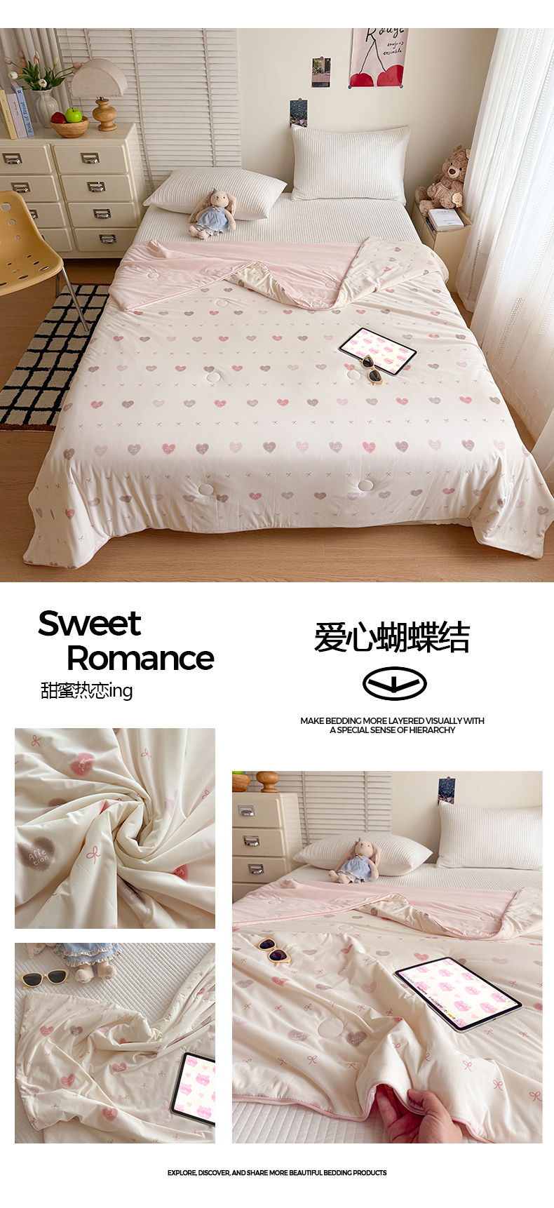 商品名称:吾欢心 2026新款仿锦安高克重凉感丝(含氨纶)夏凉被冰激凌空调被凉感小冰皮夏被 爱心蝴蝶结