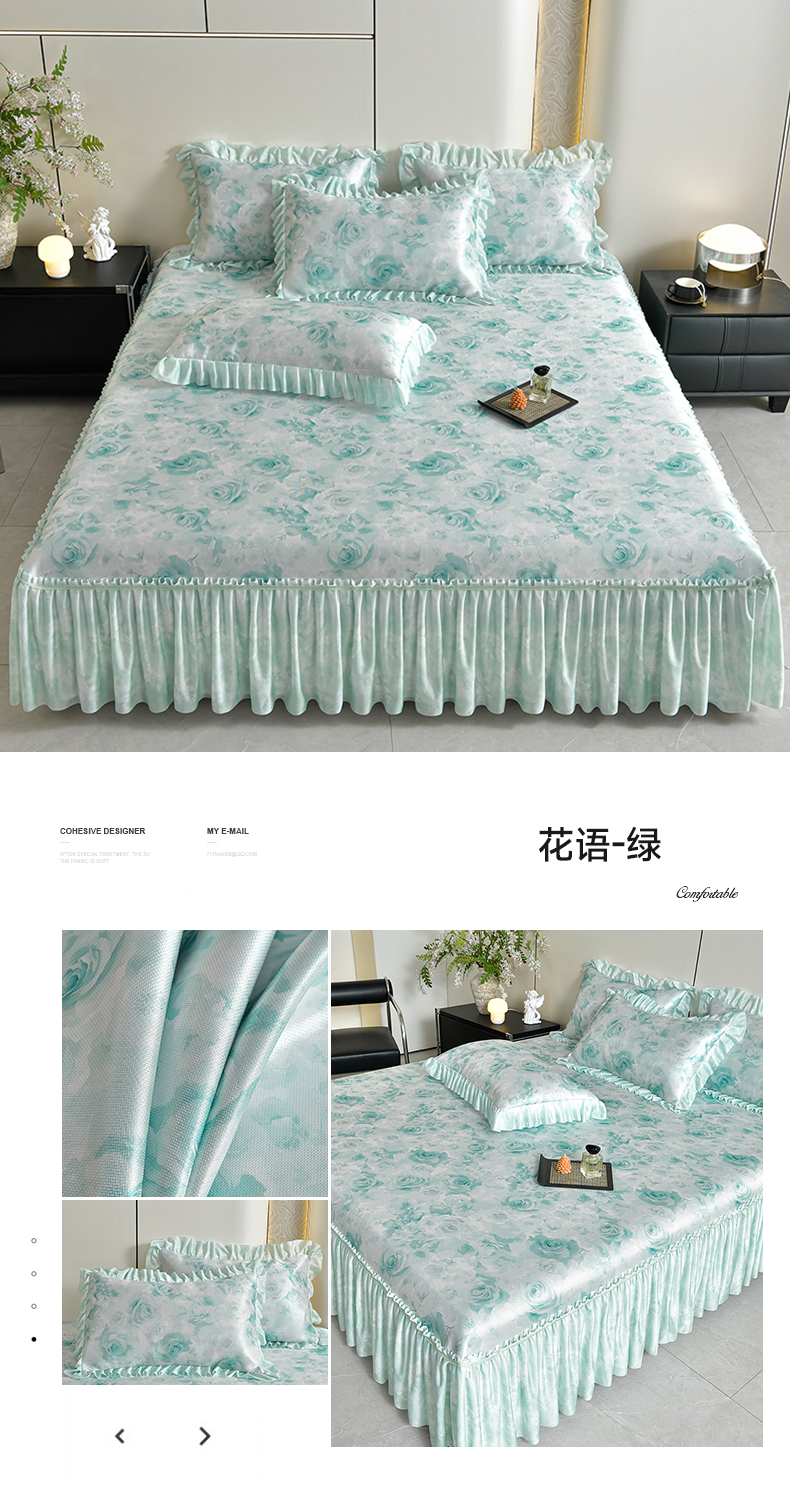 商品名称:梦之星 2026新款豆豆冰丝软凉席印花复合床裙款三件套 花语-绿