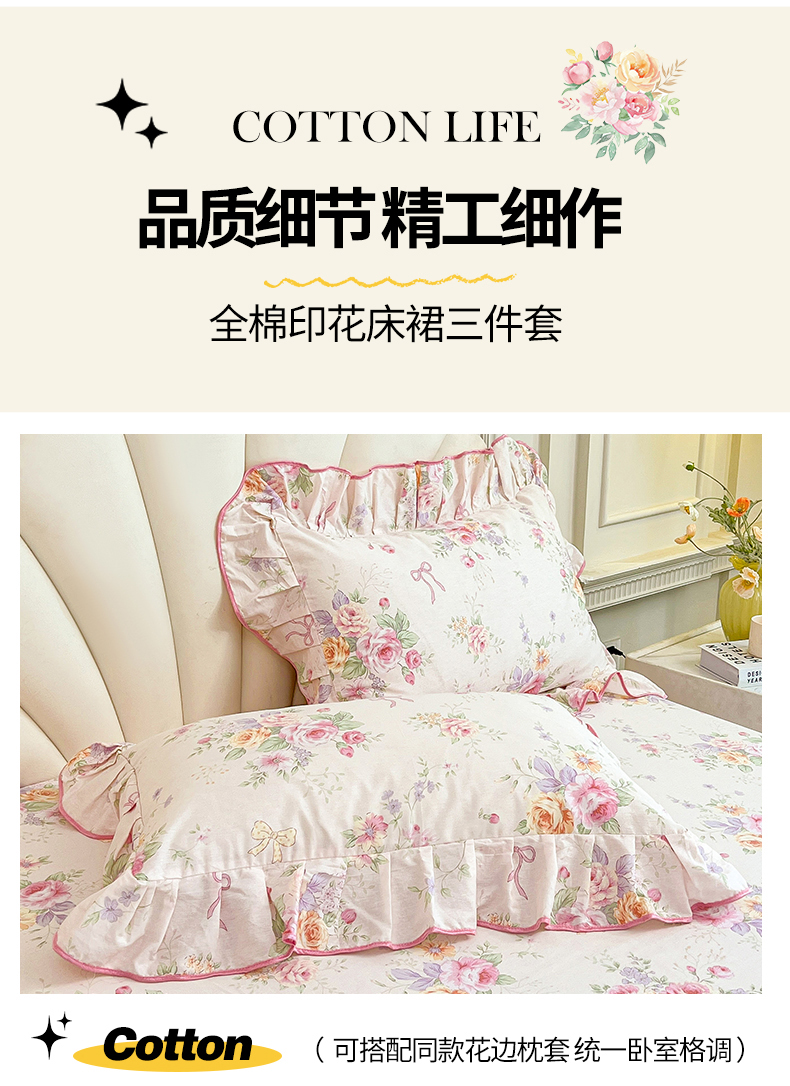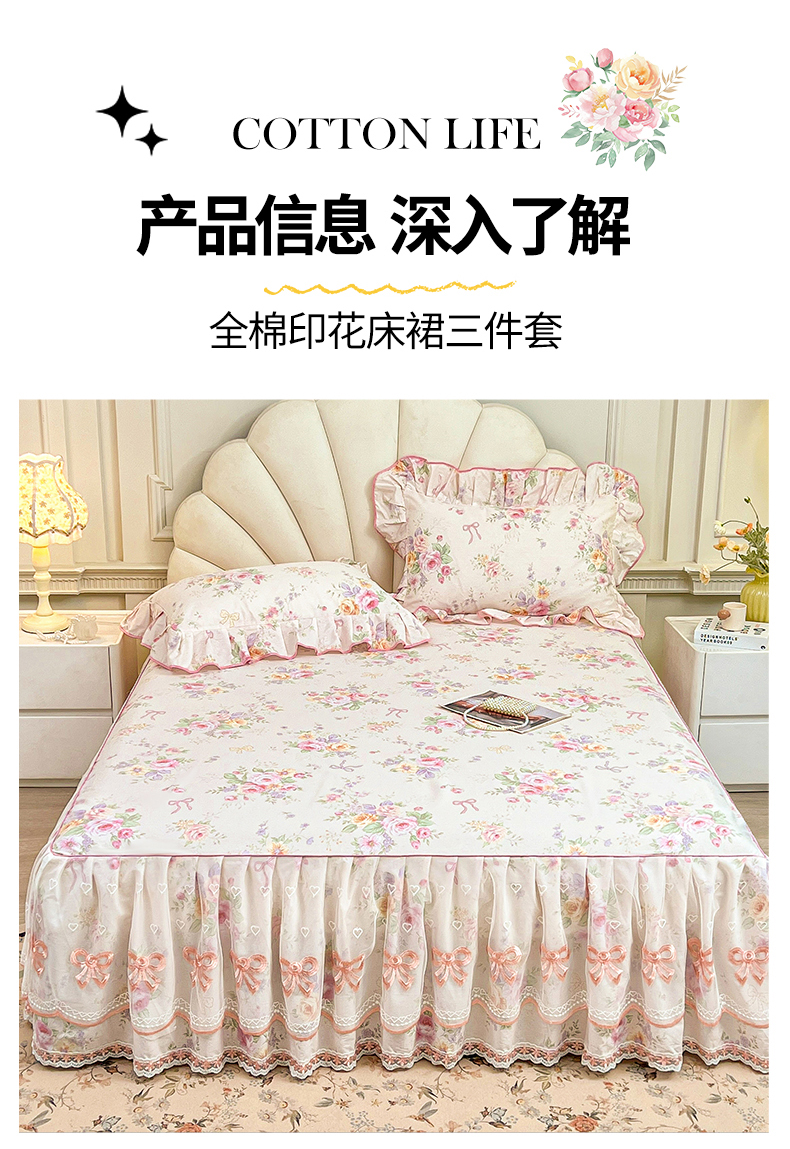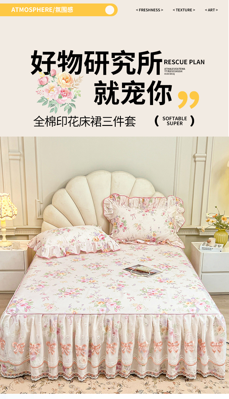 • 91家纺网 家纺一手货源 找家纺 (总)宜凡家纺 2026新款全棉印花公主风夹棉床裙三件套,海棠之恋,镜花映月,水苏栀清,玉容昭婉