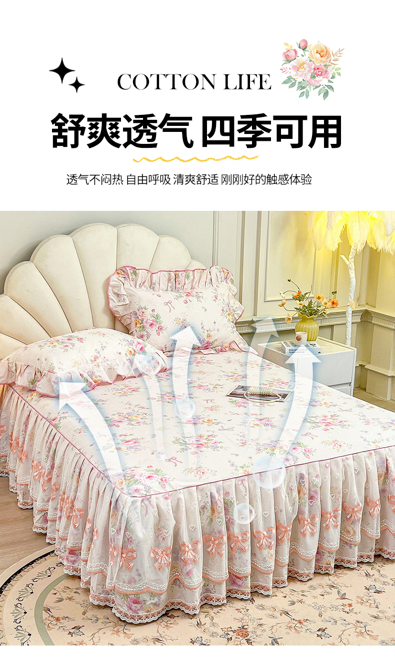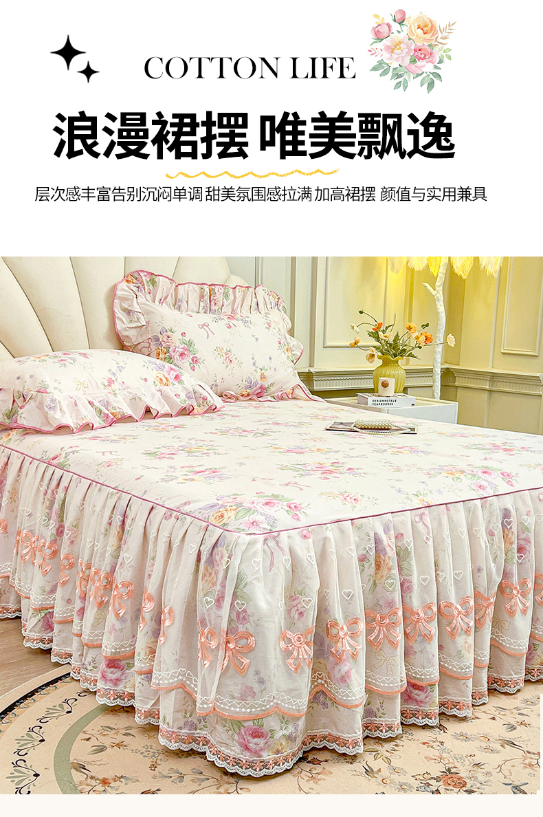 (总)宜凡家纺 2026新款全棉公主风单层床裙三件套,海棠之恋,镜花映月,水苏栀清,玉容昭婉