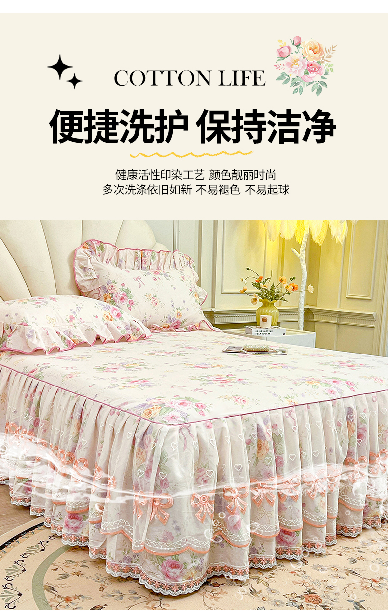 • 91家纺网 家纺一手货源 找家纺 宜凡家纺 2026新款全棉公主风单层床裙三件套 玉容昭婉