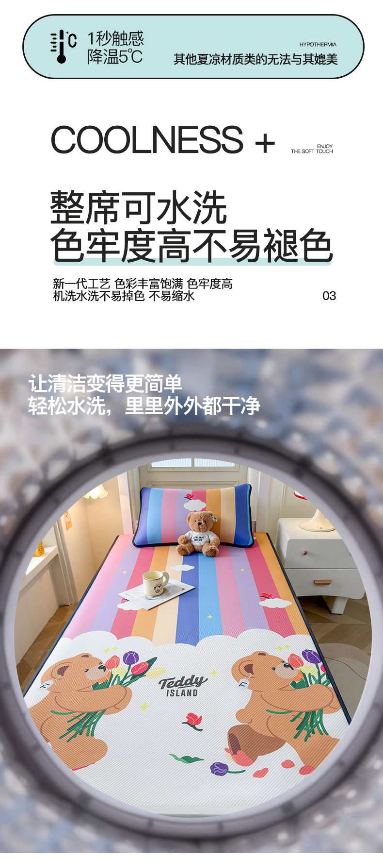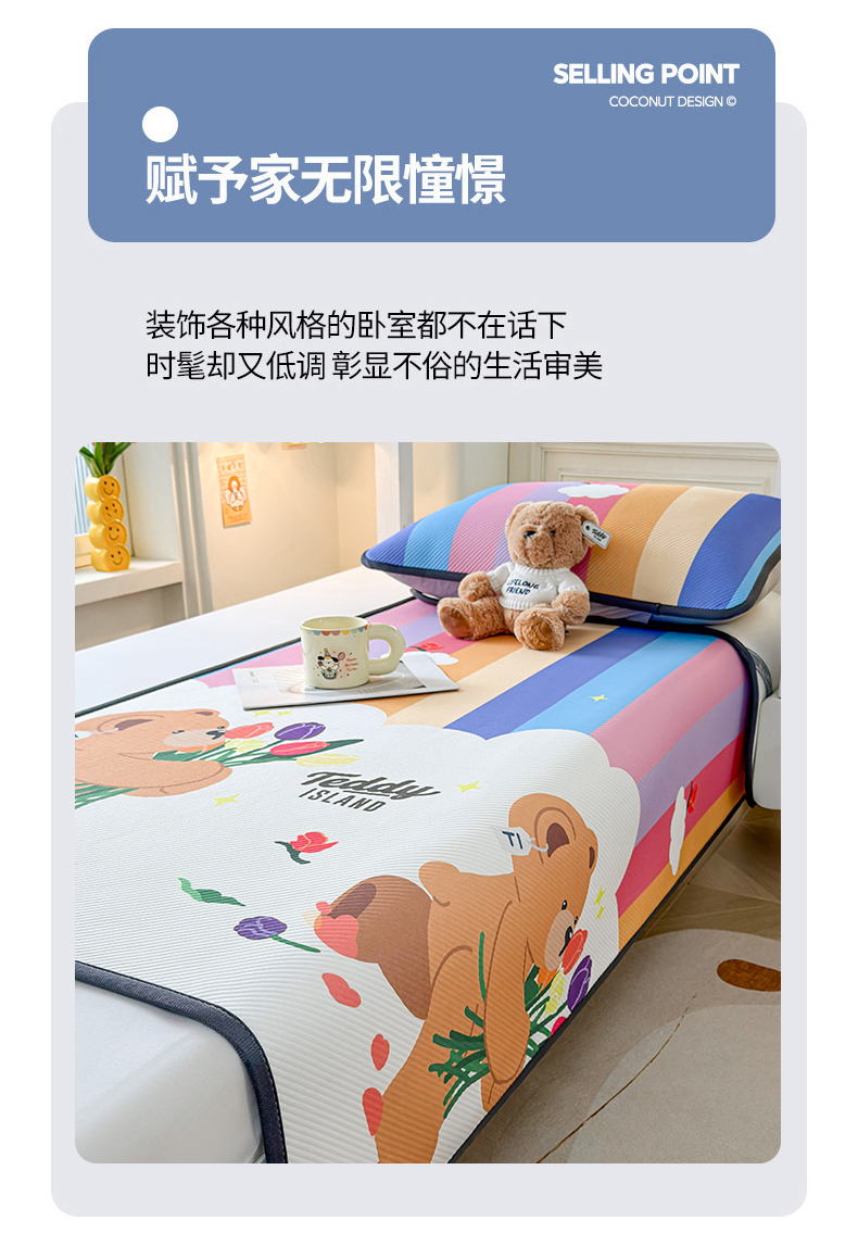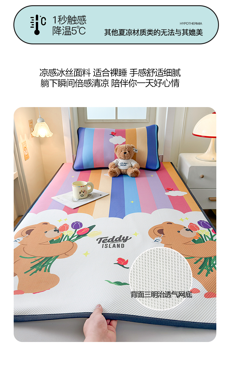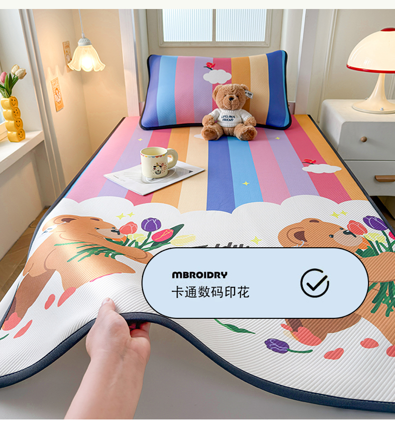 当前位置: 91家纺网 > 商品网购 > 床上用品 > 凉席 > 凉席套件 > 慕木家纺 2026新款A类三明治复合冰丝席泰迪爱兰系列学生款(正版授权)(提供买家秀) 泰迪彩虹