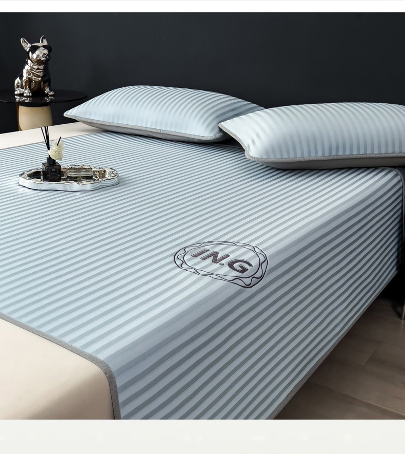 印季家纺 2026新款刺绣冰感条纹全锦凉席席子三件套 冰川蓝-床笠款