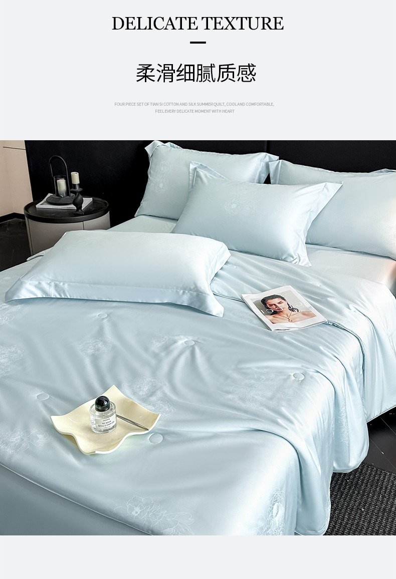 (总)新方向 2026A类20%蚕丝提花天丝棉夏被四件套 65%60s兰精天丝 35%100支长绒棉-花影风格二,花影-山茶粉,花影-微光蓝