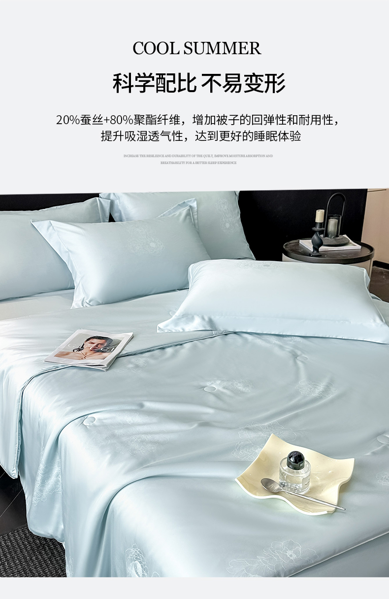 当前位置: 91家纺网 > 商品网购 > 被子 > 夏被 > 新方向 2026年提花A类20%蚕丝天丝棉夏被四件套 花影-微光蓝