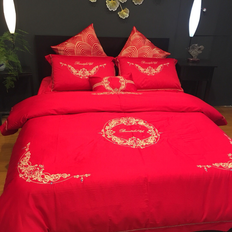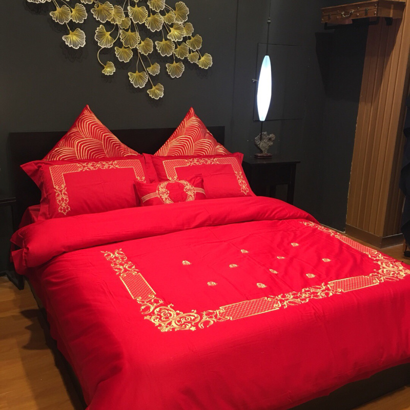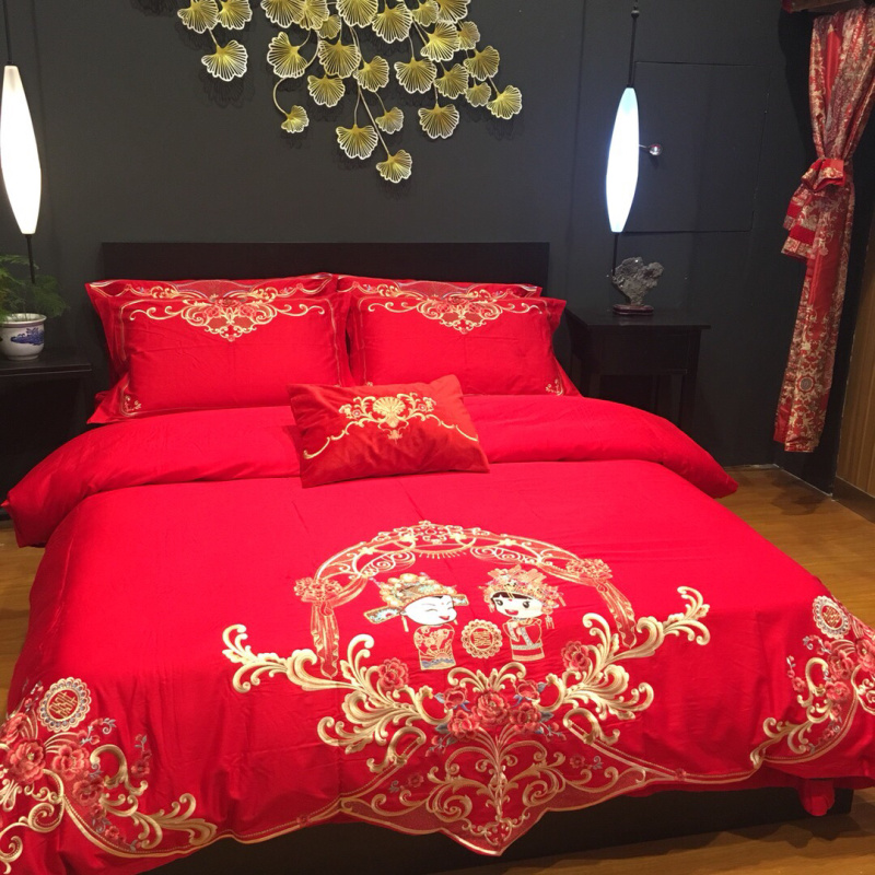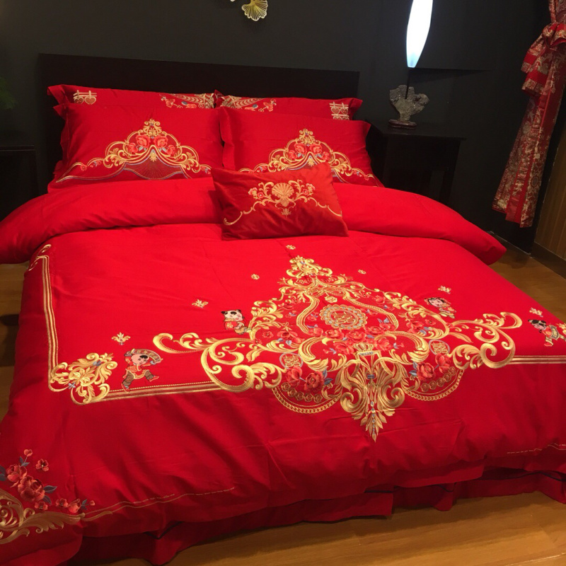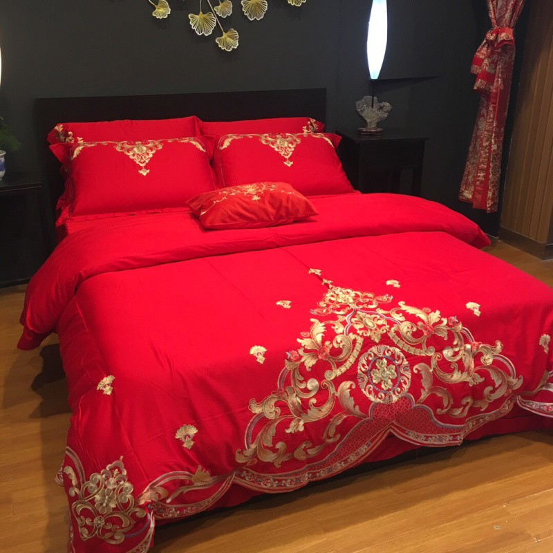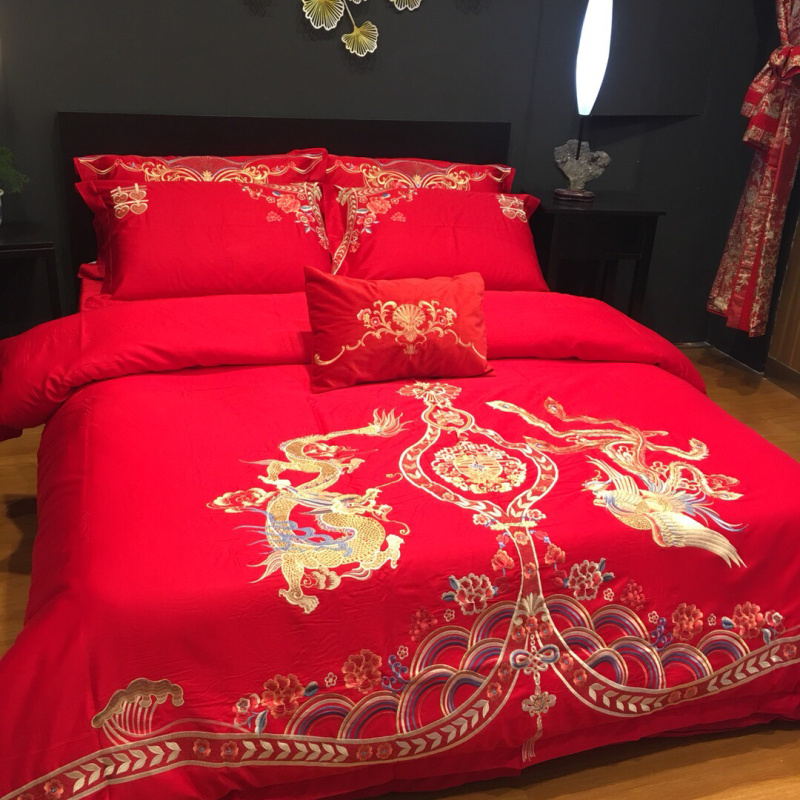 总玖玖爱家纺 新款轻奢风120支贡缎长绒棉高精密刺绣婚嫁系列四件套,欢喜人家,吉祥如意,金色婚典,情定一生,喜迎龙凤