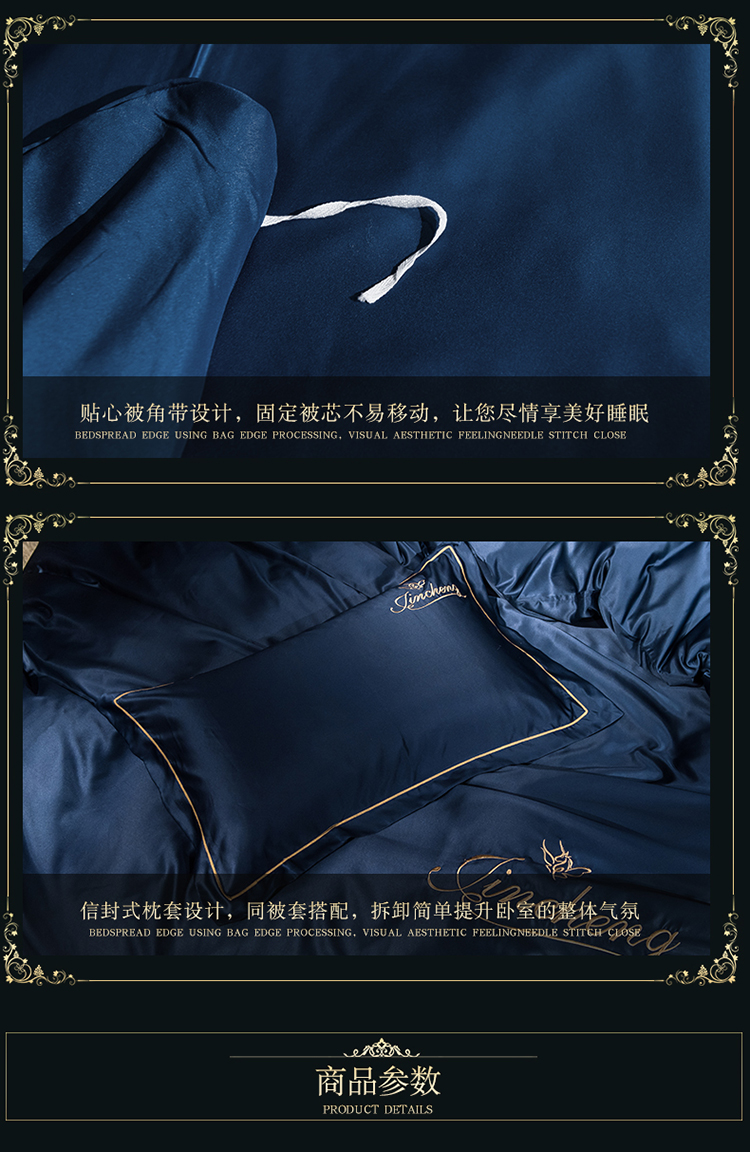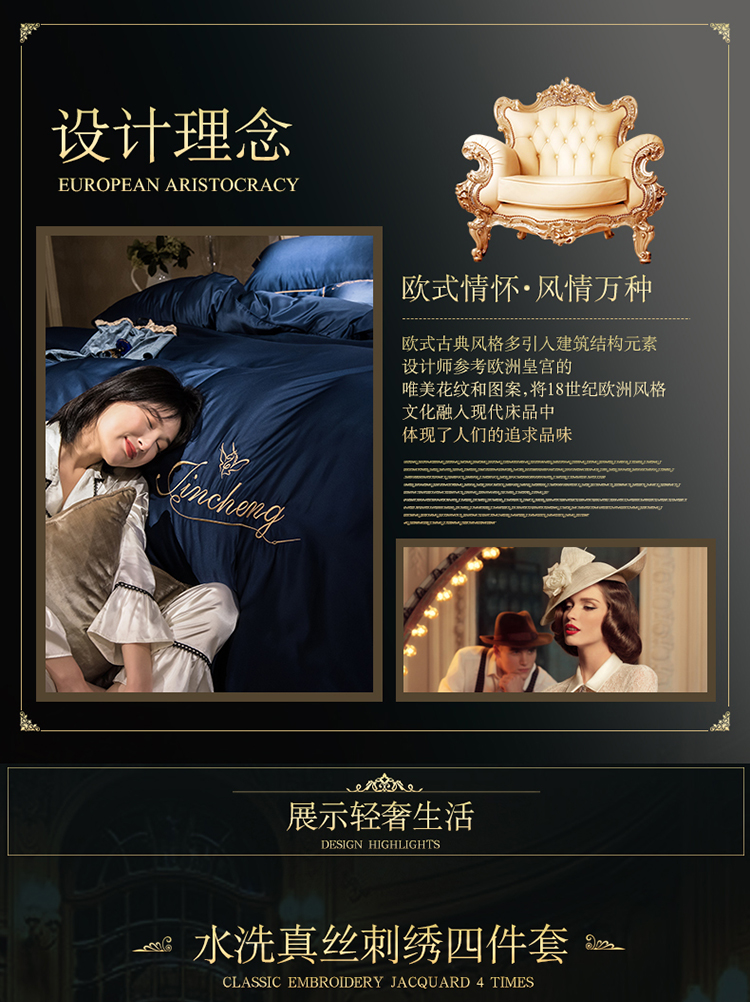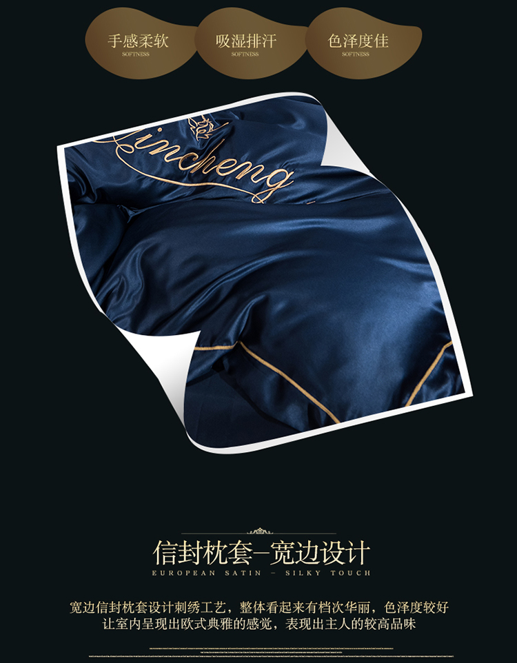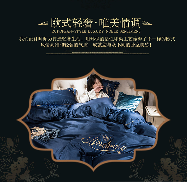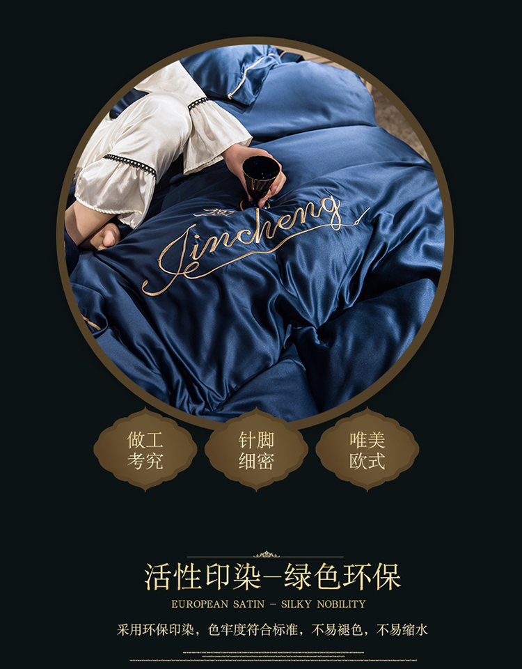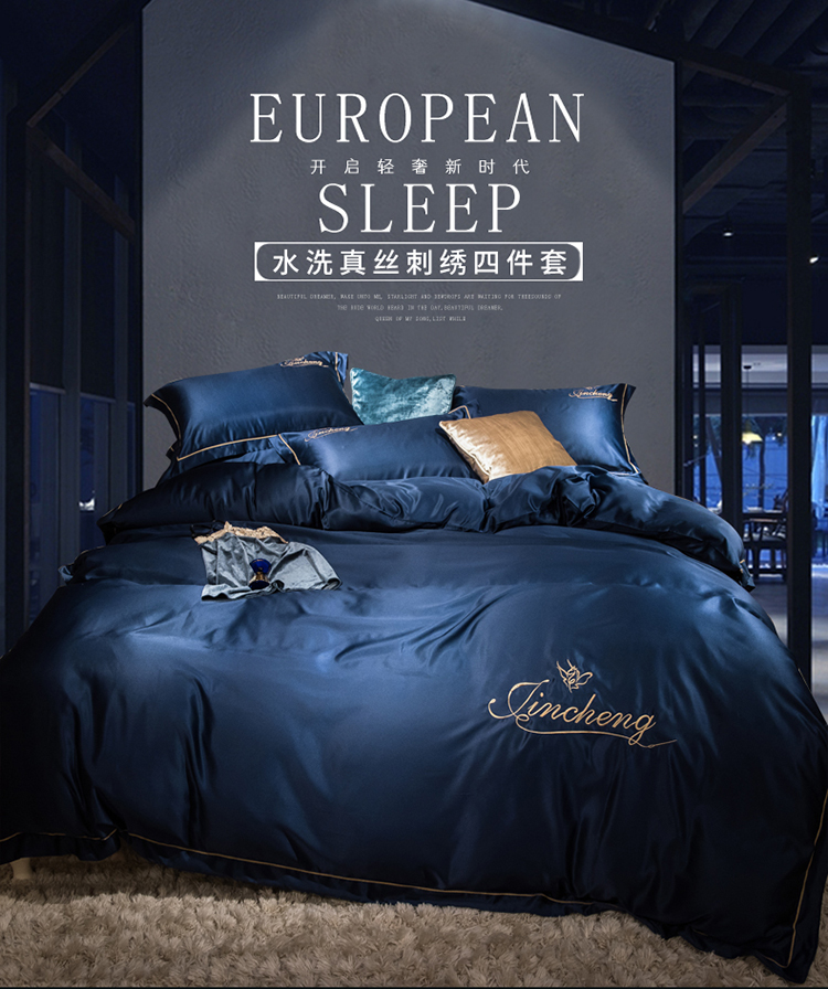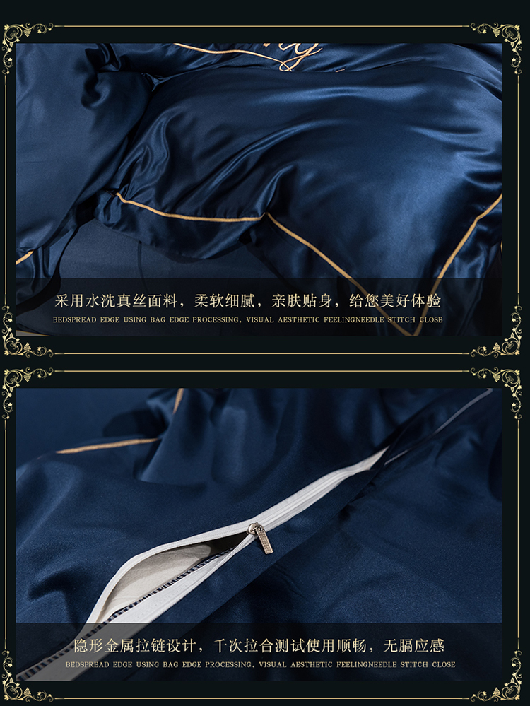 苹果星家纺 2019水洗真丝刺绣四件套 墨蓝