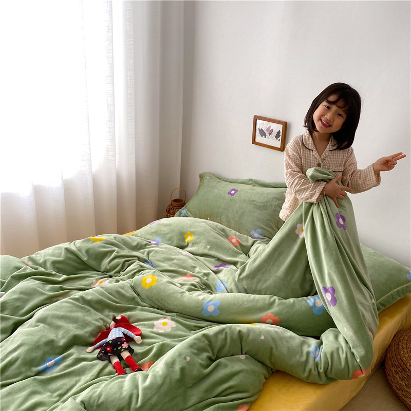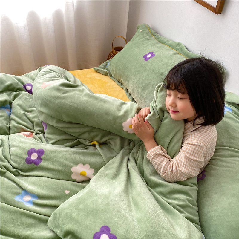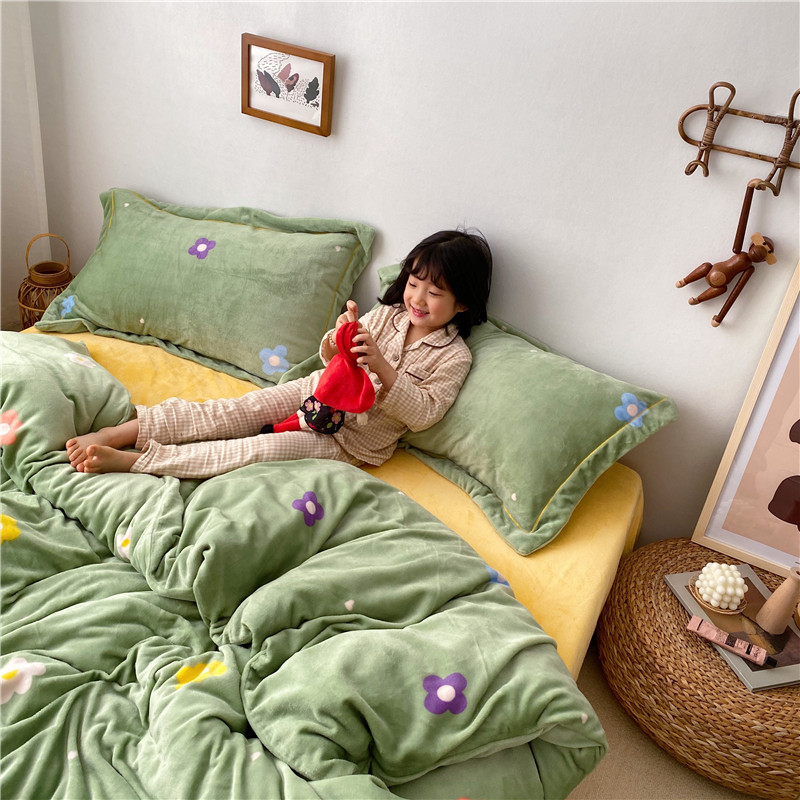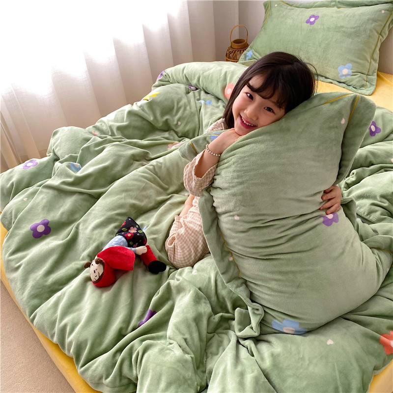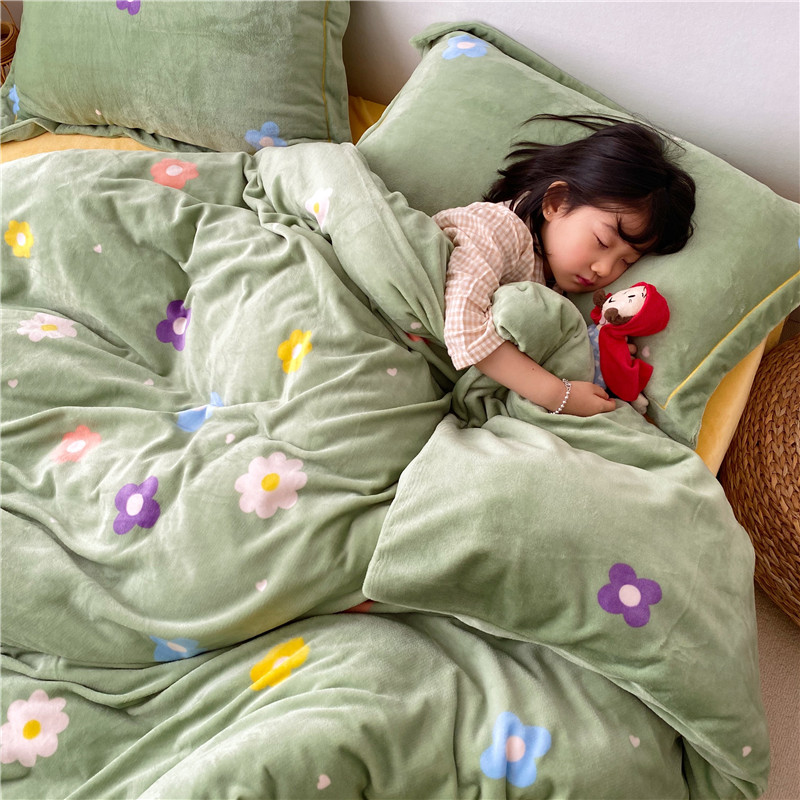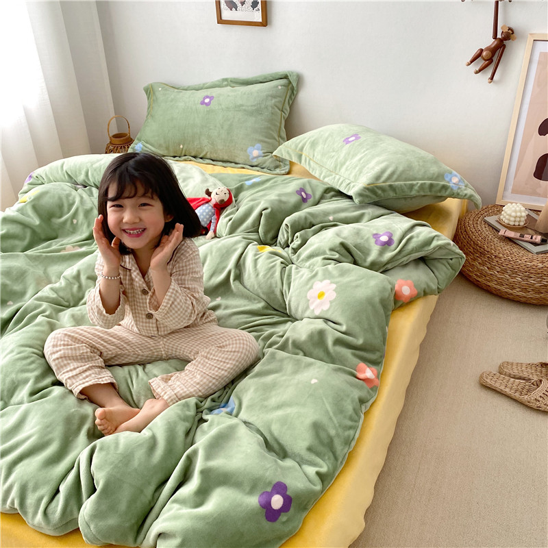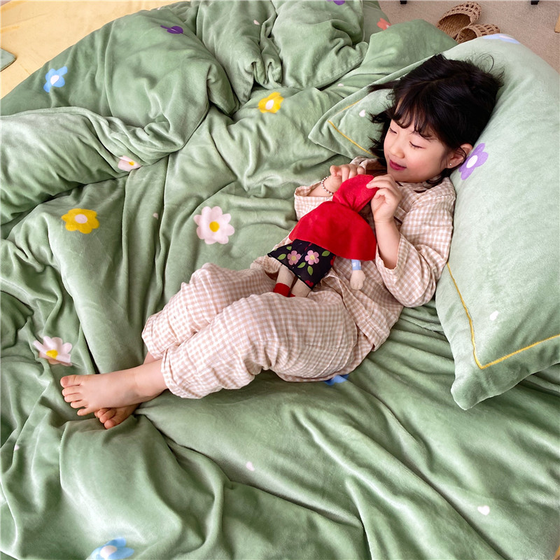 商品名称:时年 2019牛奶绒印花保暖四件套童模图 小花花绿