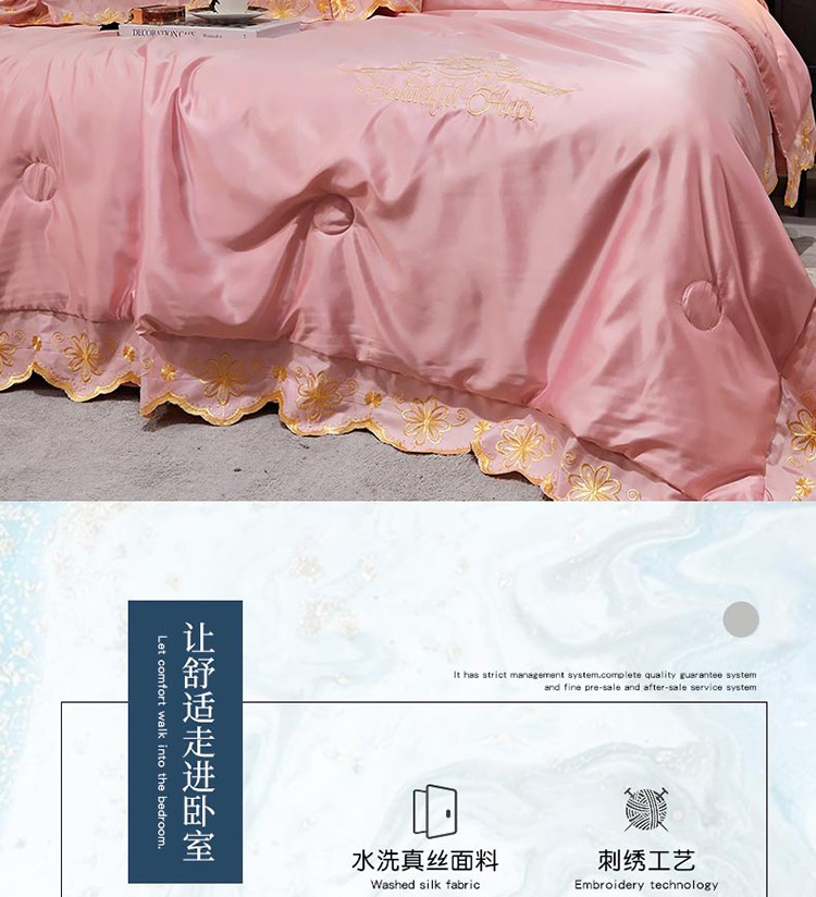 • 91家纺网 家纺一手货源 找家纺 铠畅 纳威水洗真丝夏被空调被四件套春夏刺绣床单款天丝夏凉被套件 粉色
