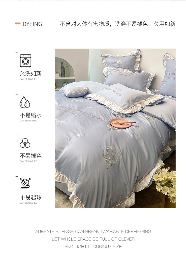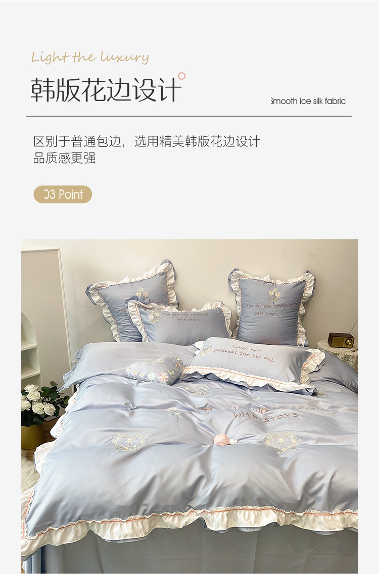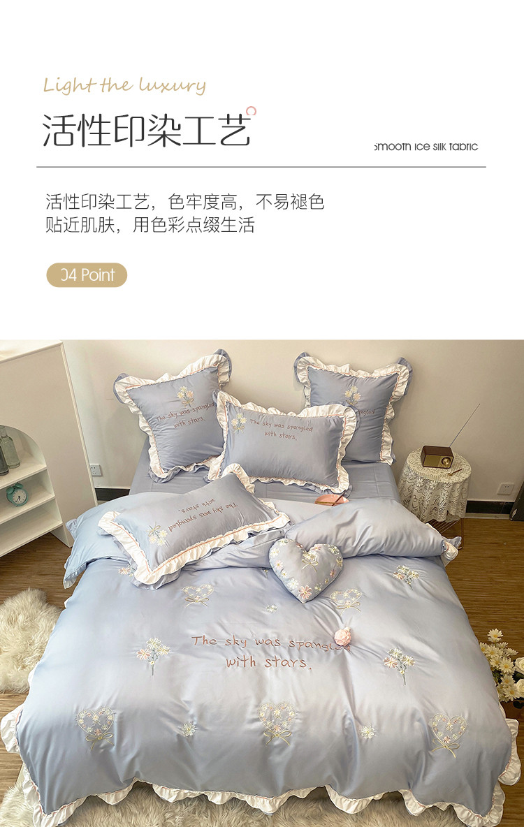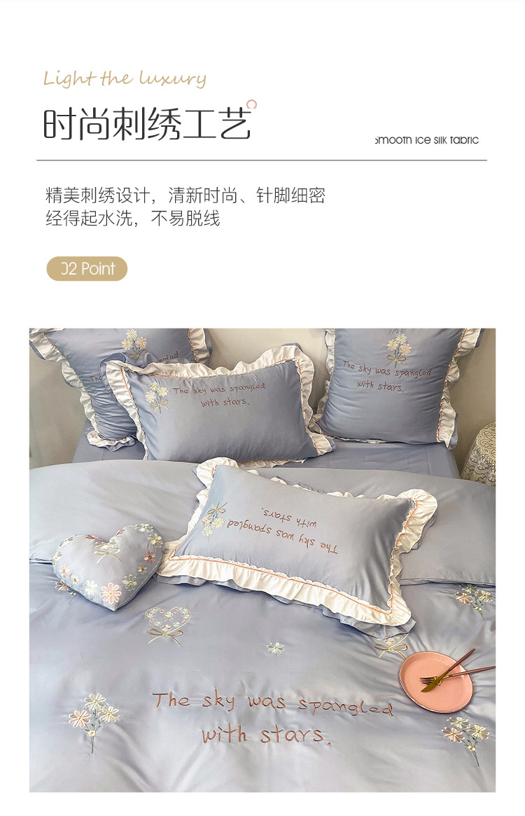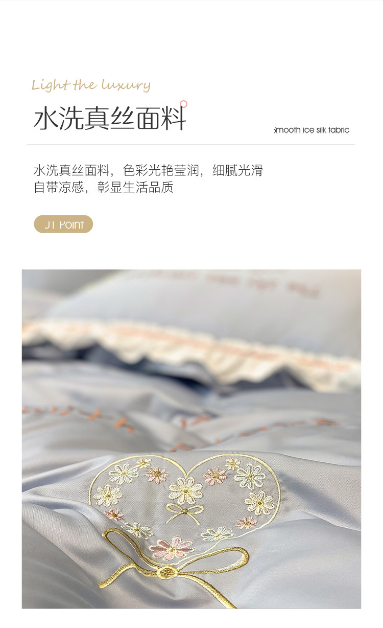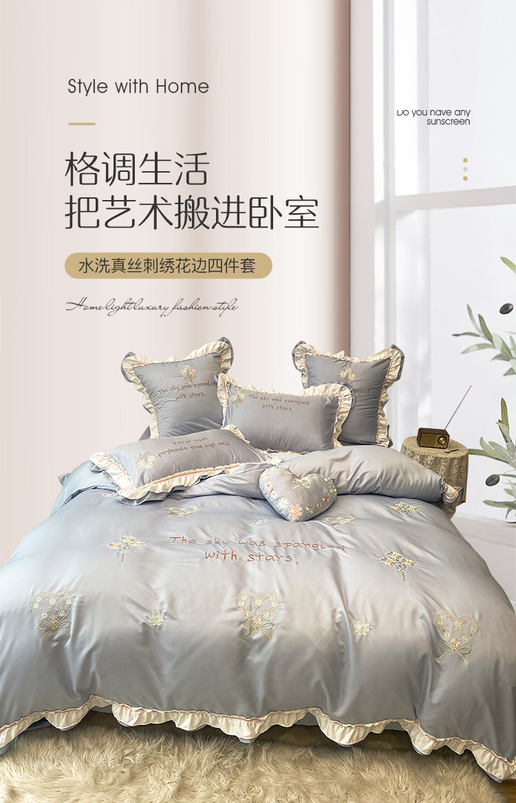 商品名称:理想家 2021新款春日水洗真丝刺绣花边四件套 灰蓝