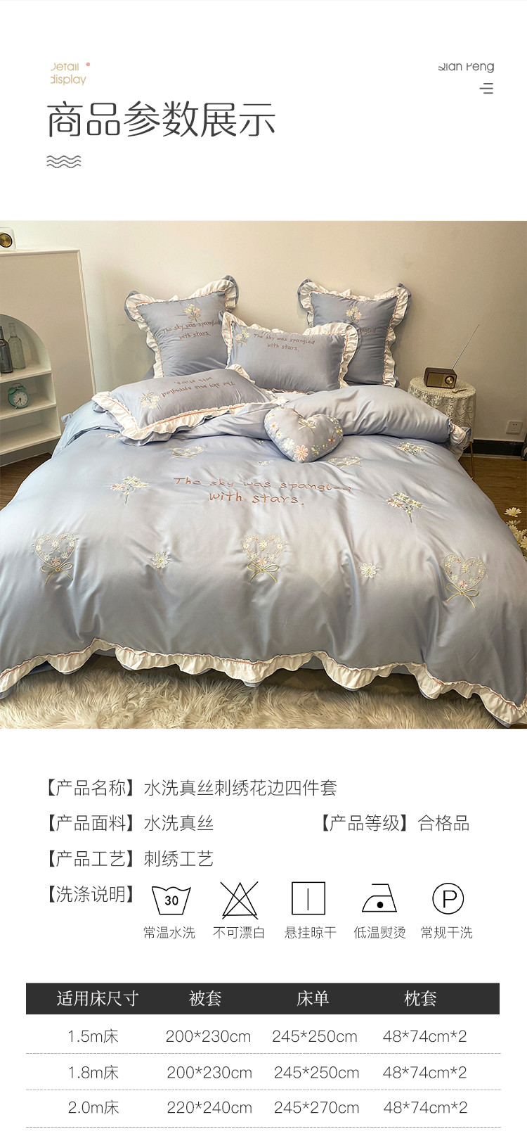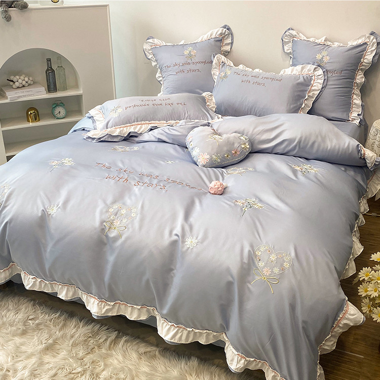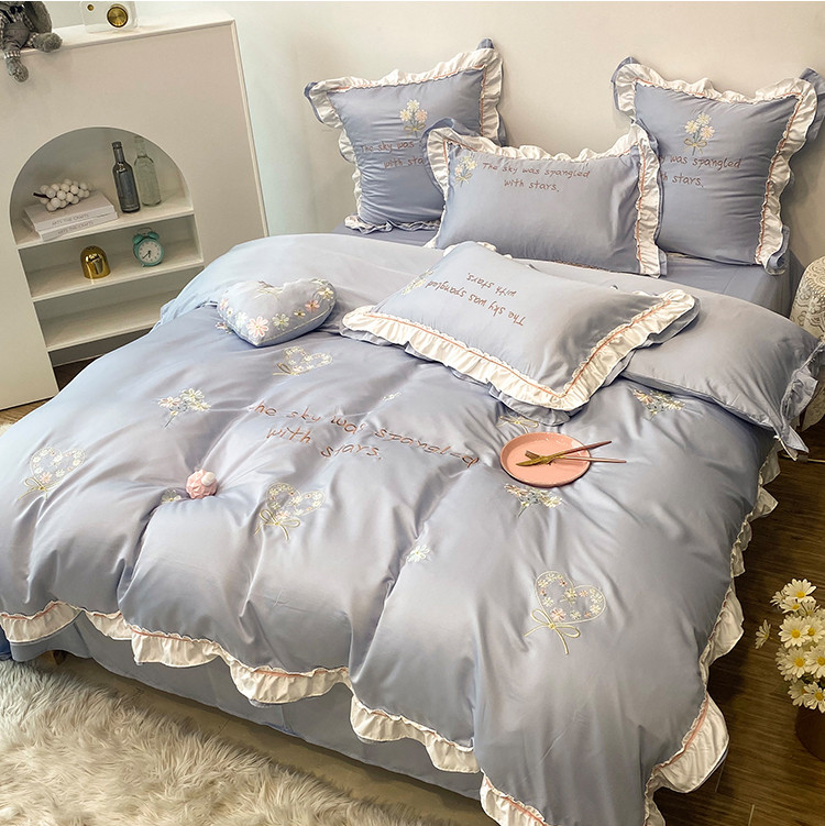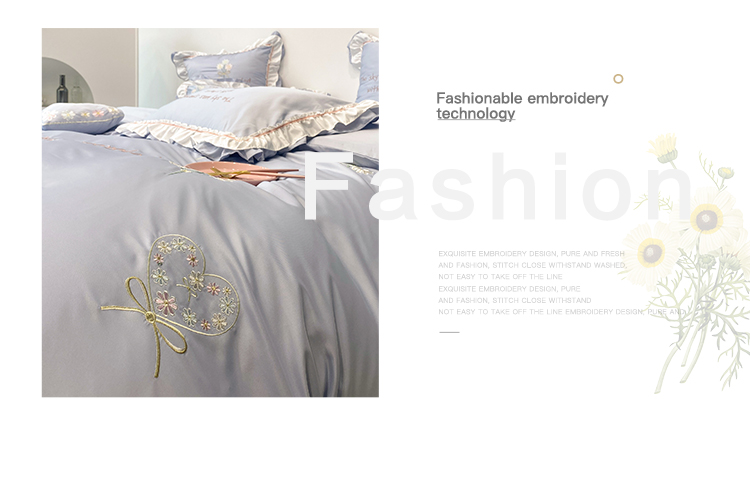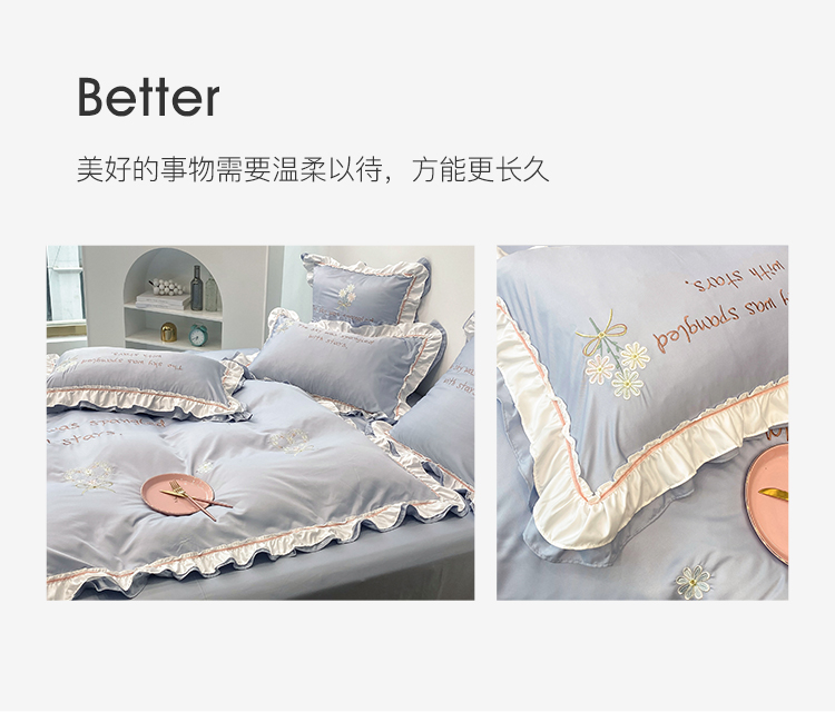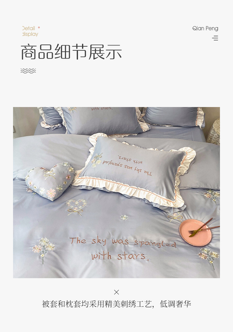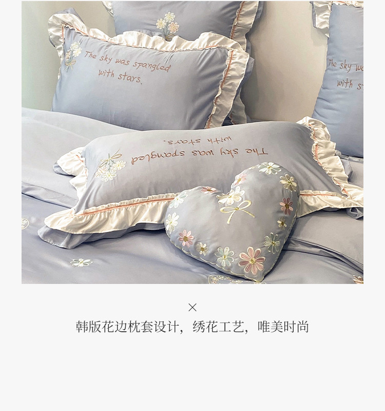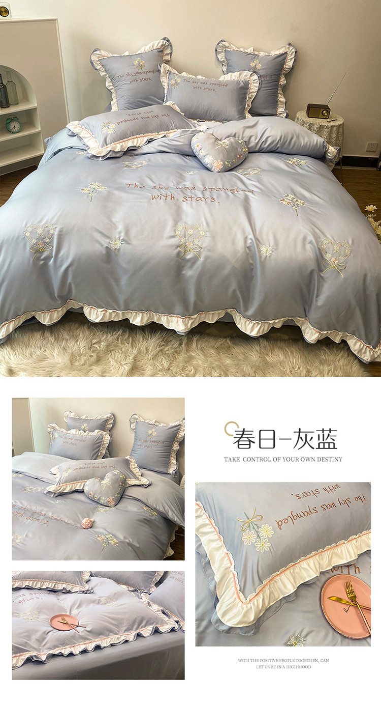 商品名称:理想家 2021新款春日水洗真丝刺绣花边四件套 灰蓝